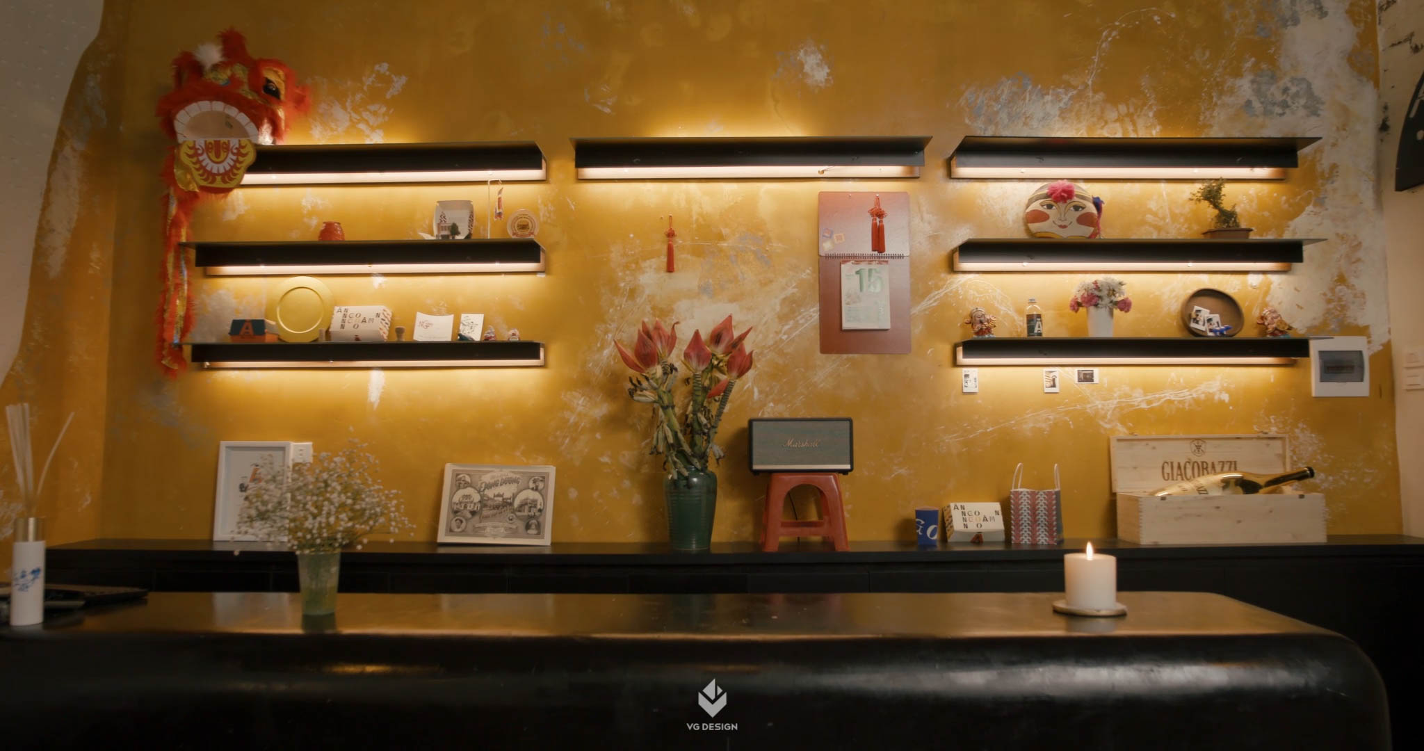 Ngoài ra, một số hạng mục đồ nội thất liên quan trực tiếp tới trải nghiệm khi sinh ra và lớn lên trong lòng Thủ đô của chủ nhà hàng, VG Design đã cùng đội ngũ của Ngoặm thực hiện thủ công, như việc sản xuất ghế, tủ rượu, hiệu ứng sơn hay ánh sáng. Tất cả những chi tiết nhỏ bé hay mộc mạc nhất được thu lượm và chọn lọc để giúp chúng tôi hoàn chỉnh một câu chuyện xuyên suốt cho cả dự án.