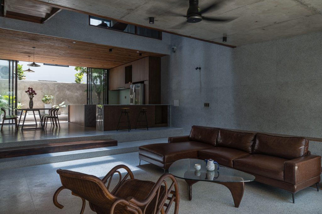 Với kết cấu của sàn đá mài, trần bê tông, gỗ óc chó, v.v… kết hợp với nhau một cách độc đáo tạo thành một không gian ấm áp, tình cảm nhưng vẫn rất sang trọng.