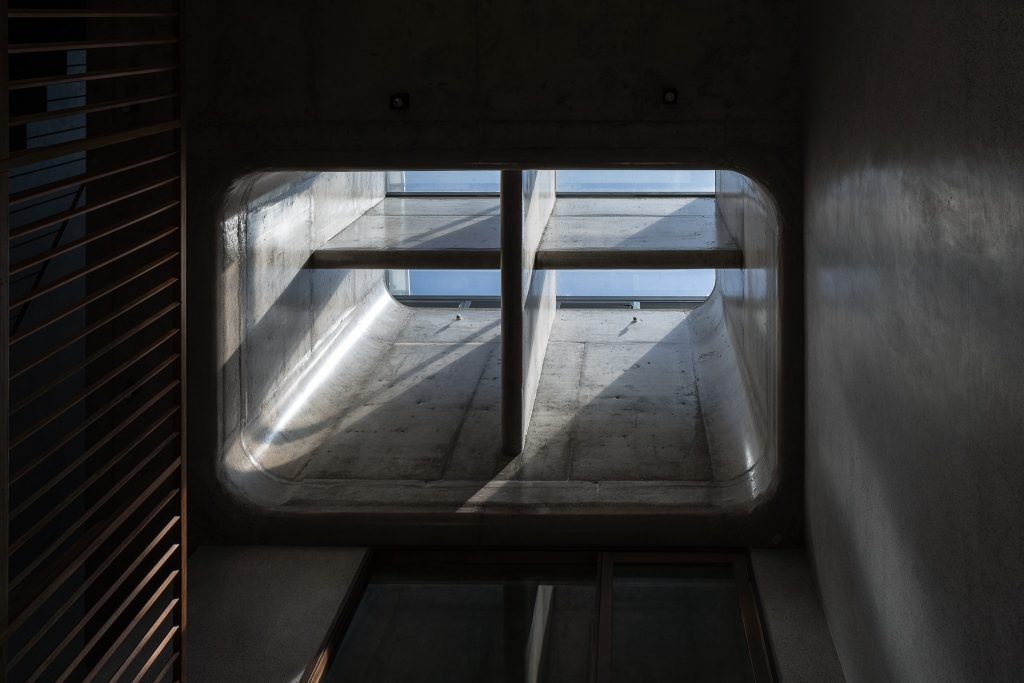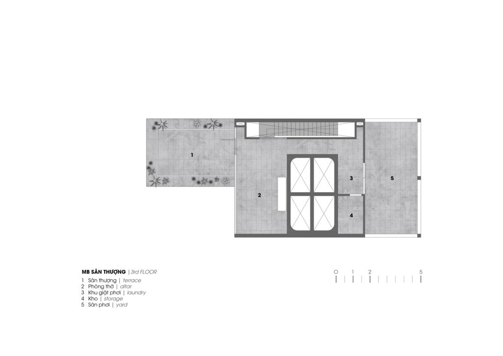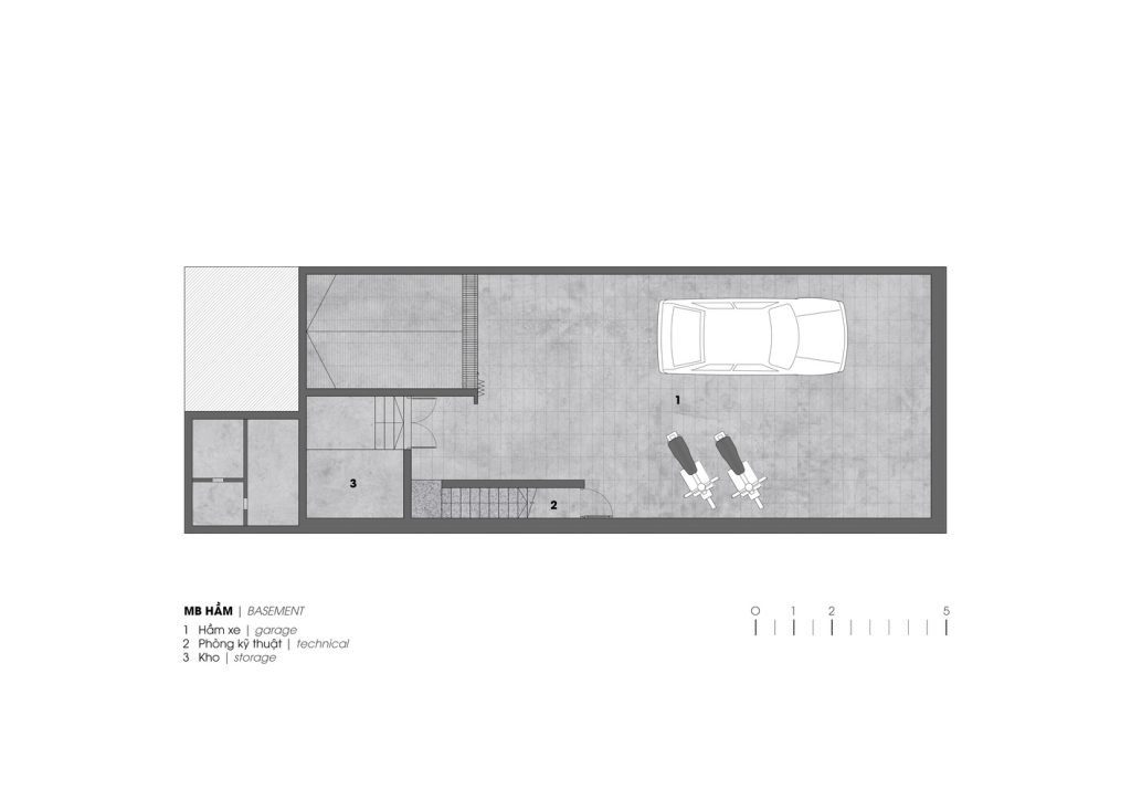 Căn nhà có kết cấu gồm một tầng hầm, một trệt, hai lầu và một sân thượng với công năng gồm gara, phòng khách, bếp và 4 phòng ngủ. Các không gian chức năng được bố trí xung quanh giếng trời lớn.