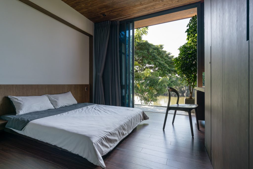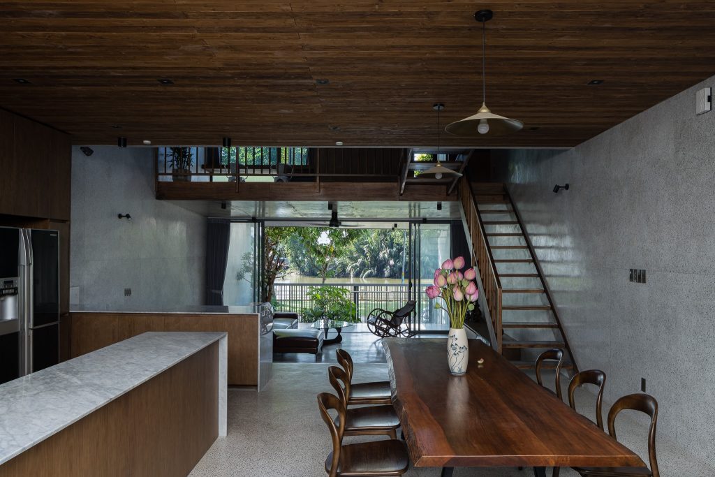 Các không gian chức năng phía trước và sau được kết nối với nhau bằng dãy cầu thang và hành lang bằng gỗ. Do nằm ở hướng Đông Nam nên ngôi nhà tránh được ánh nắng có hại và đón được luồng gió nên các phòng ngủ, bếp, phòng khách đều có hướng nhìn ra sông trước nhà.