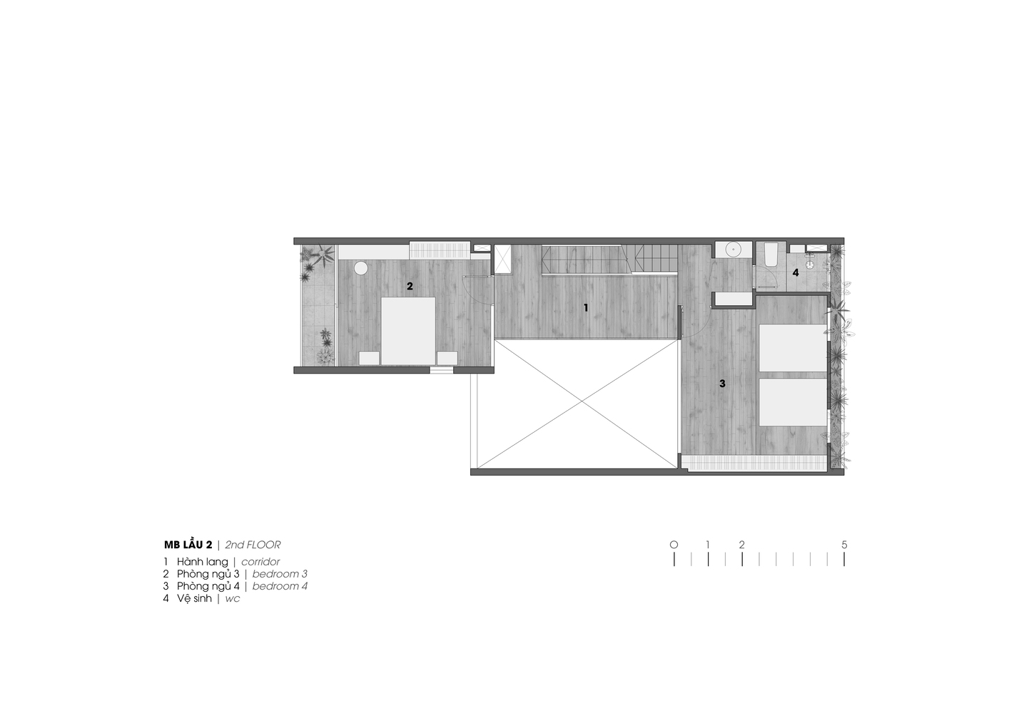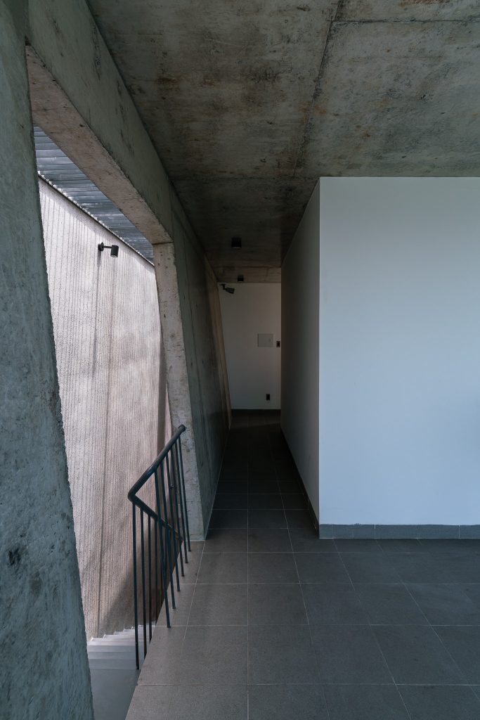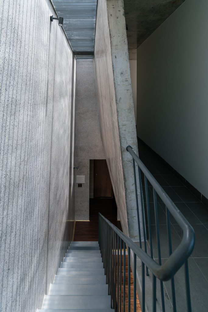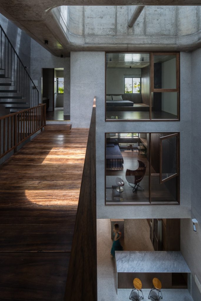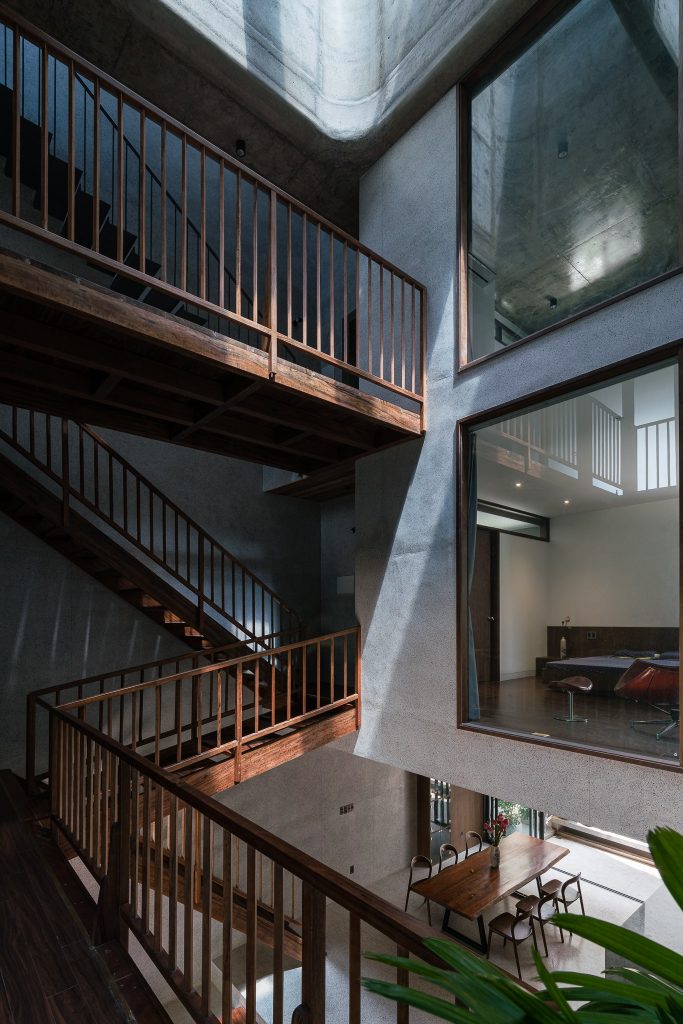 Căn nhà có kết cấu gồm một tầng hầm, một trệt, hai lầu và một sân thượng với công năng gồm gara, phòng khách, bếp và 4 phòng ngủ. Các không gian chức năng được bố trí xung quanh giếng trời lớn.