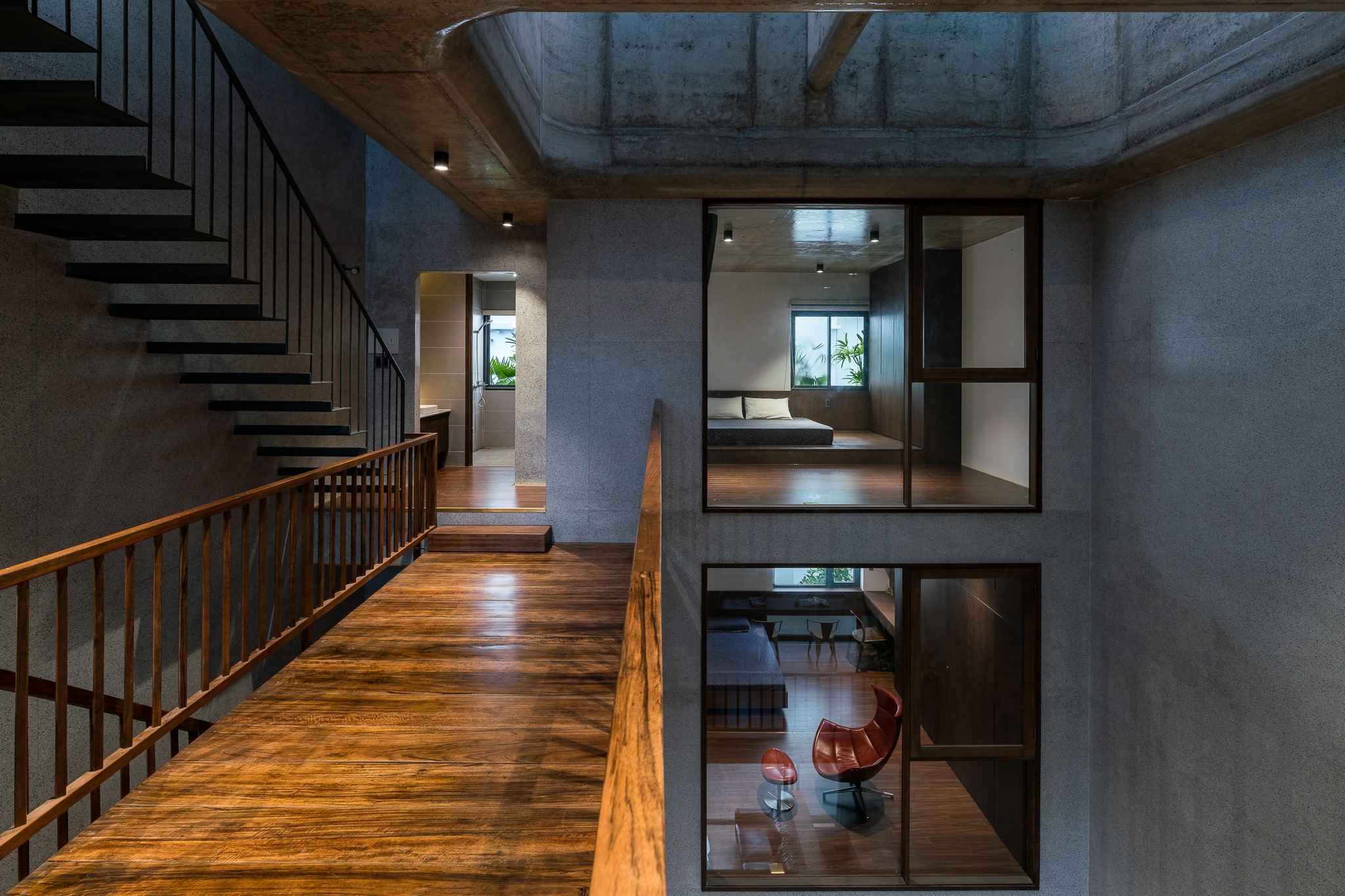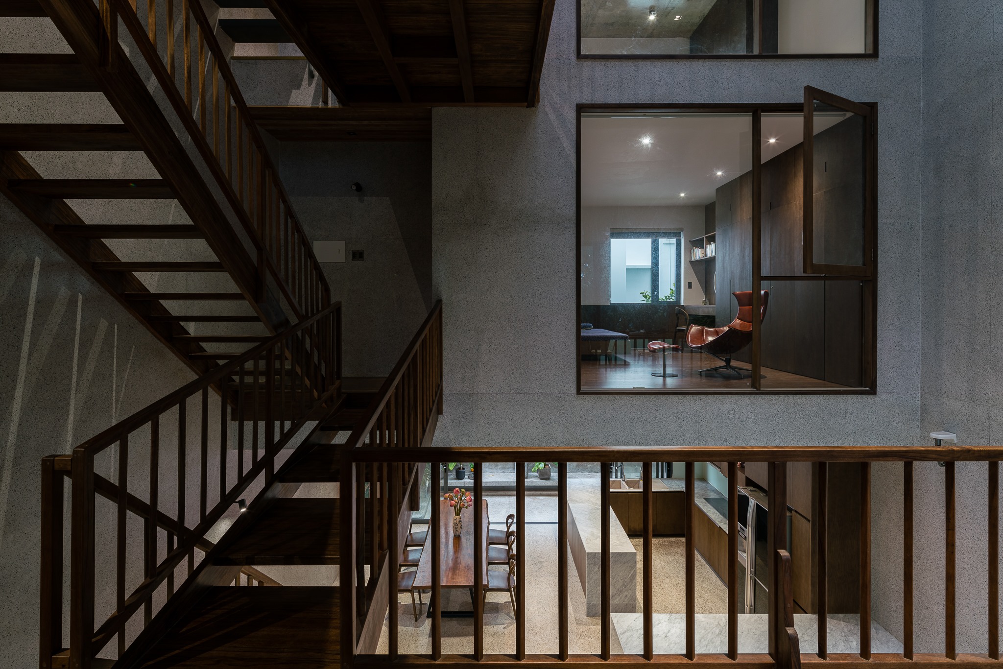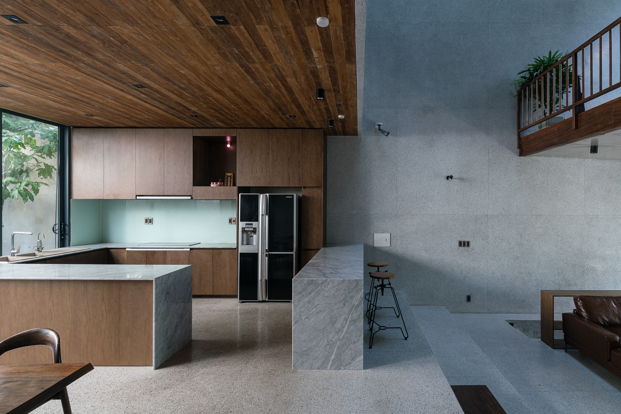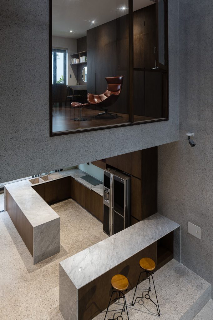 Với kết cấu của sàn đá mài, trần bê tông, gỗ óc chó, v.v… kết hợp với nhau một cách độc đáo tạo thành một không gian ấm áp, tình cảm nhưng vẫn rất sang trọng.