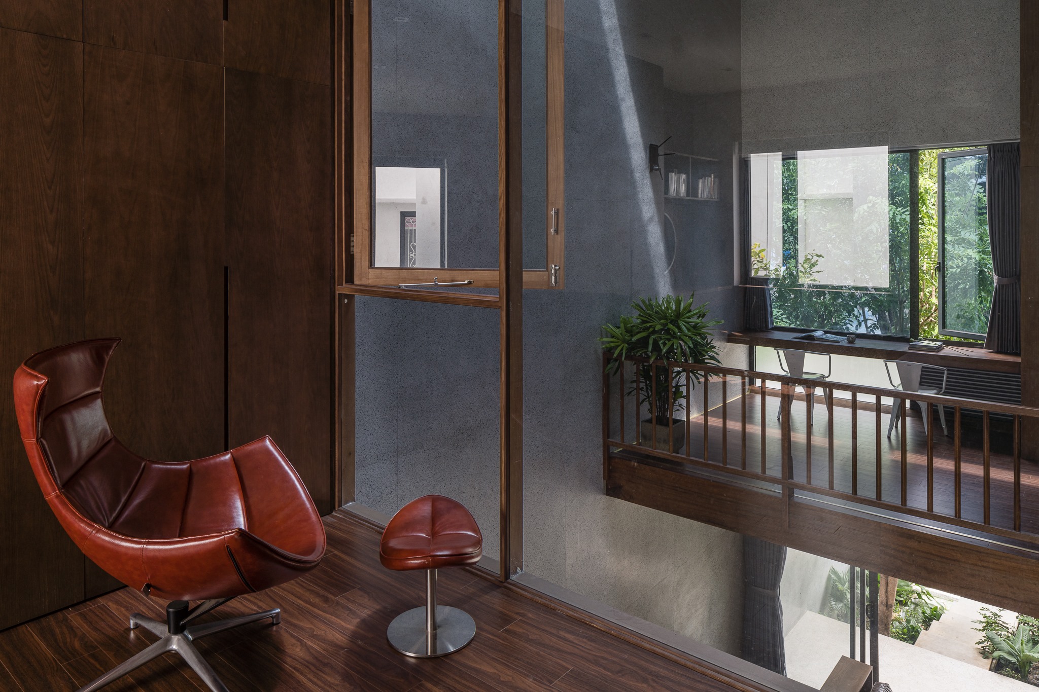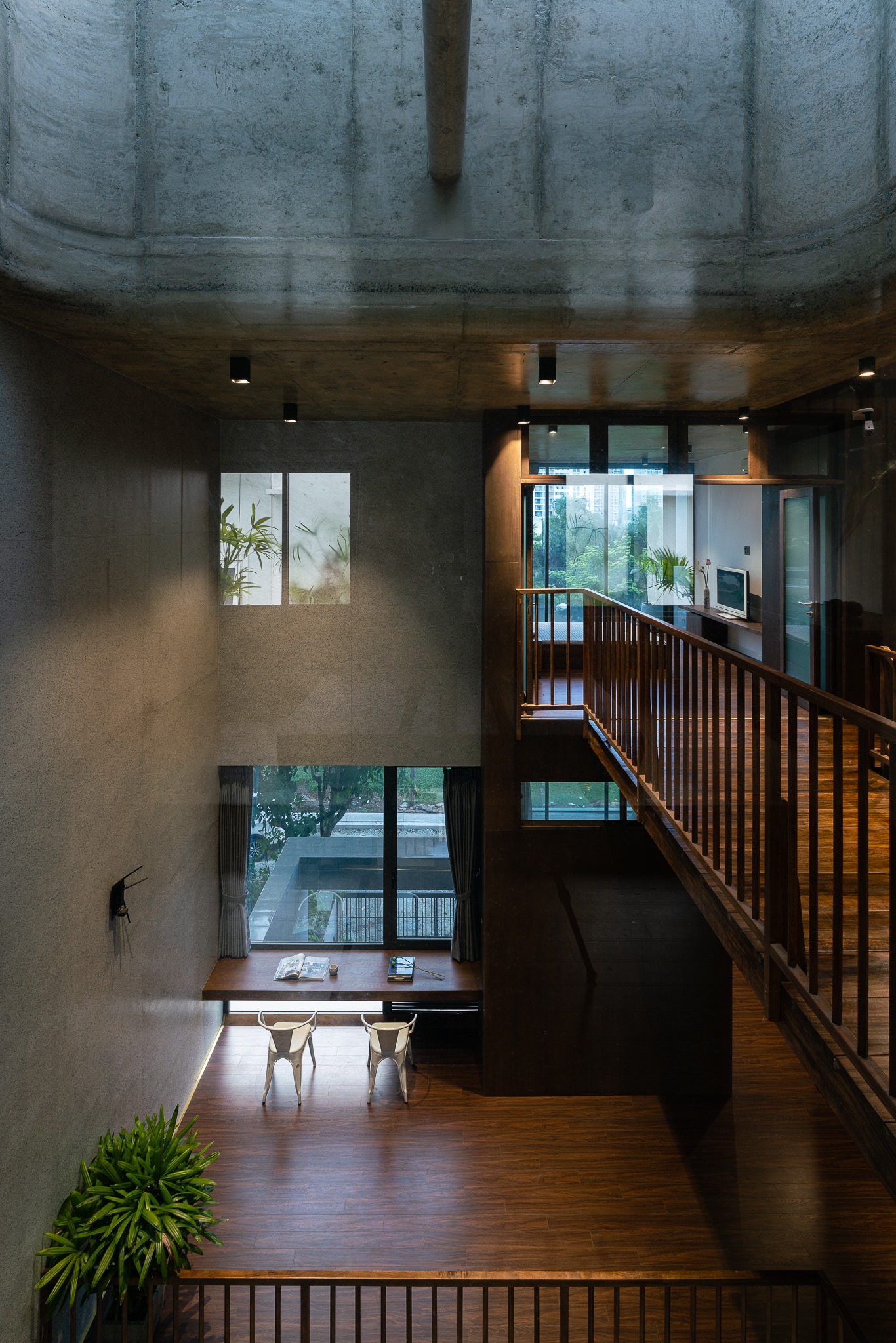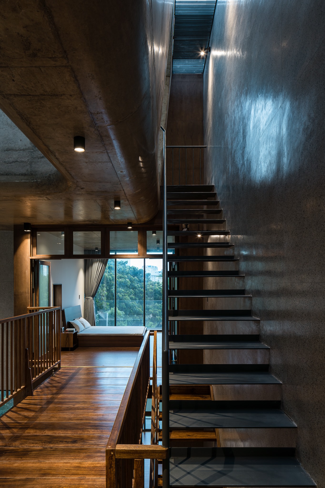Với kết cấu của sàn đá mài, trần bê tông, gỗ óc chó, v.v… kết hợp với nhau một cách độc đáo tạo thành một không gian ấm áp, tình cảm nhưng vẫn rất sang trọng.