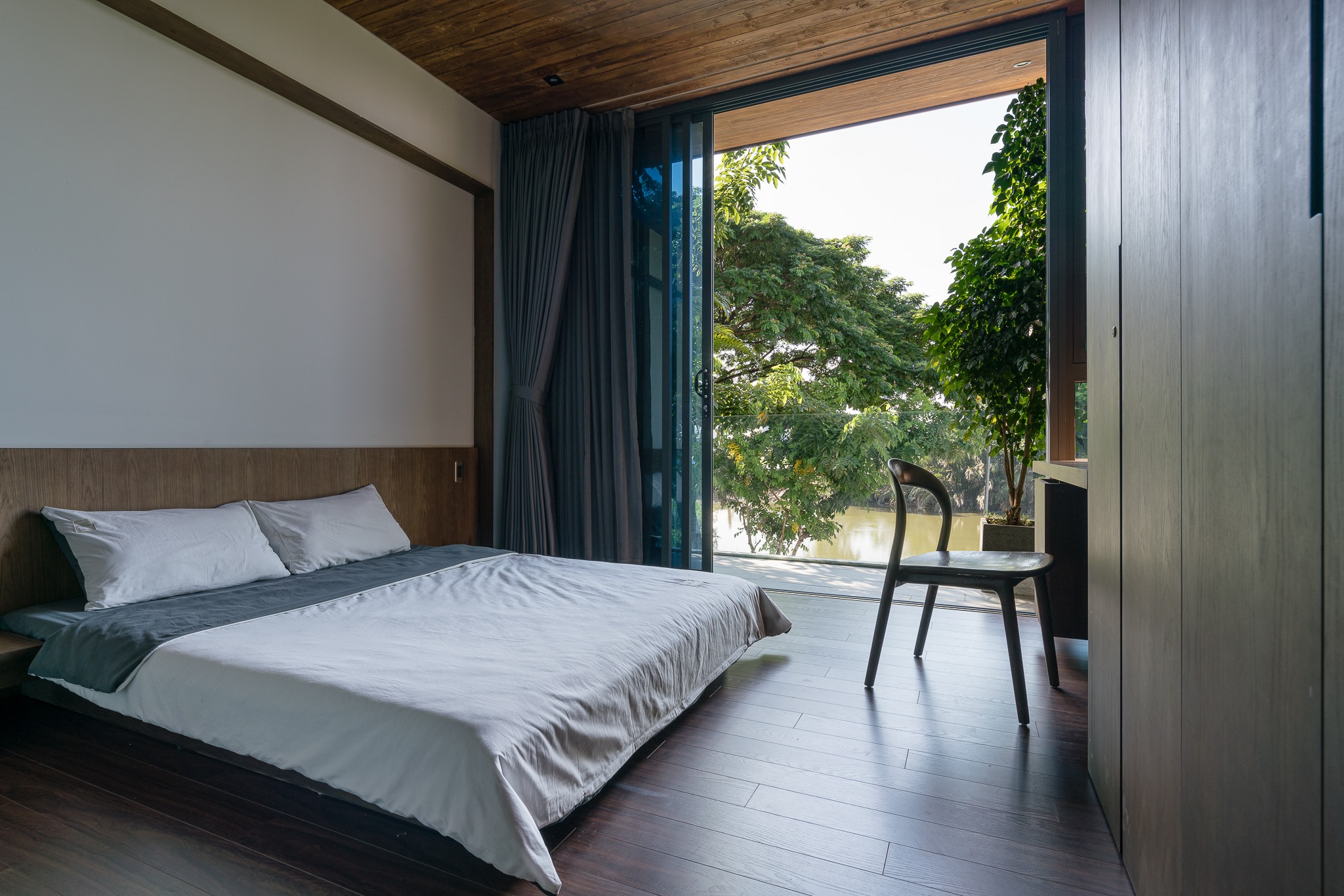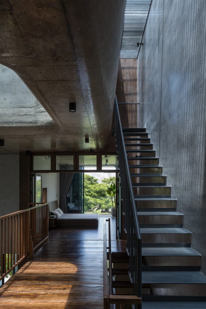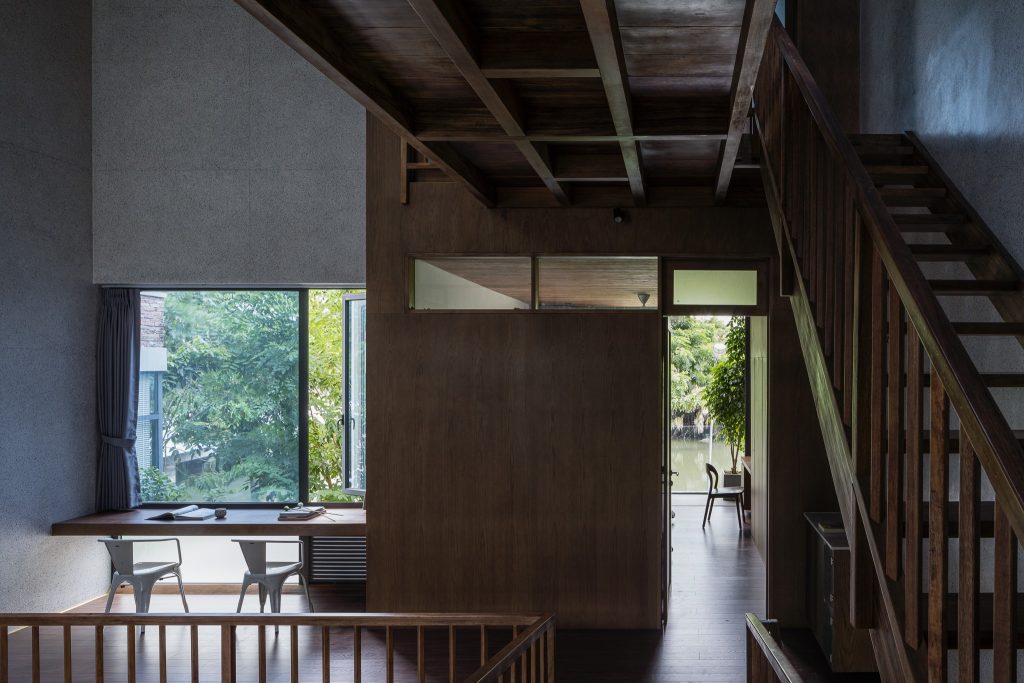 Các không gian chức năng phía trước và sau được kết nối với nhau bằng dãy cầu thang và hành lang bằng gỗ. Do nằm ở hướng Đông Nam nên ngôi nhà tránh được ánh nắng có hại và đón được luồng gió nên các phòng ngủ, bếp, phòng khách đều có hướng nhìn ra sông trước nhà.