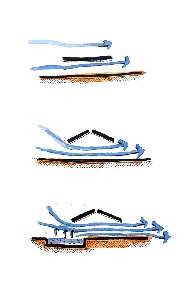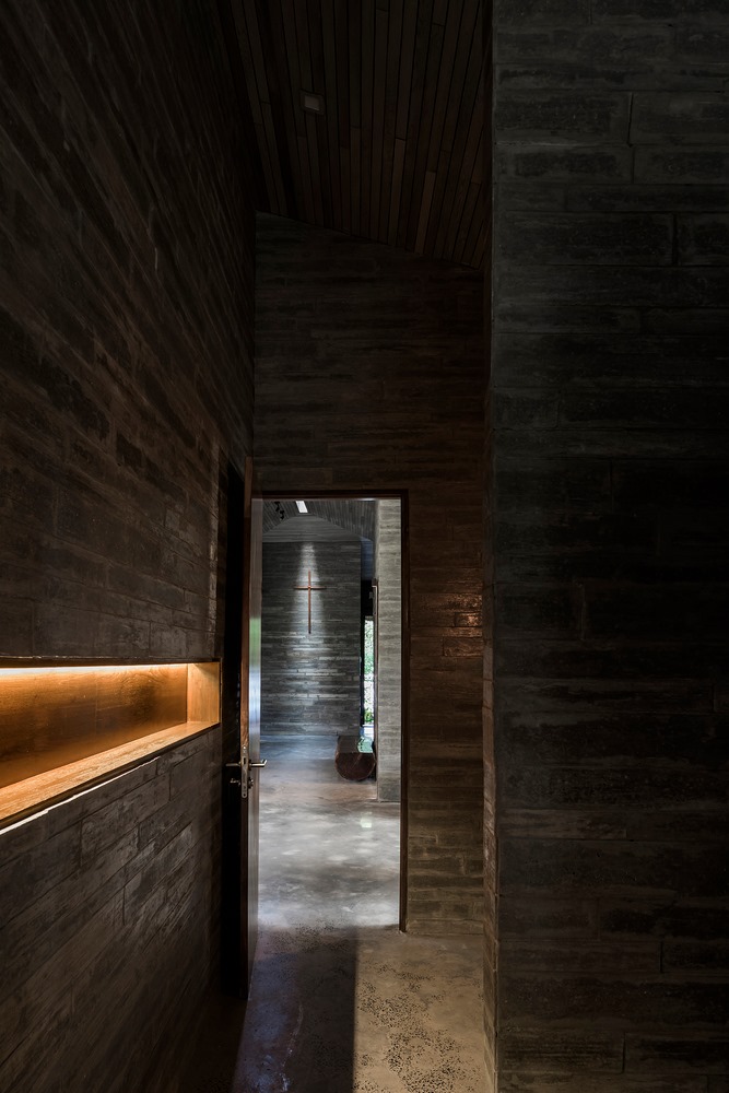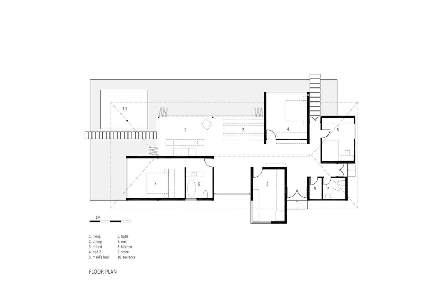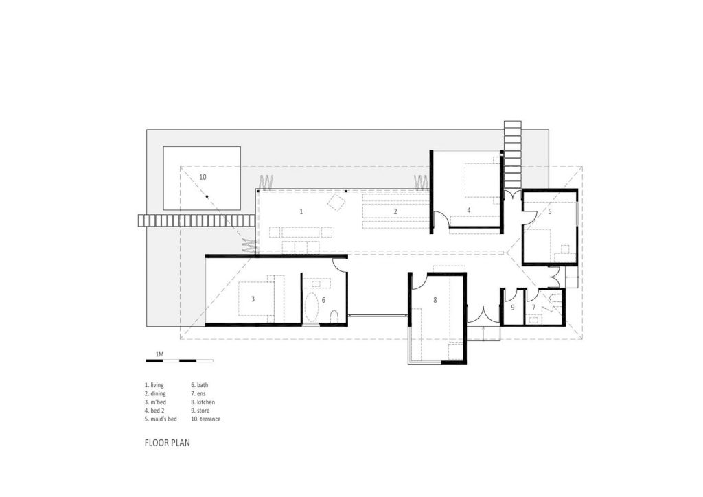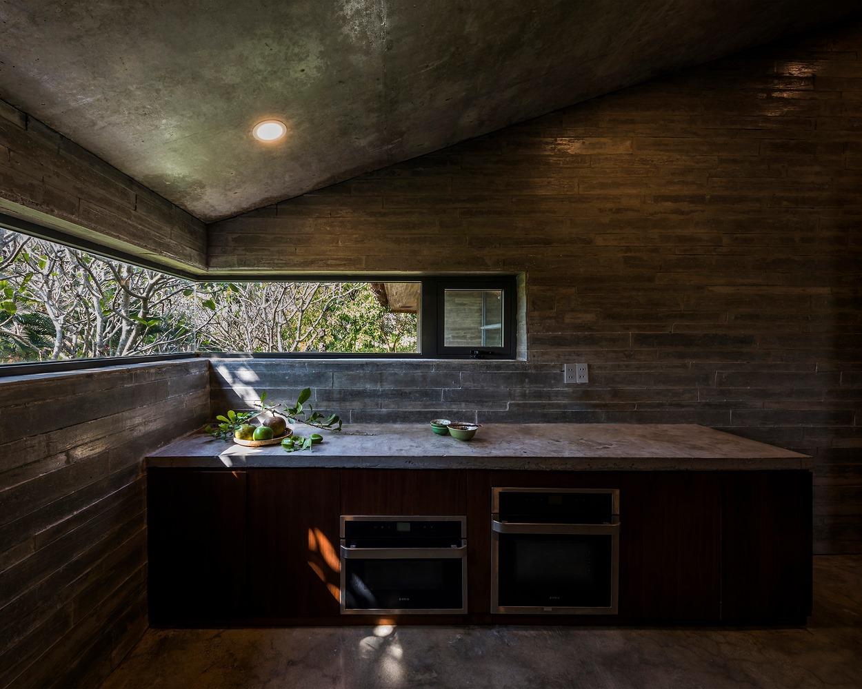 Sàn nhà không sử dụng gạch lát sàn mà dùng thủ pháp sàn bê tông mài giúp giảm chi phí xây dựng, tạo cảm giác dễ chịu khi bước đi. Trên mái, dọc theo suốt chiều dài ngôi nhà là một khe lấy thêm ánh sáng cho khu vực giữa nhà, khe sáng này còn giúp mọi người ở trong nhà cảm nhận rõ chuyển động của mặt trời qua từng khoảnh khắc trong ngày.