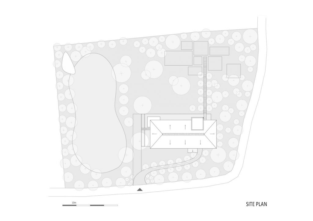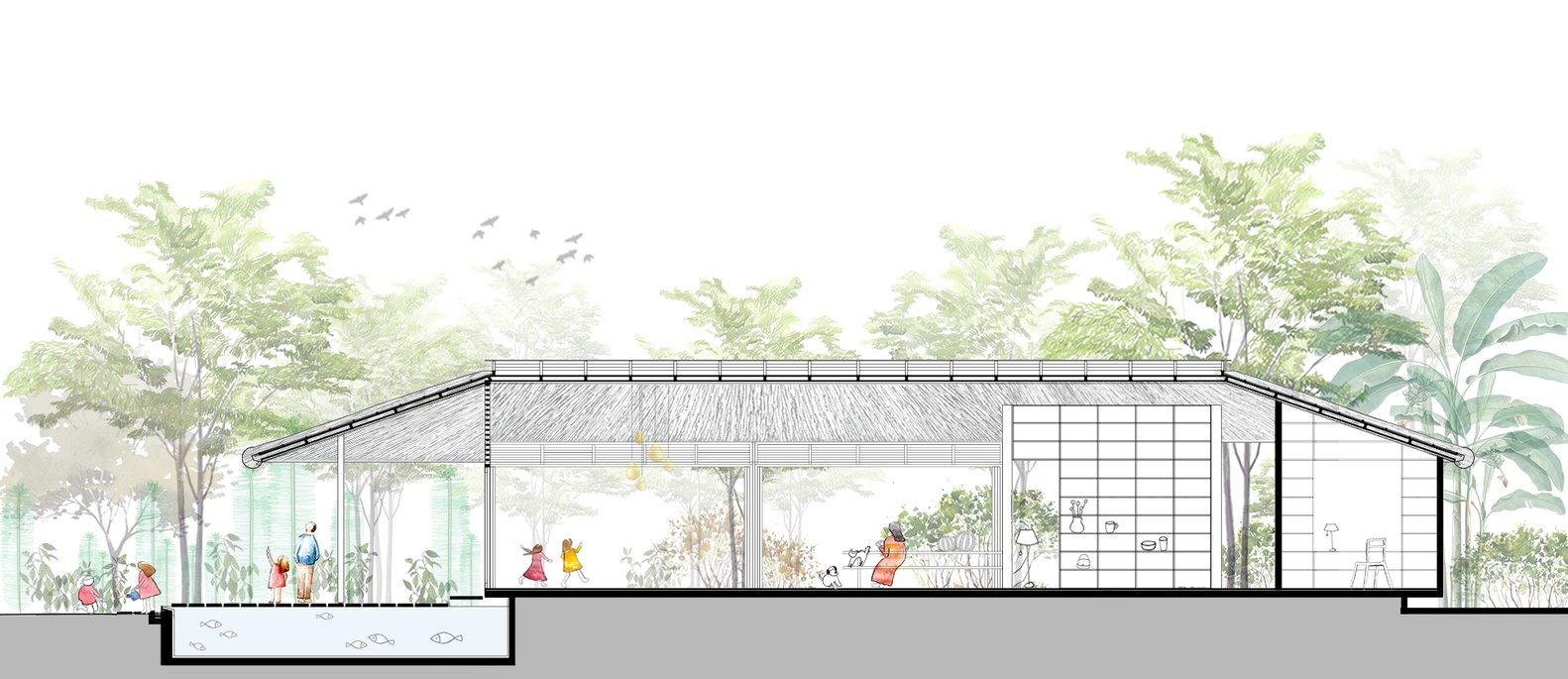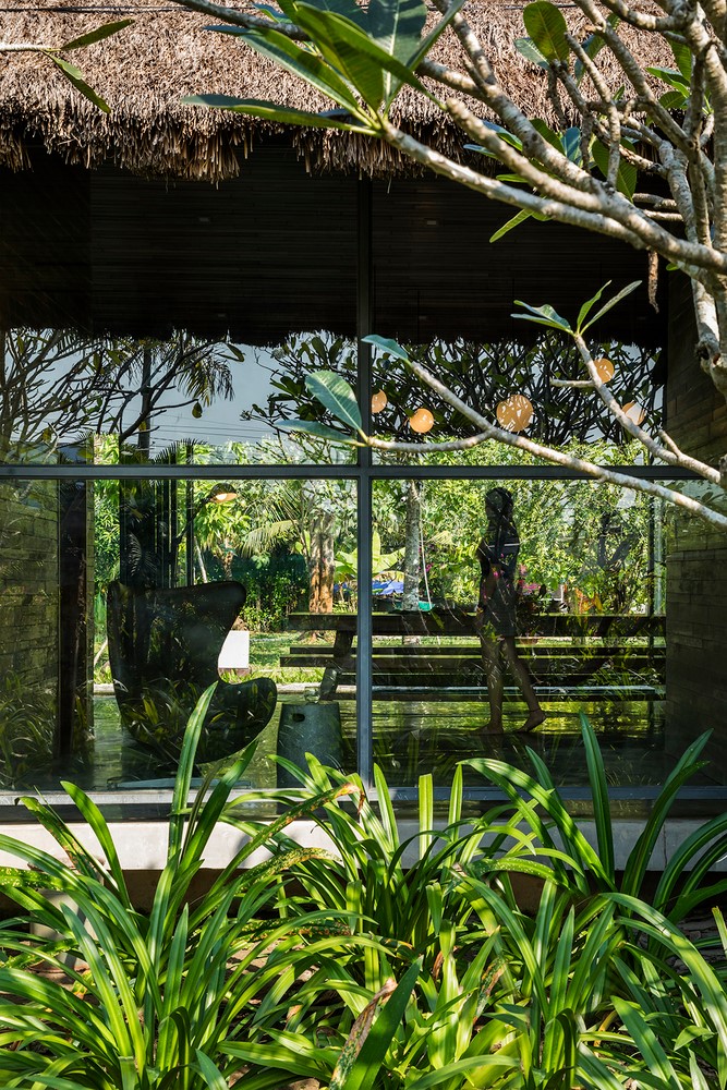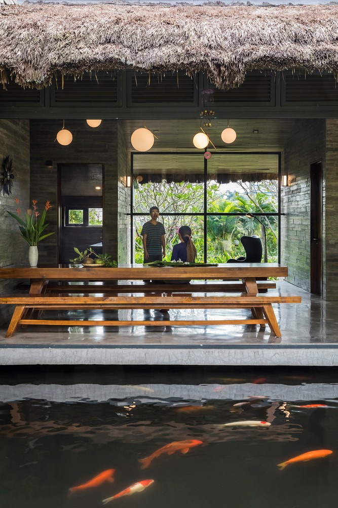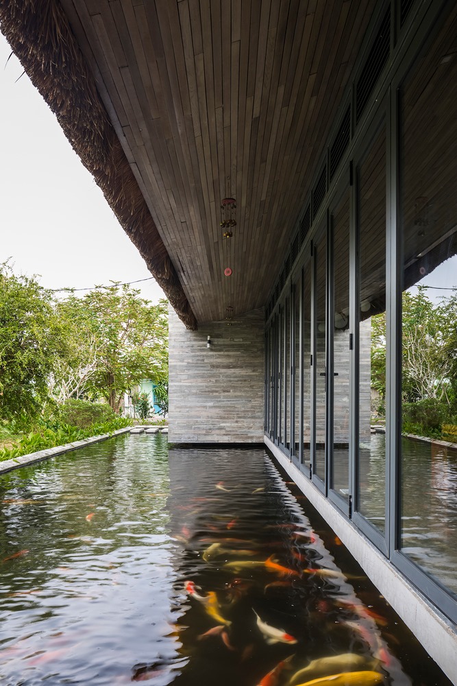 Công trình gồm 5 khối chức năng bố trí tách rời nhau, phân bố tự do bên dưới một mái tranh lớn và một hồ nước nằm ngay bên cạnh. Cách thiết kế này giúp không gian mở, phân bố ánh sáng, thông gió tự nhiên đến từng góc nhà bên trong.