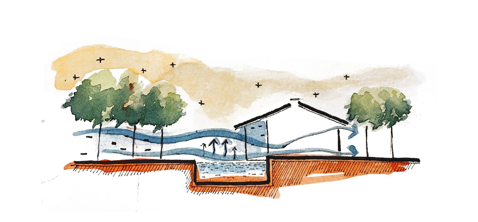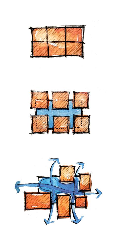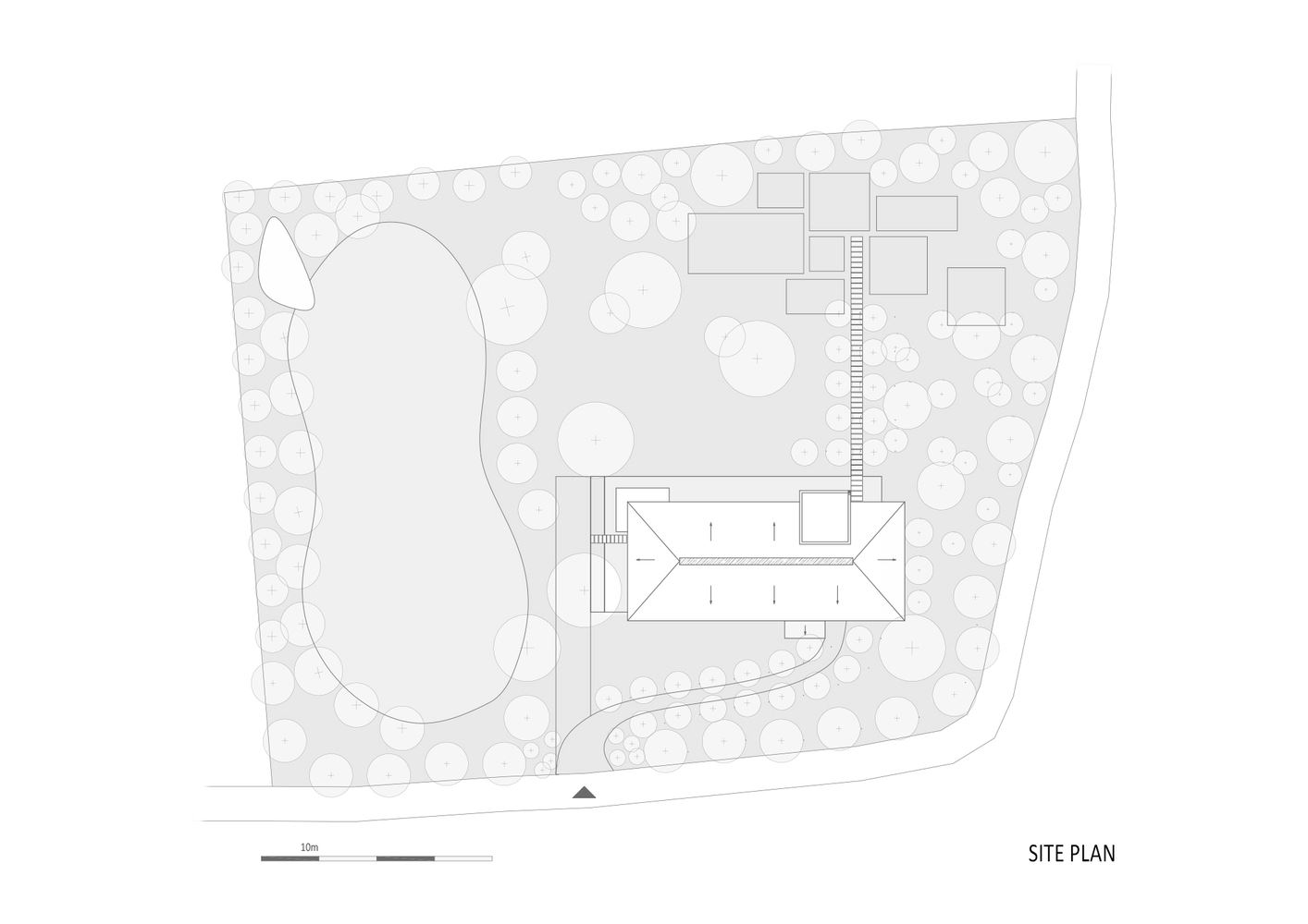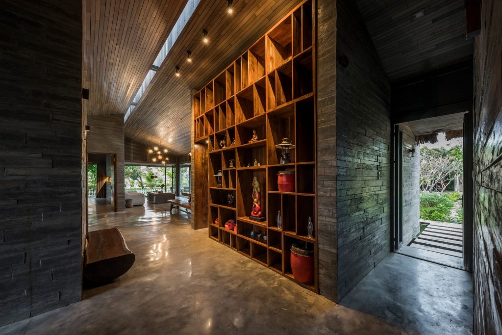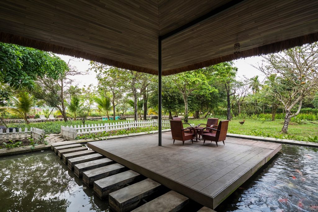 Công trình gồm 5 khối chức năng bố trí tách rời nhau, phân bố tự do bên dưới một mái tranh lớn và một hồ nước nằm ngay bên cạnh. Cách thiết kế này giúp không gian mở, phân bố ánh sáng, thông gió tự nhiên đến từng góc nhà bên trong.