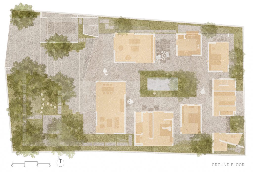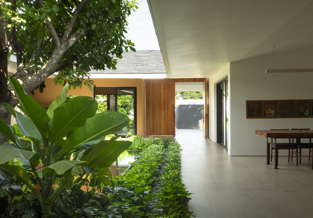 Các khối nhà được ngăn cách tạo sự thông thoáng và cuộc sống hòa hợp với thiên nhiên. Phòng riêng trong các khối hộp được ngăn cách với nhau tạo nhiều khoảng trống và đối lưu không khí đến mọi ngóc ngách trong nhà. Đồng thời, cách bố trí tường lệch tạo không gian sân chung lớn nhỏ đa dạng dưới mái dốc, không bị ngăn cách với sân vườn, ánh nắng và cây xanh. Các phòng riêng này đều mở ra những khu vườn nhỏ phía sau tạo sự riêng tư và không gian sống chan hòa với thiên nhiên.