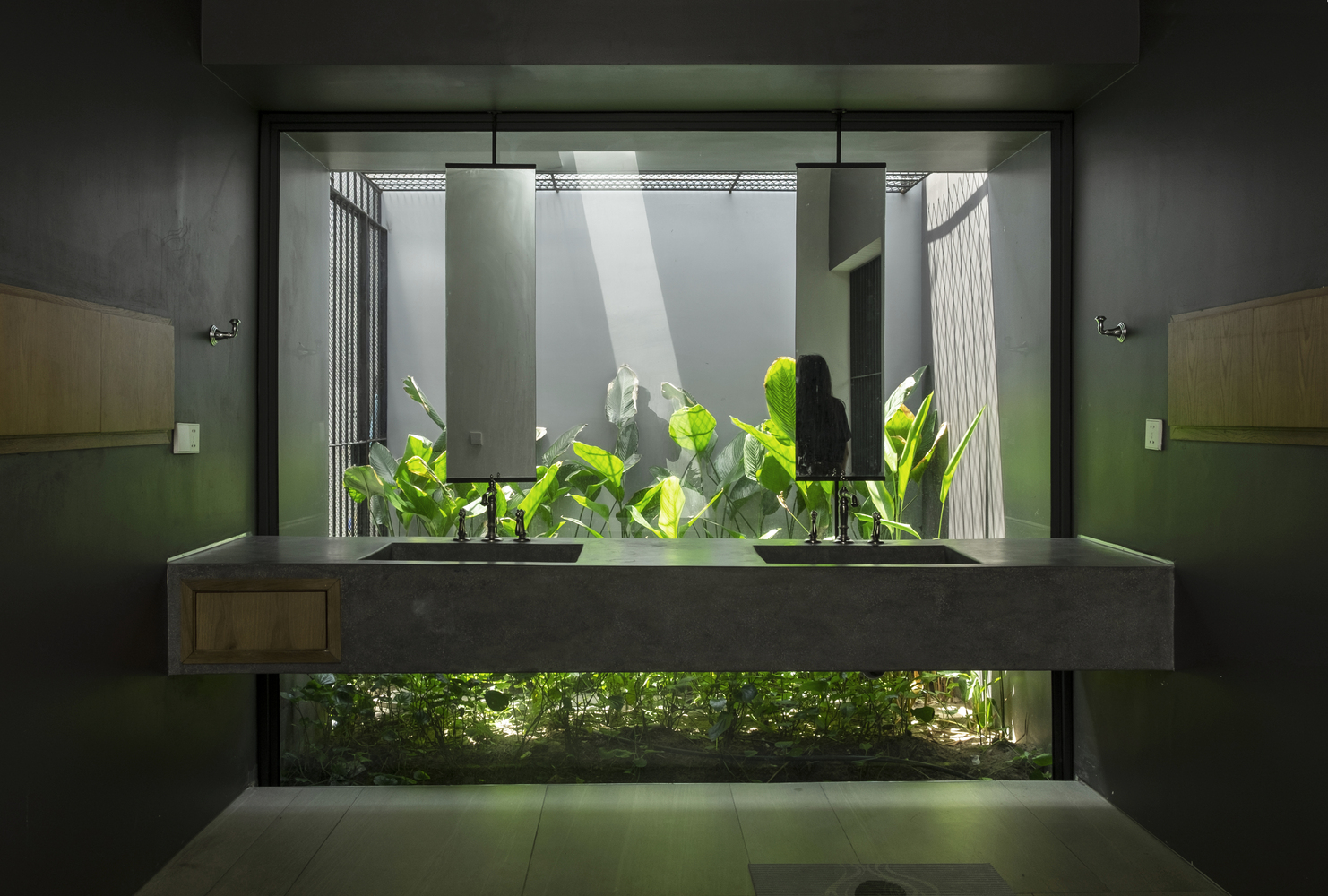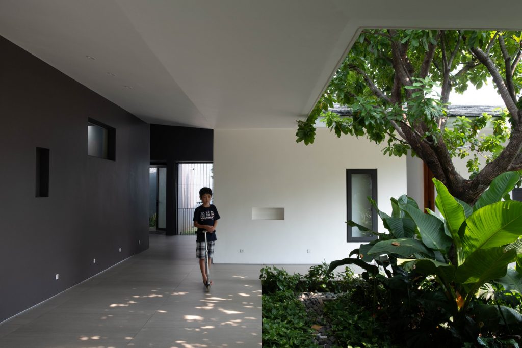 Các khối nhà được ngăn cách tạo sự thông thoáng và cuộc sống hòa hợp với thiên nhiên. Phòng riêng trong các khối hộp được ngăn cách với nhau tạo nhiều khoảng trống và đối lưu không khí đến mọi ngóc ngách trong nhà. Đồng thời, cách bố trí tường lệch tạo không gian sân chung lớn nhỏ đa dạng dưới mái dốc, không bị ngăn cách với sân vườn, ánh nắng và cây xanh. Các phòng riêng này đều mở ra những khu vườn nhỏ phía sau tạo sự riêng tư và không gian sống chan hòa với thiên nhiên.