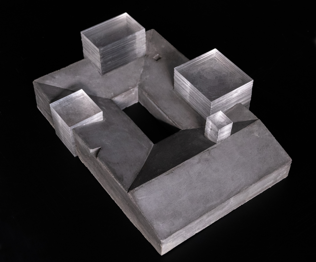 Để có đủ số lượng phòng, KTS tạo ra các khối hộp hai tầng xuyên qua mái dốc. Điều này tạo cảm giác về thể tích giống như một ngôi nhà một tầng hài hòa với bối cảnh của những ngôi nhà thấp tầng xung quanh và đồng thời tạo ra một không gian thú vị trên mái nhà. Kiến trúc này được tạo ra từ sự tương phản giữa kiến trúc khối hộp hiện đại và mái đá cổ. Là sự giao thoa giữa chất liệu thô ráp và sần sùi của mái nhà và độ nhẵn của các khối hộp.