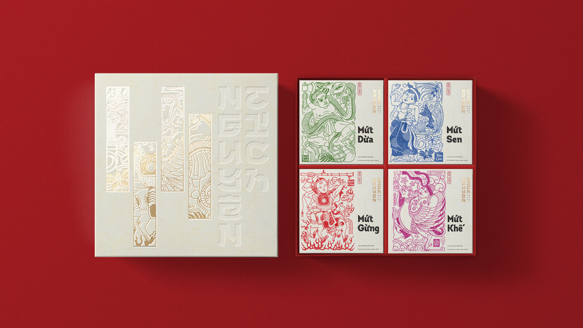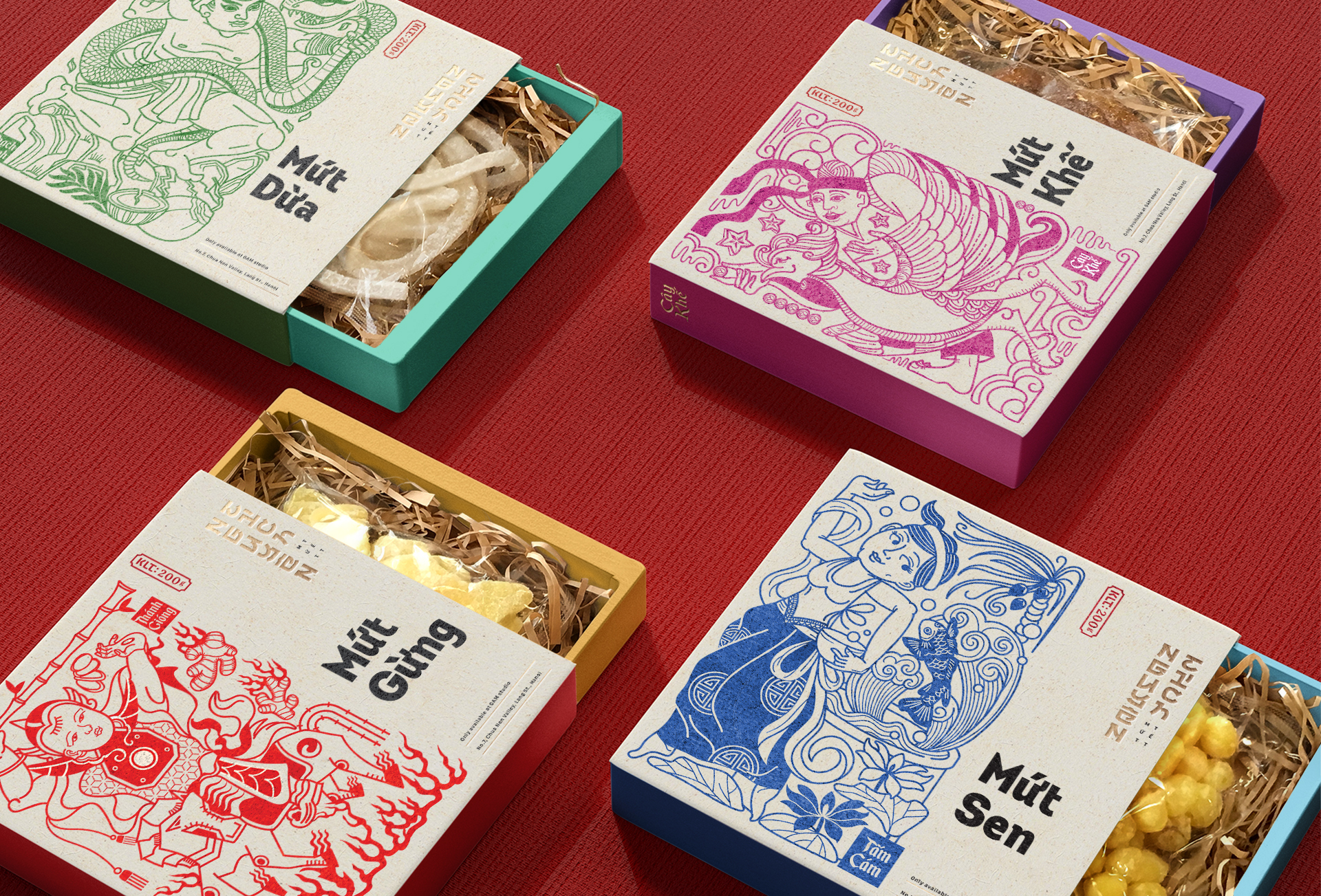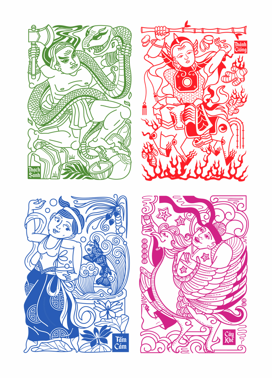Thay vì sử dụng bút pháp ước lệ hình khối, đặc tả nét mặt nhân vật trong dân gian thì hình ảnh minh họa trong thiết kế được vẽ bằng nét bút đều và dày, đặc tả tư thế và bối cảnh, để layout được gọn nhưng sống động. Bao bì ép nhũ và đóng gói thủ công mang lại hơi thở hiện đại cho sản phẩm.