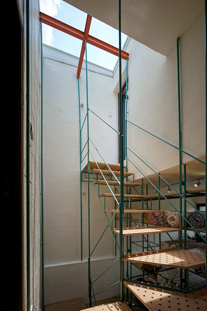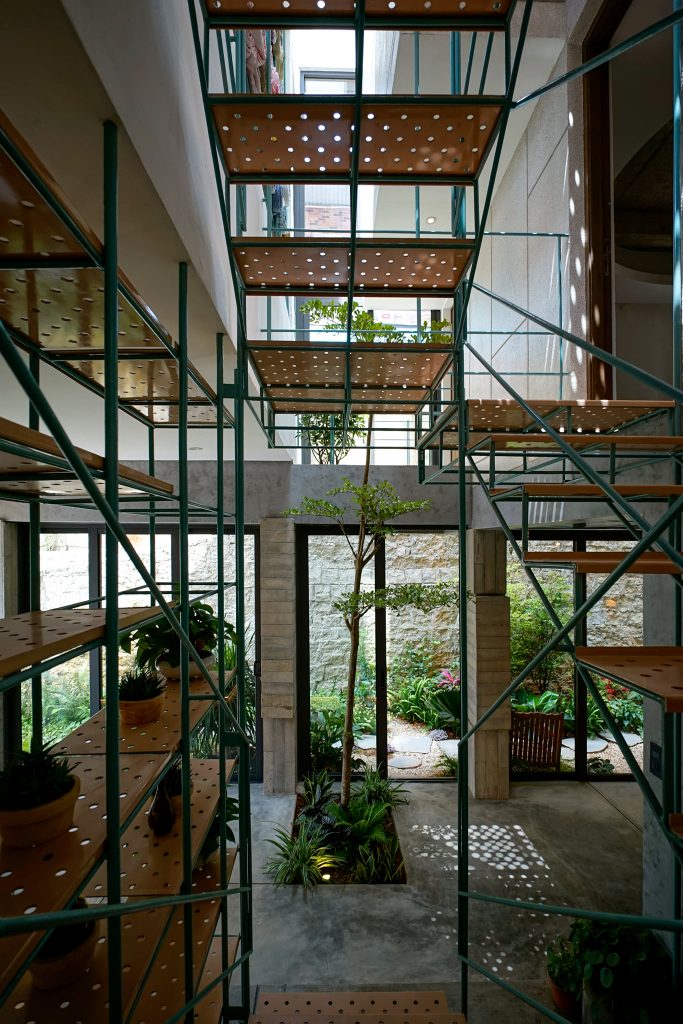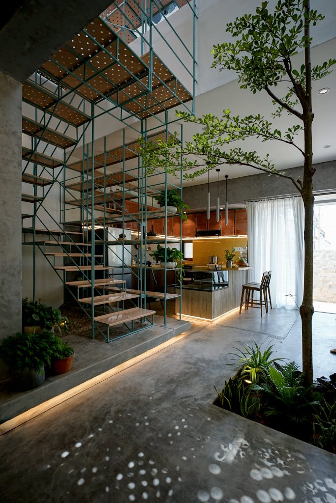 Trái với cách sử dụng vật liệu đặc và nặng ở mặt tiền, lõi thang sắt giữa nhà được thiết kế như một yếu tố nhẹ nhàng, mỏng manh, trôi nổi. Bên cạnh việc là điểm nhấn quan trọng, cách sử dụng cấu trúc rỗng cho hệ thang cũng giúp khu giếng trời nhỏ có cảm giác thông thoáng hơn và lấy được ánh sáng dịu nhẹ xuống những không gian bên dưới.