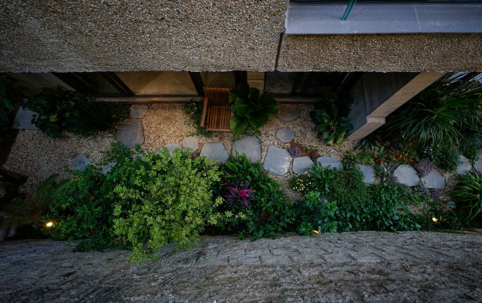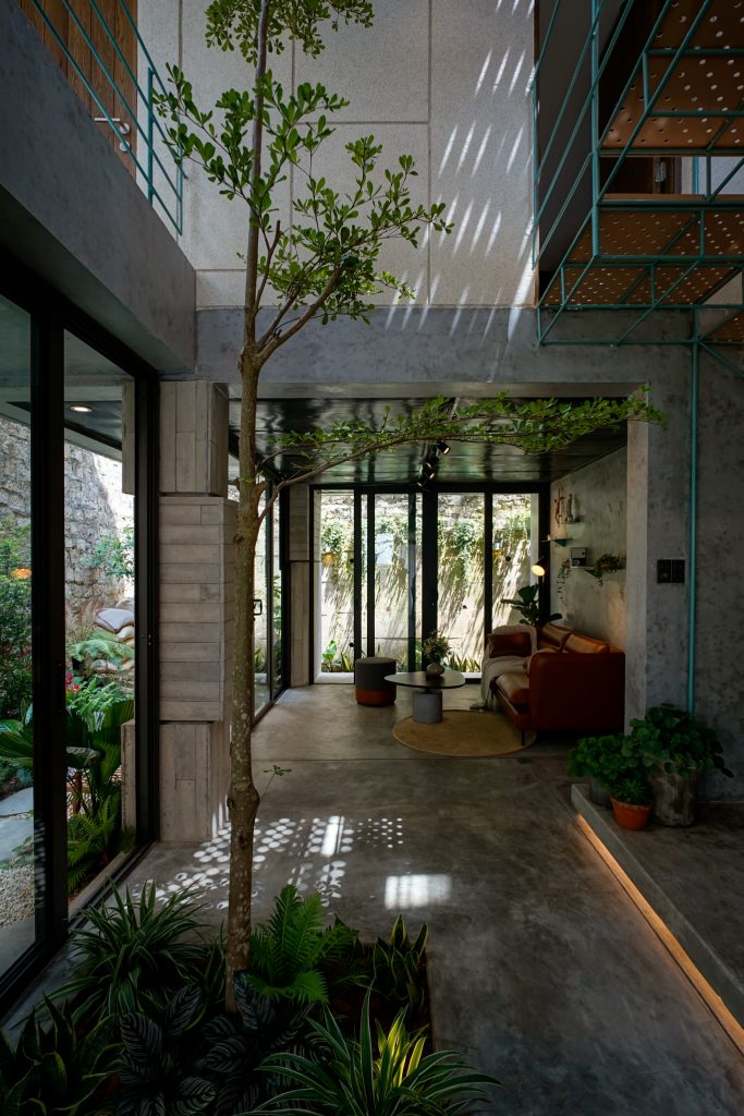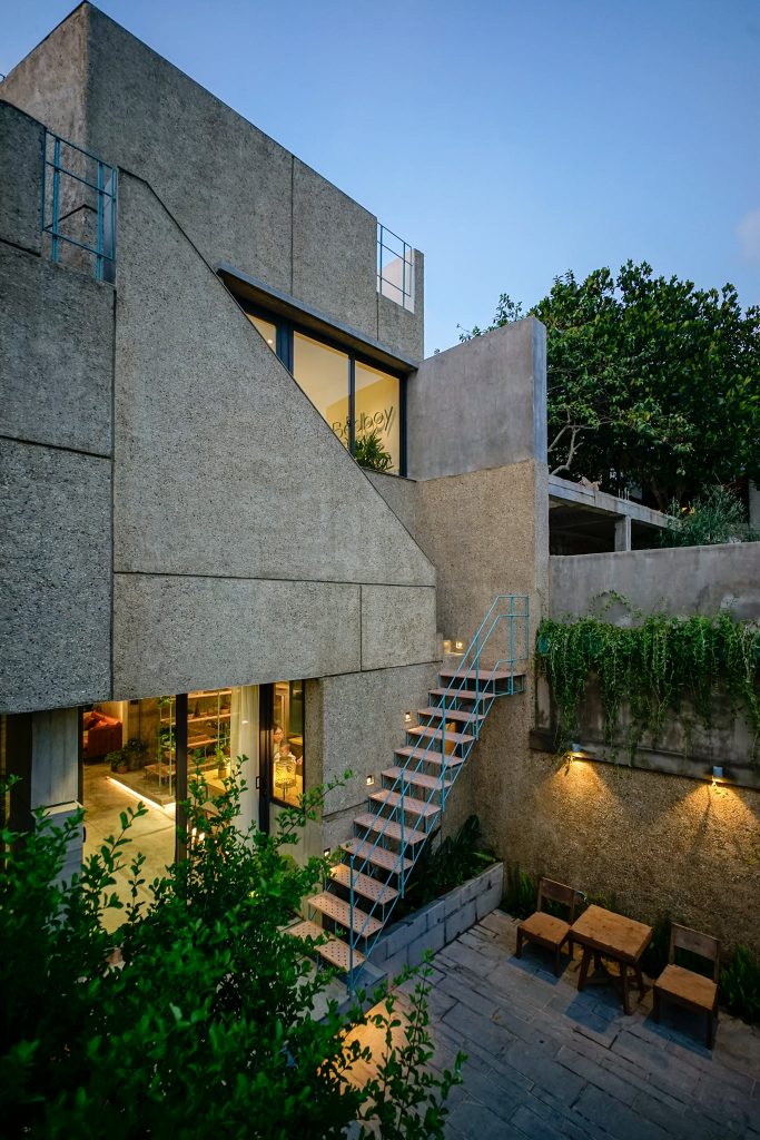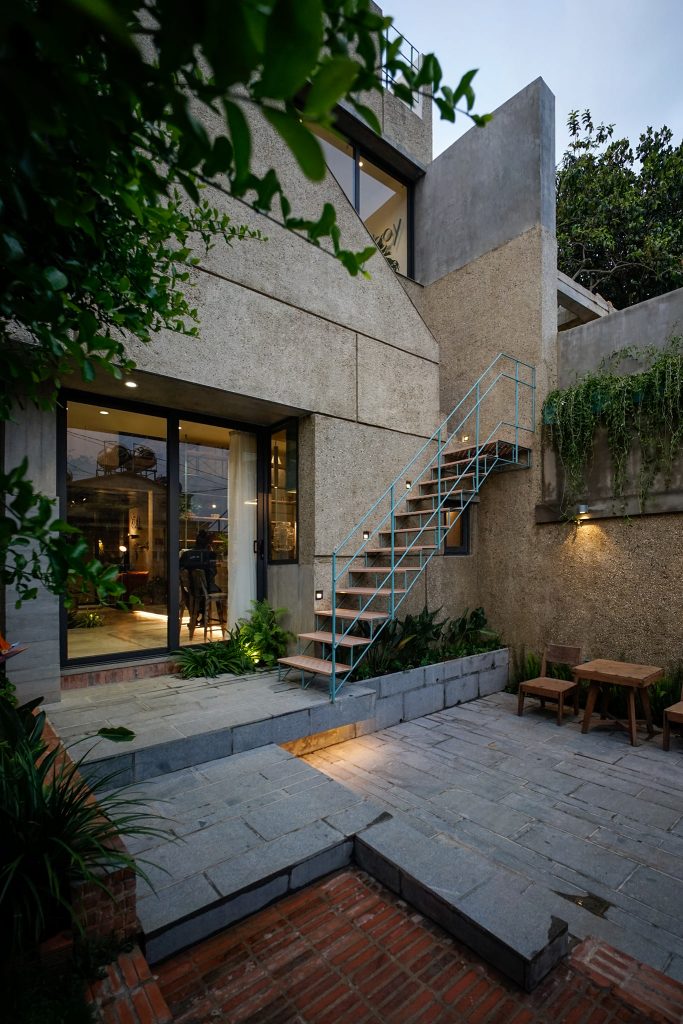 Ngoài ra, với việc tích hợp không gian kinh doanh nhỏ của gia chủ, một thang sắt ngoài trời đã được đề xuất để khách có thể lên thẳng vị trí lầu một ngay từ sảnh đệm. Phần thang này còn tiếp nối lên sân thượng, nơi có được gần như trọn vẹn góc nhìn đẹp về phía rừng nguyên sinh.