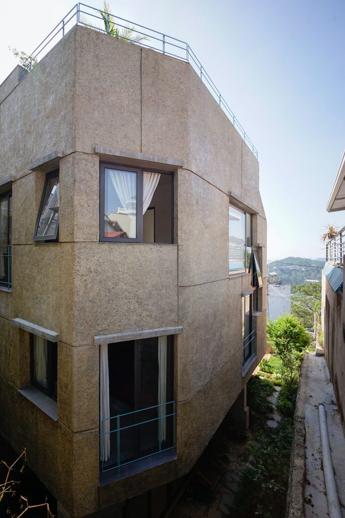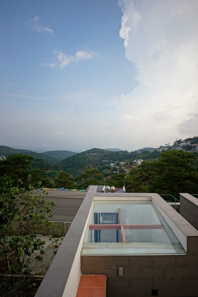 Khu đất có ba kè đá bao quanh cùng với mặt nền dốc nhẹ về hướng thung lũng, KTS muốn tận dụng ưu thế địa hình để giảm bớt chi phí san lấp, đồng thời nâng cao không gian sử dụng ở tầng trên nhằm tận dụng góc nhìn đẹp về phía thung lũng. Với diện tích vừa vặn cộng với chỉ giới quy hoạch từ các cạnh khu đất, nên khi thiết kế một trong những chiến lược lớn của Tad.atelier là tối đa hóa diện tích sử dụng. Những phòng ngủ riêng tư được bố trí ở phía sau công trình trong khi tiện ích công cộng được đưa ra phía trước.