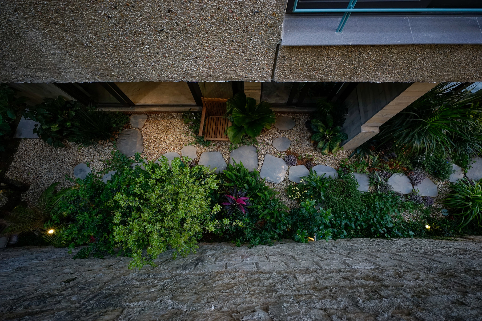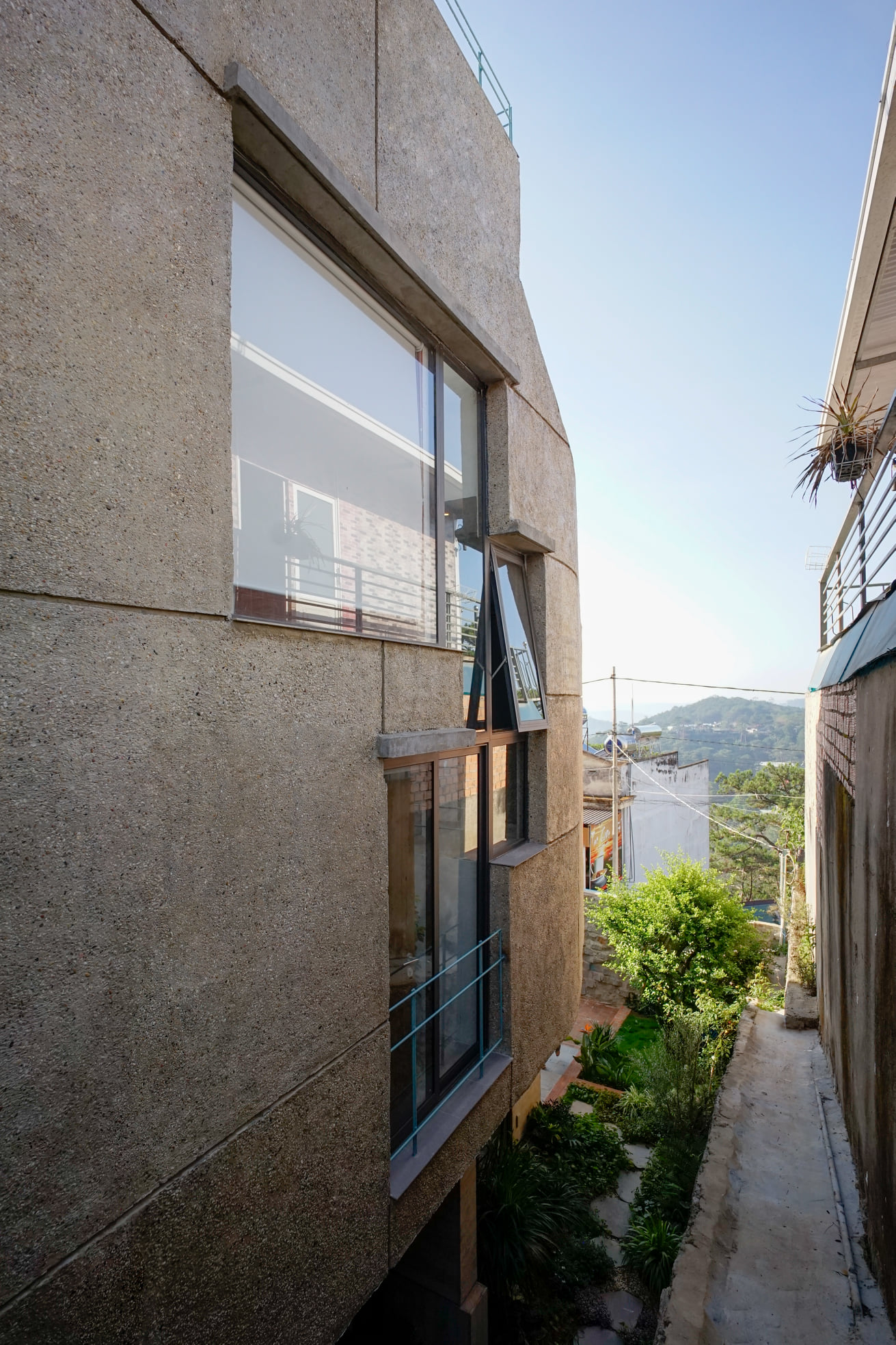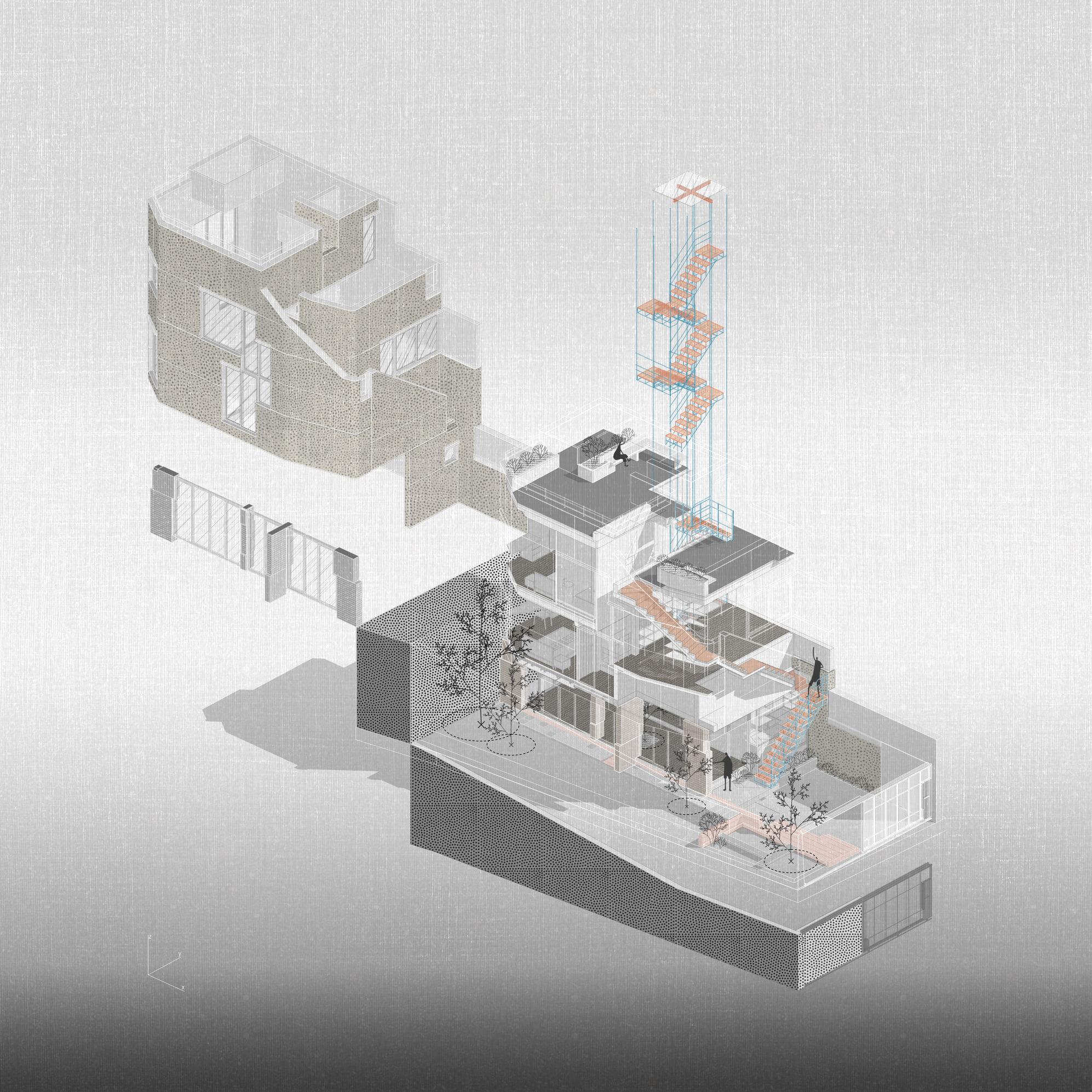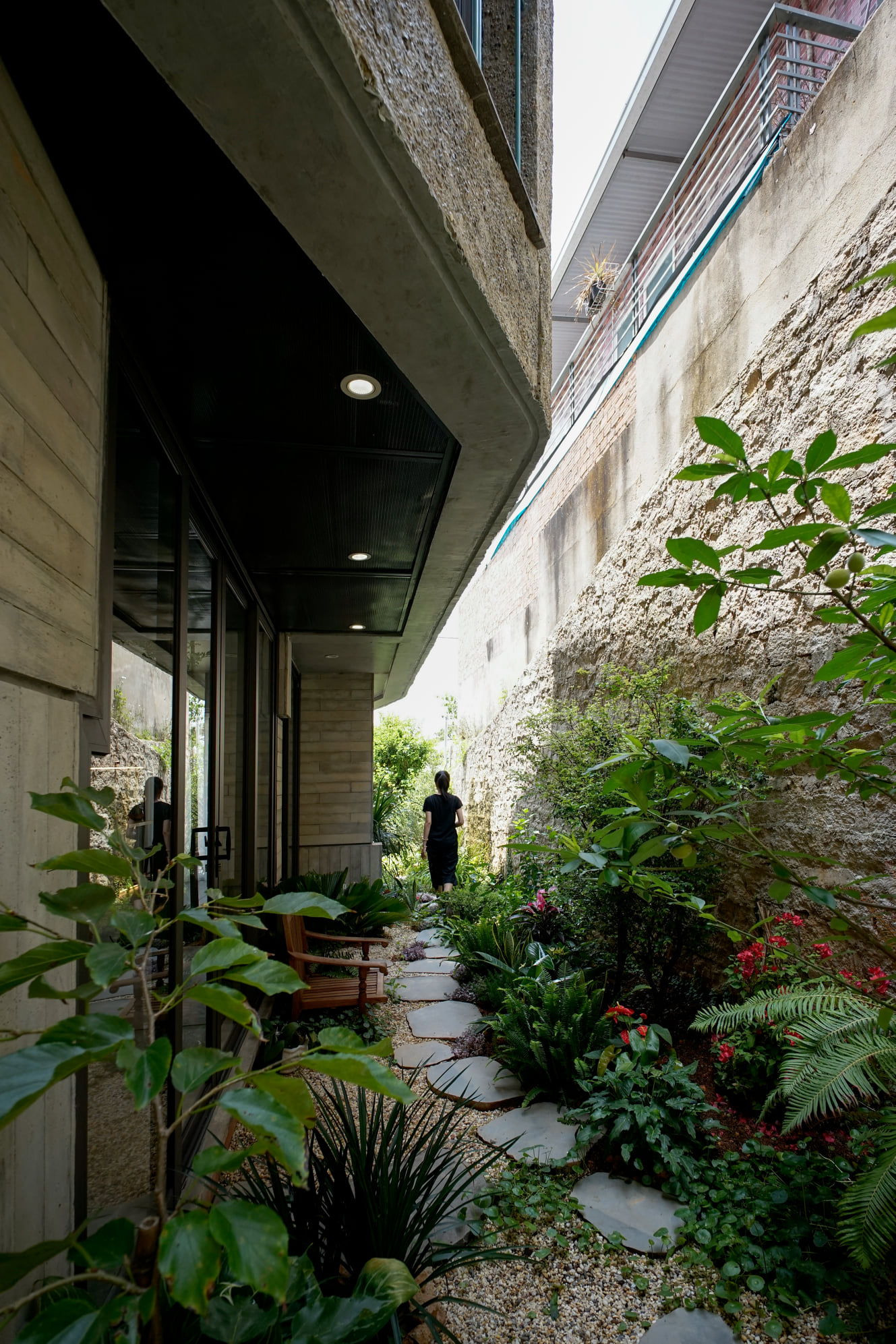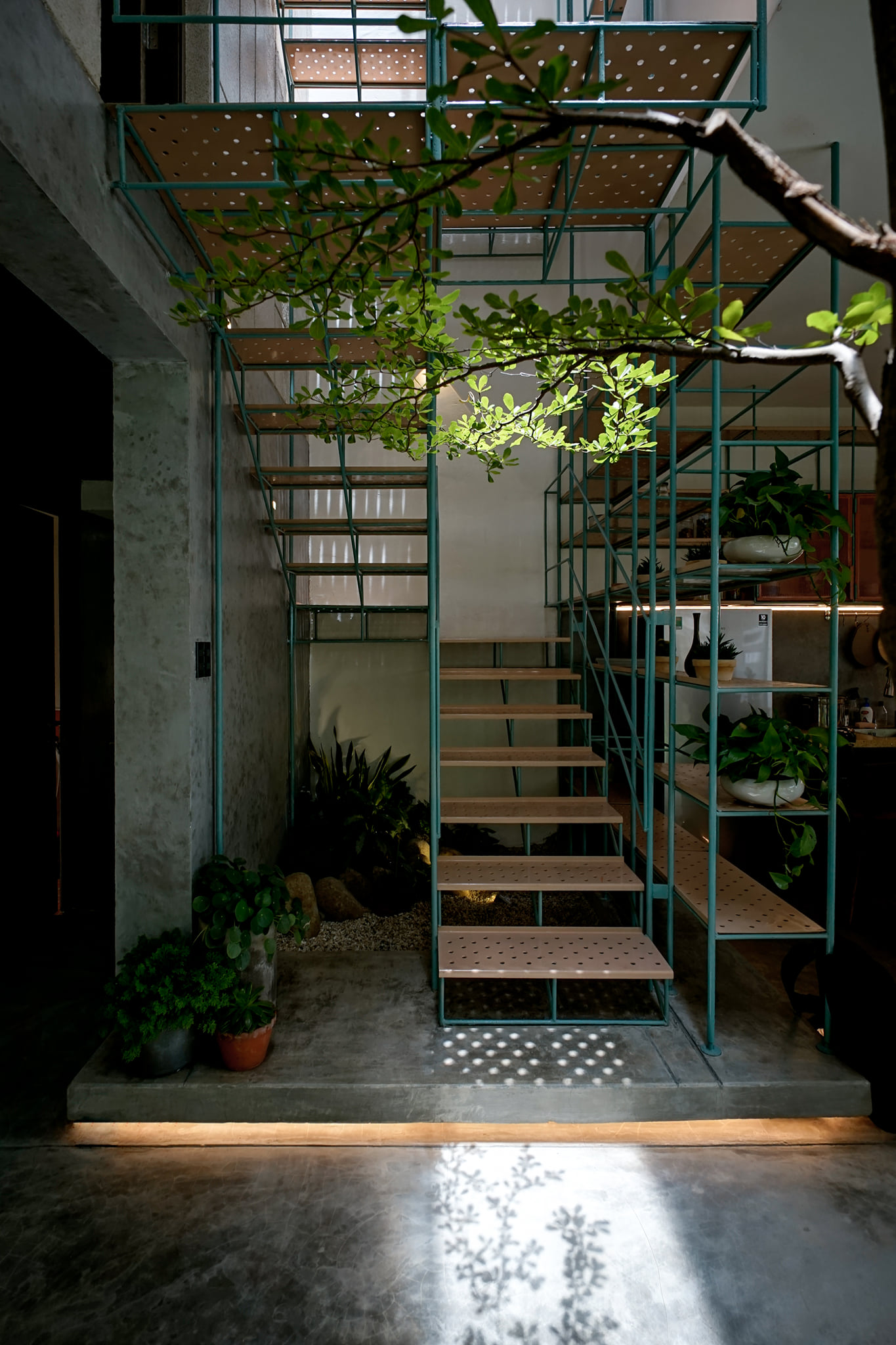 Ngoài ra, với việc tích hợp không gian kinh doanh nhỏ của gia chủ, một thang sắt ngoài trời đã được đề xuất để khách có thể lên thẳng vị trí lầu một ngay từ sảnh đệm. Phần thang này còn tiếp nối lên sân thượng, nơi có được gần như trọn vẹn góc nhìn đẹp về phía rừng nguyên sinh.