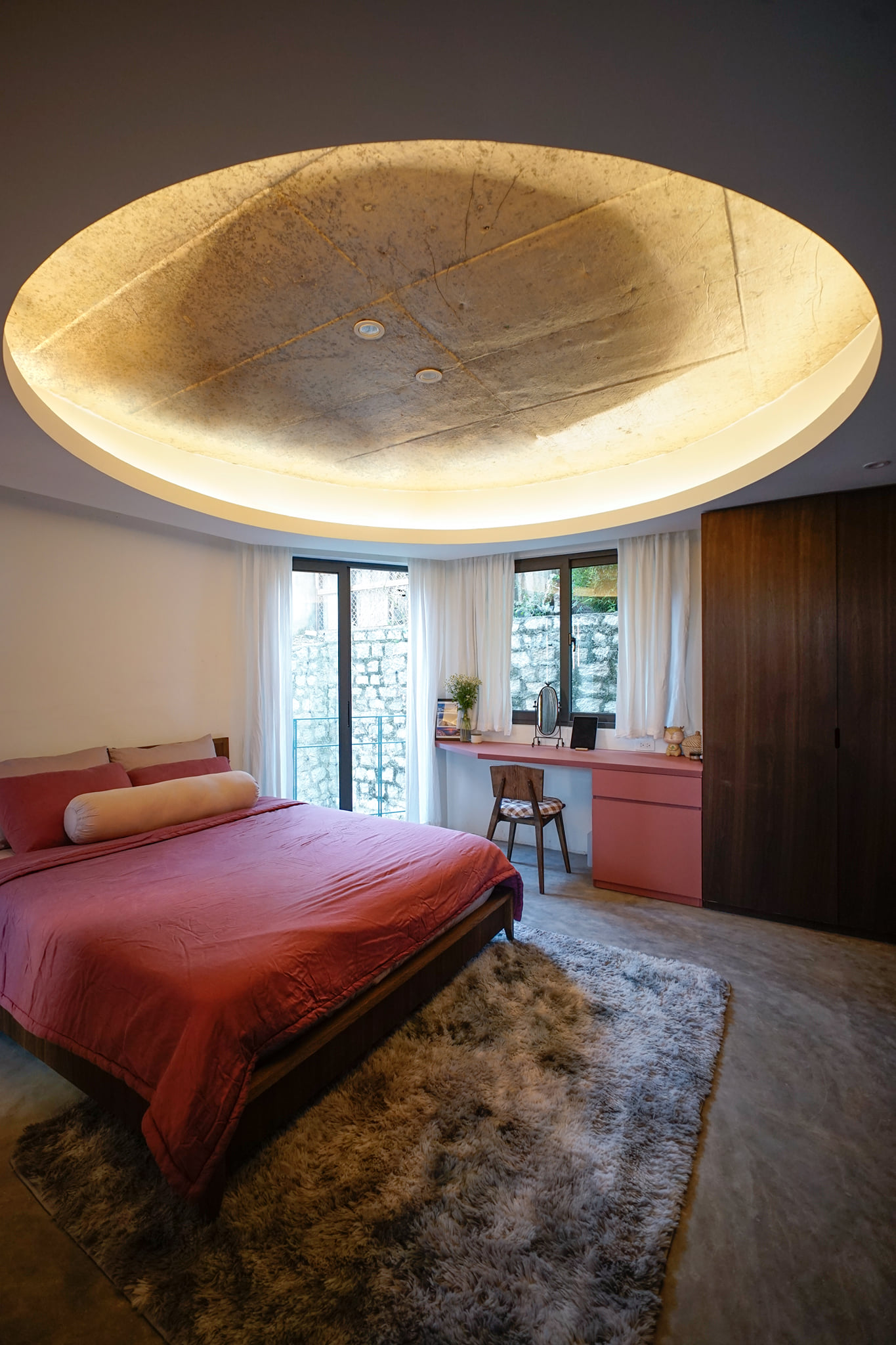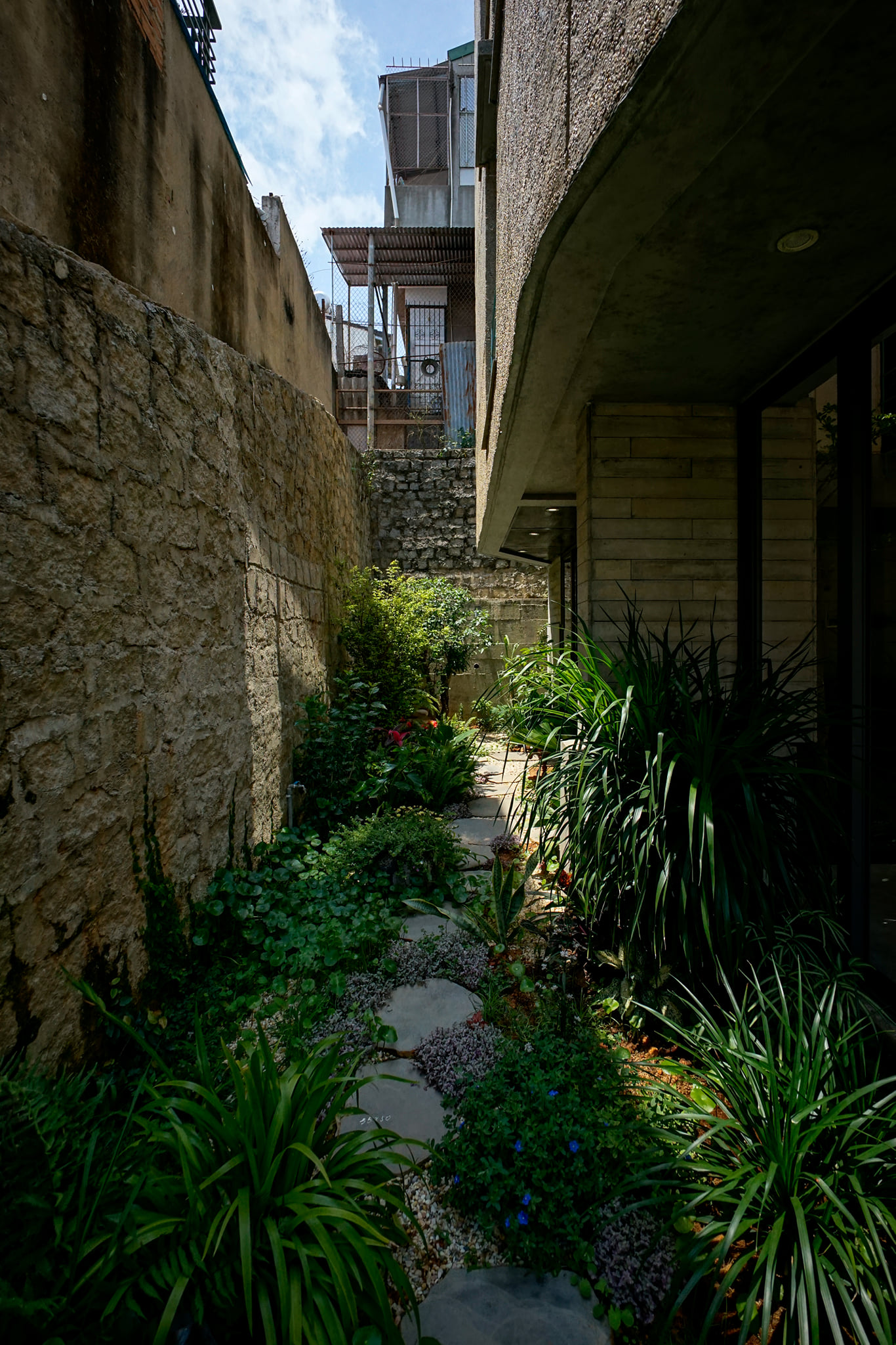 Khu đất có ba kè đá bao quanh cùng với mặt nền dốc nhẹ về hướng thung lũng, KTS muốn tận dụng ưu thế địa hình để giảm bớt chi phí san lấp, đồng thời nâng cao không gian sử dụng ở tầng trên nhằm tận dụng góc nhìn đẹp về phía thung lũng. Với diện tích vừa vặn cộng với chỉ giới quy hoạch từ các cạnh khu đất, nên khi thiết kế một trong những chiến lược lớn của Tad.atelier là tối đa hóa diện tích sử dụng. Những phòng ngủ riêng tư được bố trí ở phía sau công trình trong khi tiện ích công cộng được đưa ra phía trước.