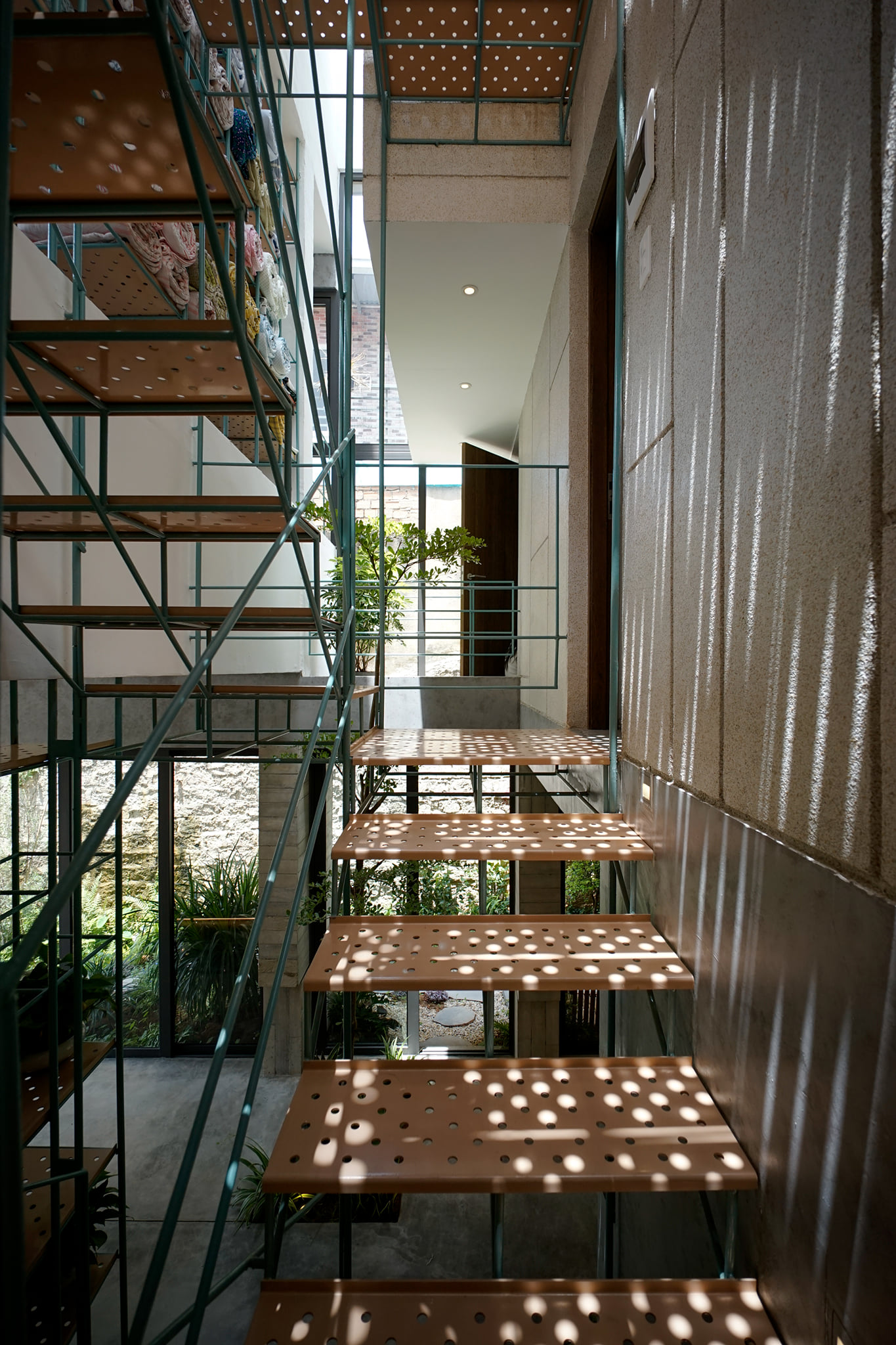 Trái với cách sử dụng vật liệu đặc và nặng ở mặt tiền, lõi thang sắt giữa nhà được thiết kế như một yếu tố nhẹ nhàng, mỏng manh, trôi nổi. Bên cạnh việc là điểm nhấn quan trọng, cách sử dụng cấu trúc rỗng cho hệ thang cũng giúp khu giếng trời nhỏ có cảm giác thông thoáng hơn và lấy được ánh sáng dịu nhẹ xuống những không gian bên dưới.