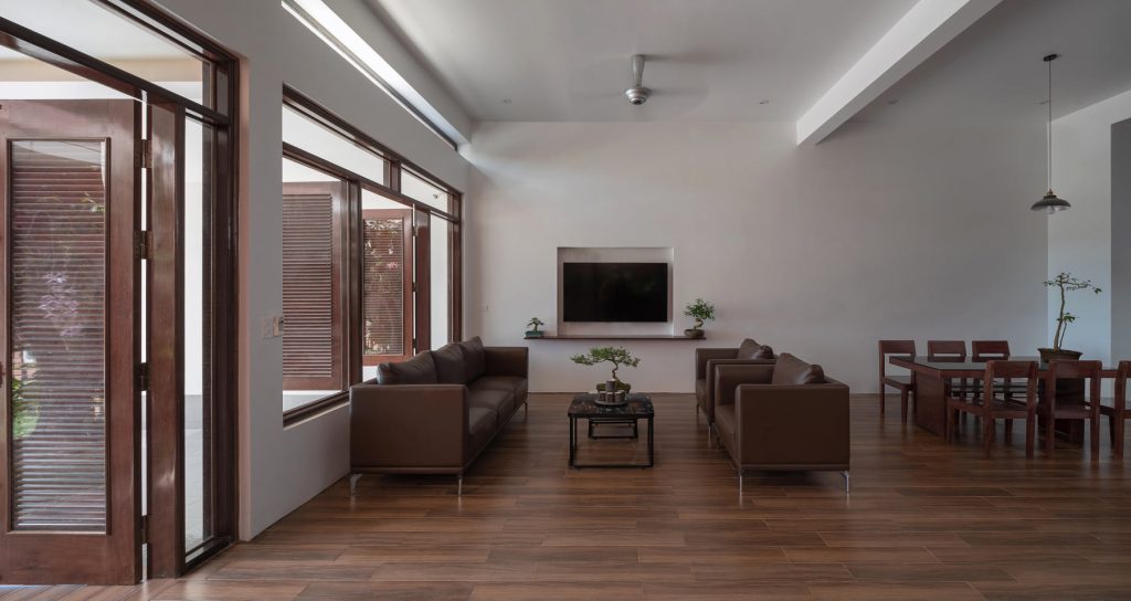 Cấu trúc mặt bằng được bố trí hình chữ L gồm một khoảng sân lớn trước và một khoảng hiên dài bên hông tạo thành các khu vườn và khoảng trời ‘’TRONG’’ cho ngôi nhà. Đó là những không gian đặc trưng trong cấu trúc nhà Việt truyền thống.