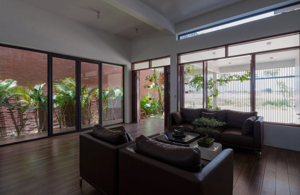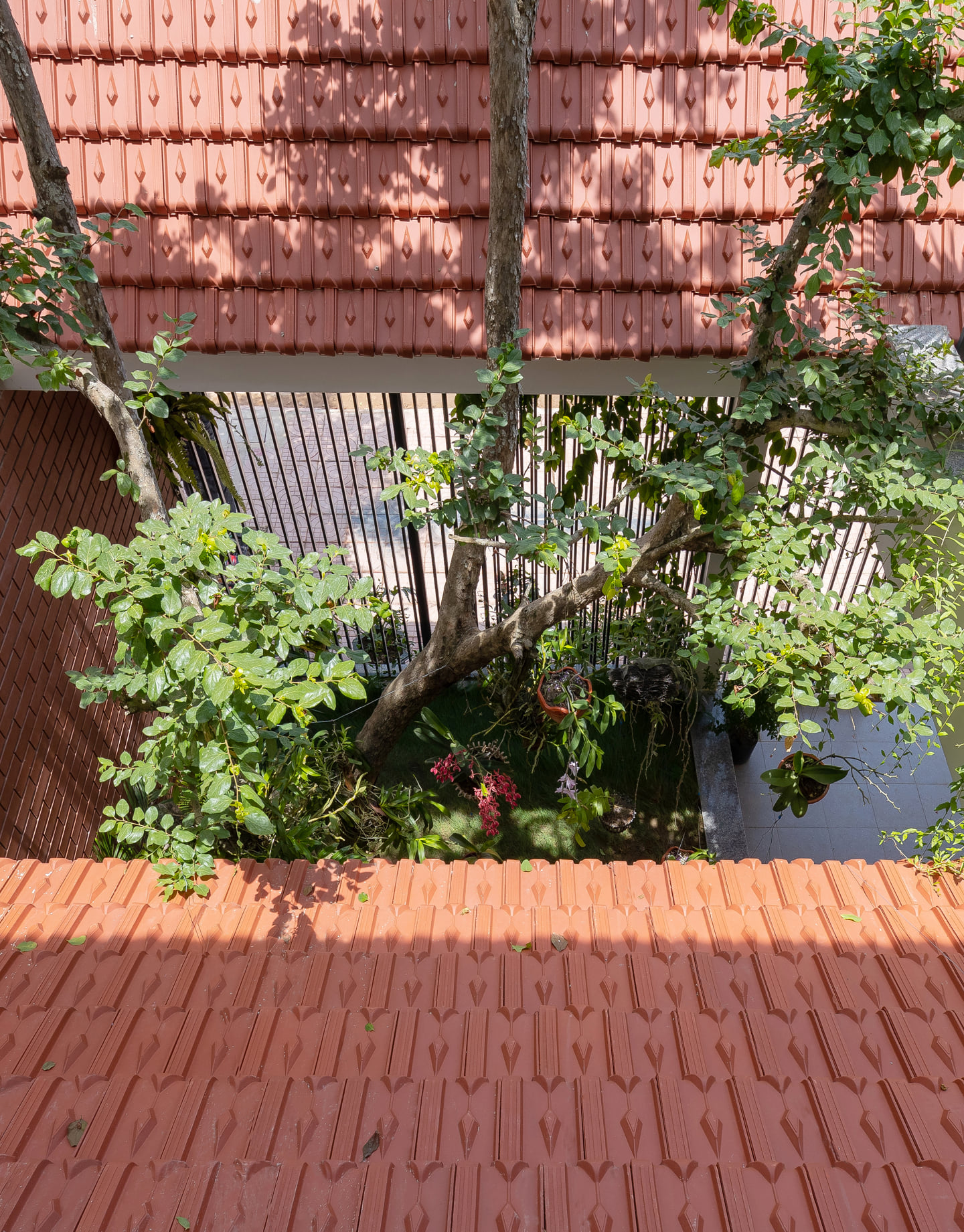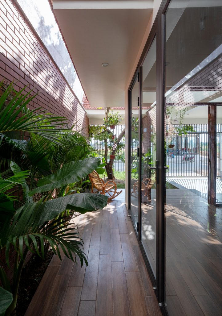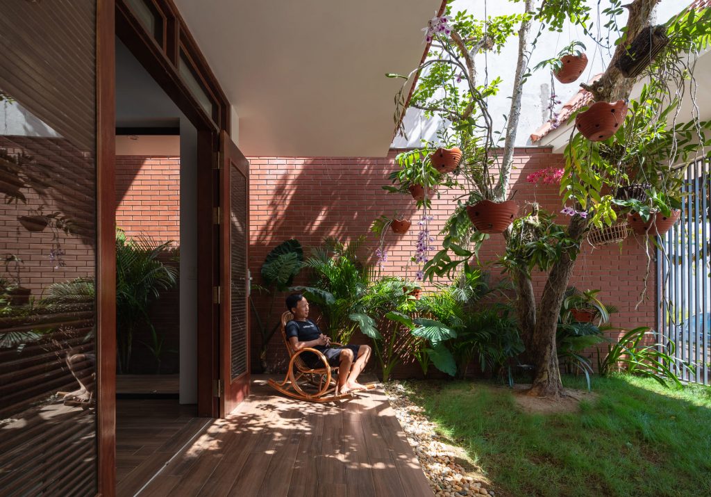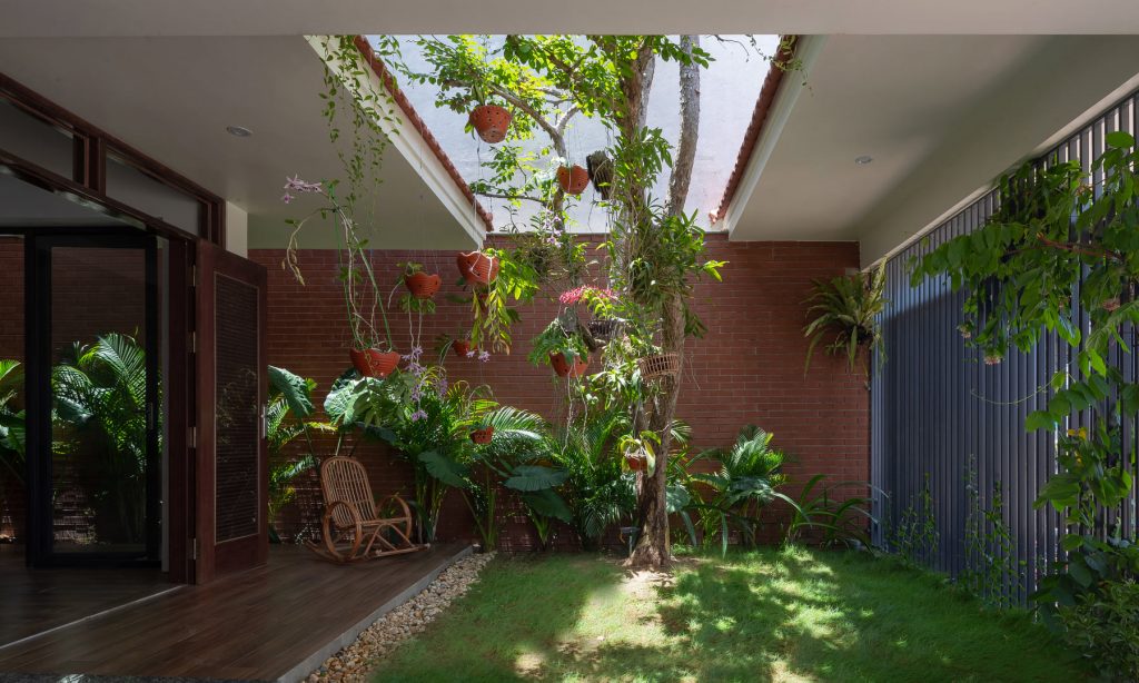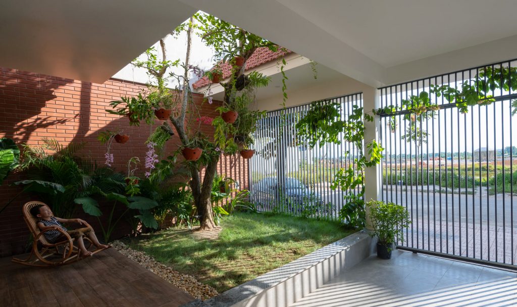 Một cây lớn phủ bóng được bố trí ở khoảng sân trước làm điểm nhấn chính tạo nên sự bình yên khi bước vào cổng nhà. Tại chốn này cả gia đình có thể dùng bữa cơm ngoài sân dưới bóng cây, hay những câu chuyện rôm rả với hàng xóm nhâm nhi bên ấm trà xanh.