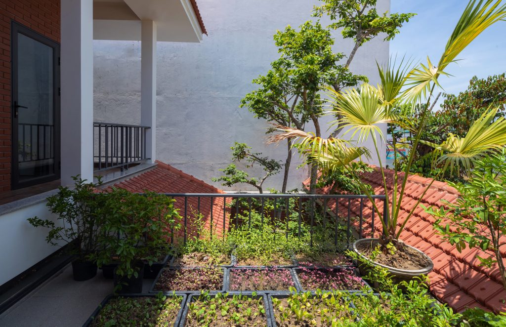 Phần mái sân trước là nơi được gia đình trồng rau và chăm sóc những khu vườn nhỏ những lúc thảnh thơi, hưởng thụ cuộc sống bình yên và ý nghĩa.