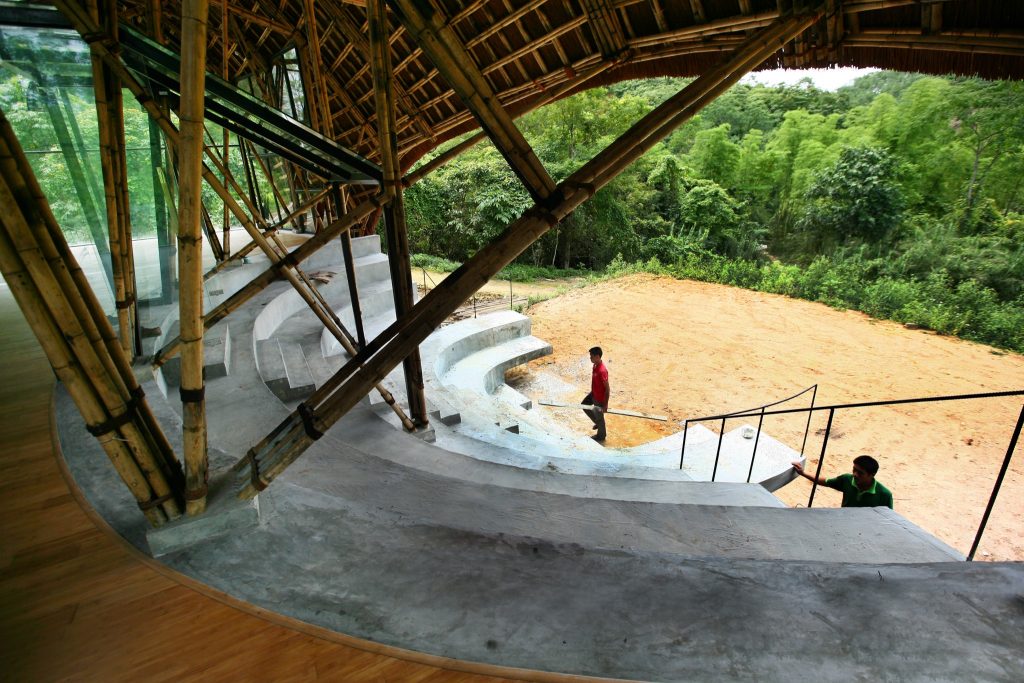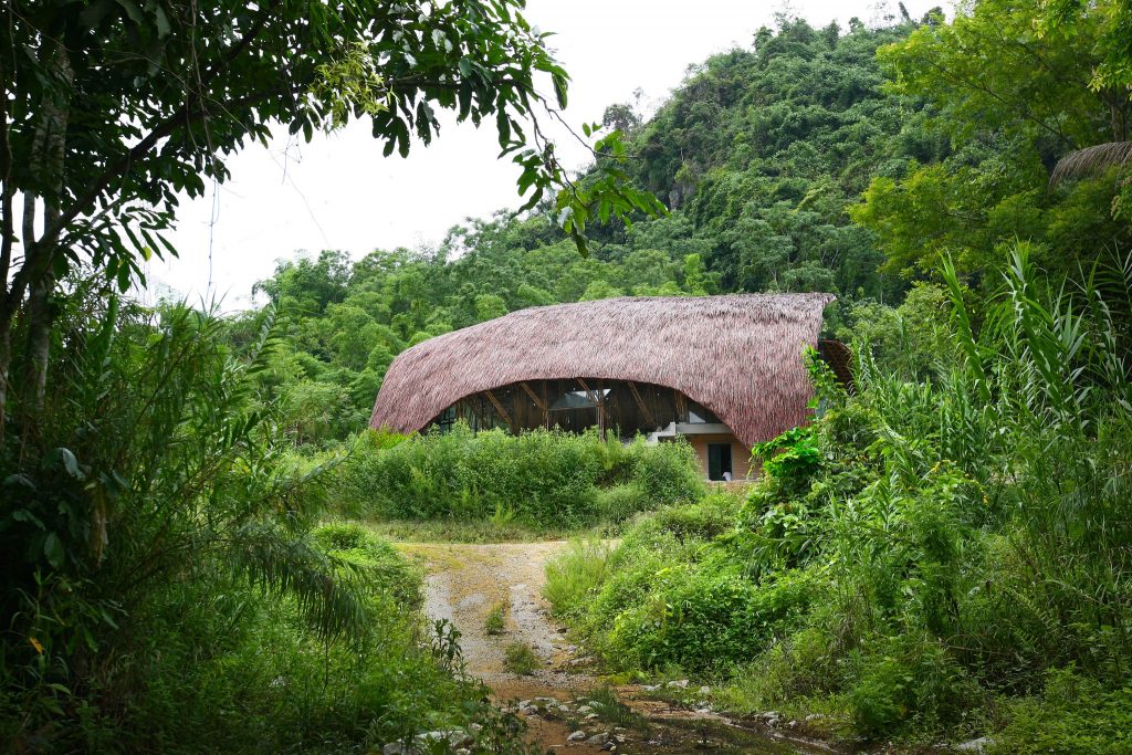 Nhà cộng đồng đáp ứng yêu cầu kiến trúc xanh nhờ sử dụng gạch không nung, cấu trúc khung tre, mái bằng gỗ và lá cọ, kiểm soát ảnh hưởng của bức xạ mặt trời hướng tây.