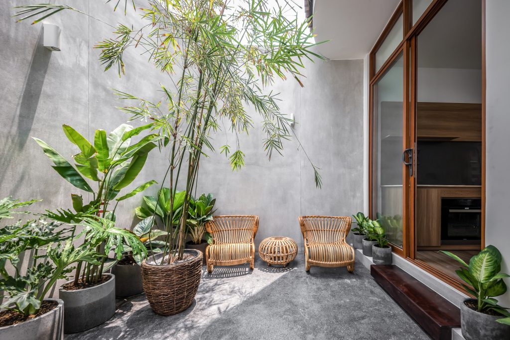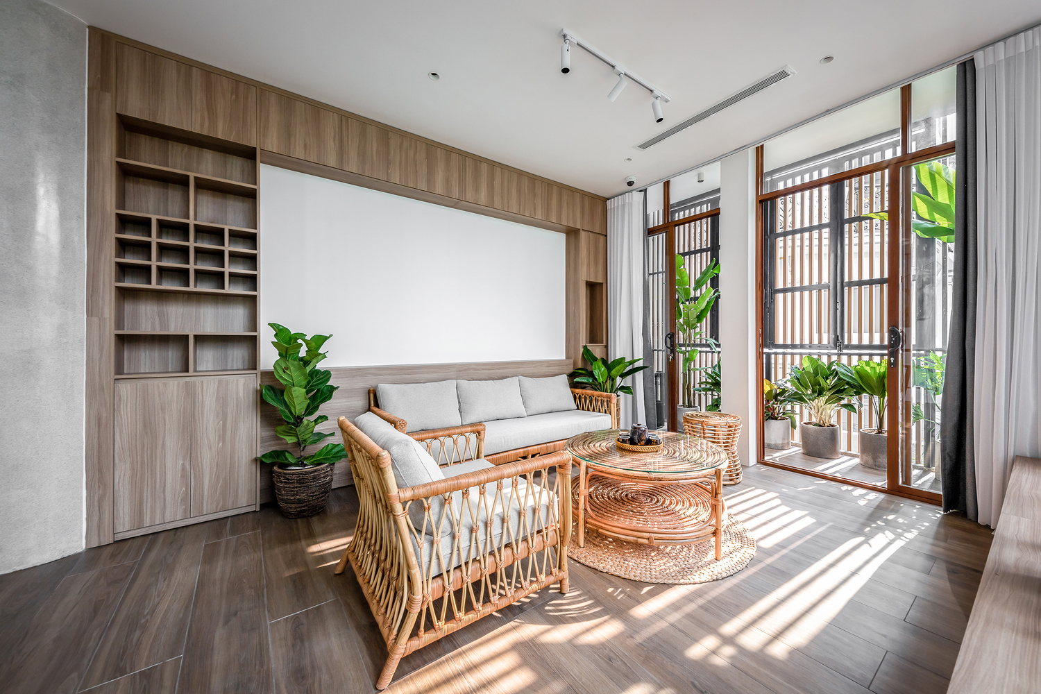 Phòng khách với mảng kính lớn và cây xanh xung quanh giúp tầm nhìn được mở rộng và tạo sự thoải mái khi sống trong không gian nhỏ.