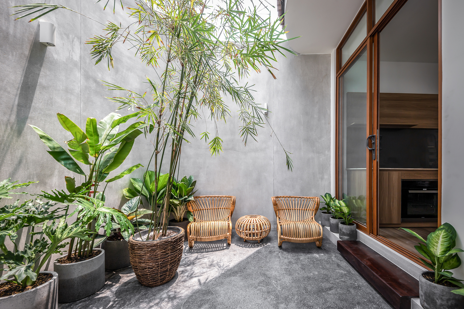 Khoảng sân cùng với cây xanh gắn liền với không gian bếp và phòng ăn giúp gia chủ thư giãn hơn khi dùng bữa một mình.