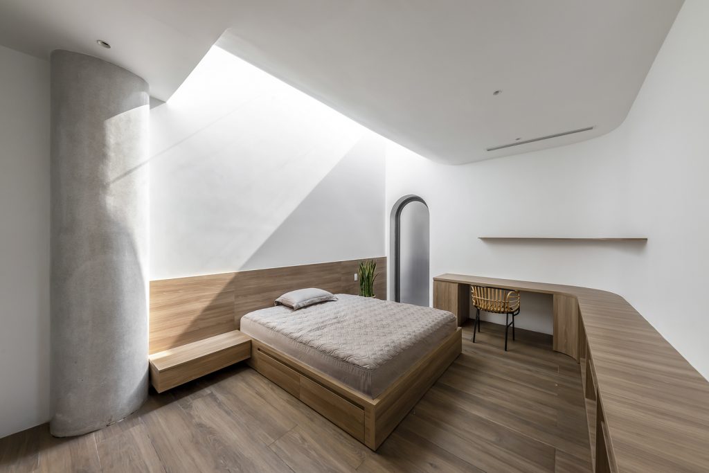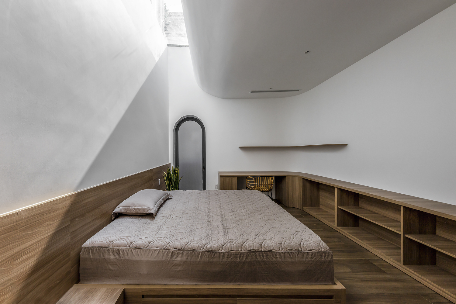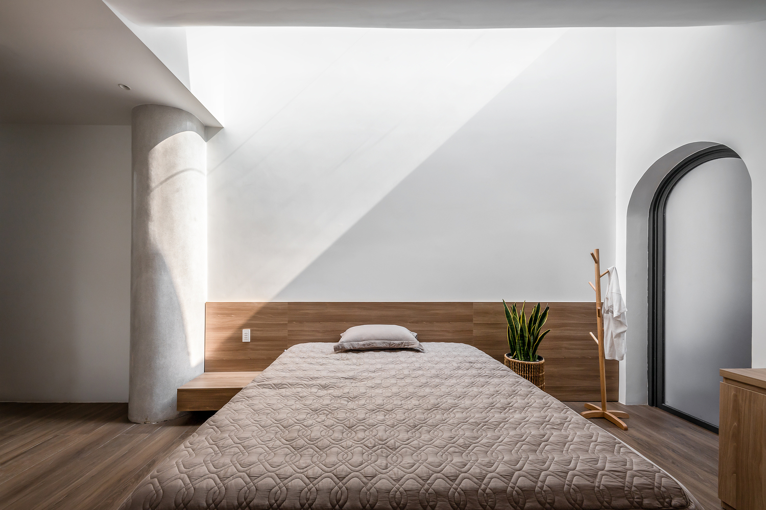 Riêng phòng ngủ được thiết kế để gia chủ có thể ngắm nhìn bầu trời thư giãn trước khi chìm vào giấc ngủ và ánh nắng sớm sẽ đánh thức anh ấy dậy thay vì chuông báo thức của điện thoại.