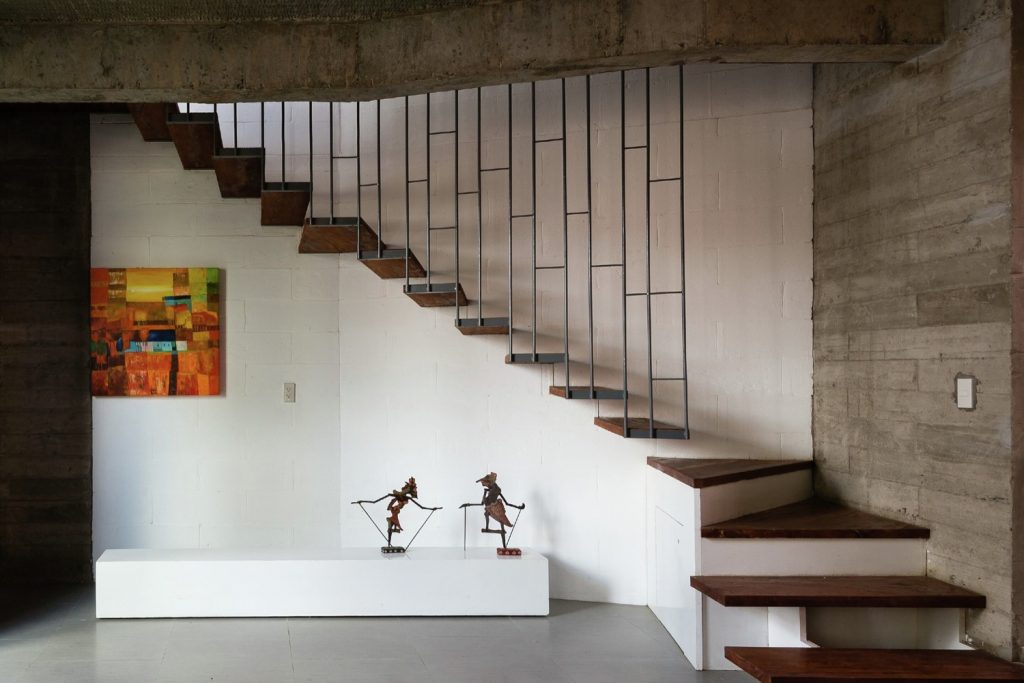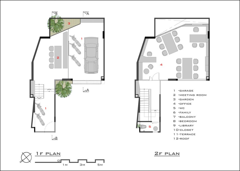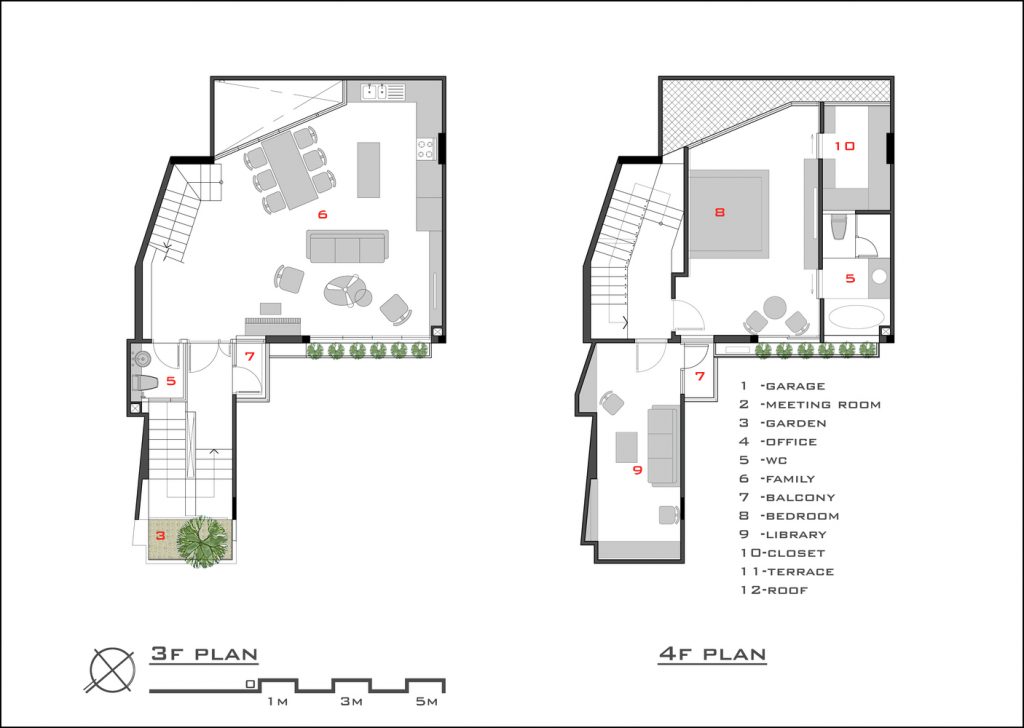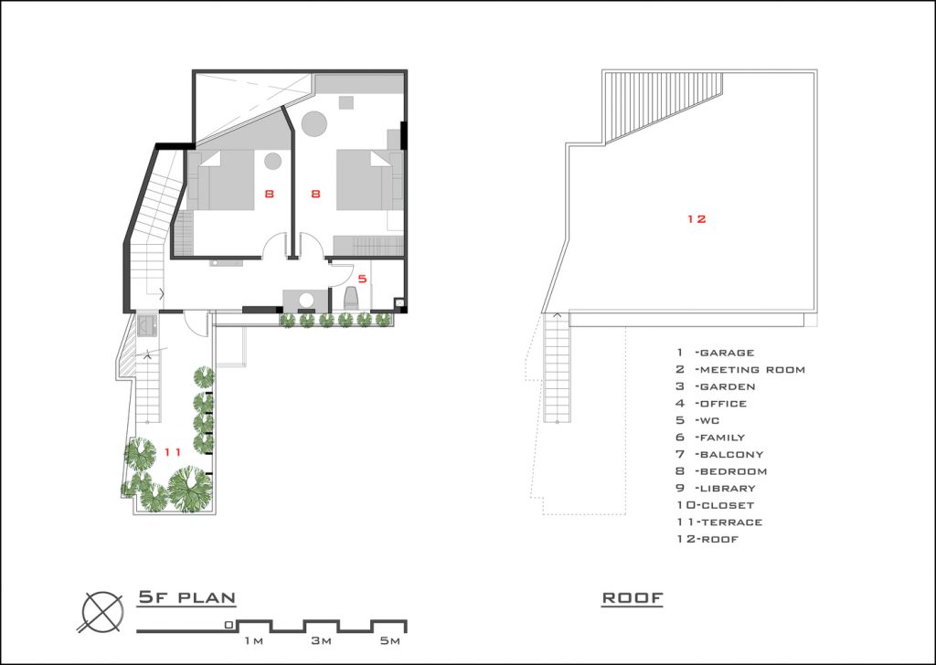 Ngôi nhà có năm tầng, kết hợp nhiều công năng bao gồm văn phòng, nơi ở và thư giãn. Công trình tuy có lối đi liên hoàn nhưng vẫn tiện nghi nhờ cách bố trí sảnh, chiếu nghỉ, kích thước và chất liệu cầu thang hợp lý. Các khu vực chức năng được phân định rõ ràng, đảm bảo sự riêng tư cần thiết cho sinh hoạt của gia đình.