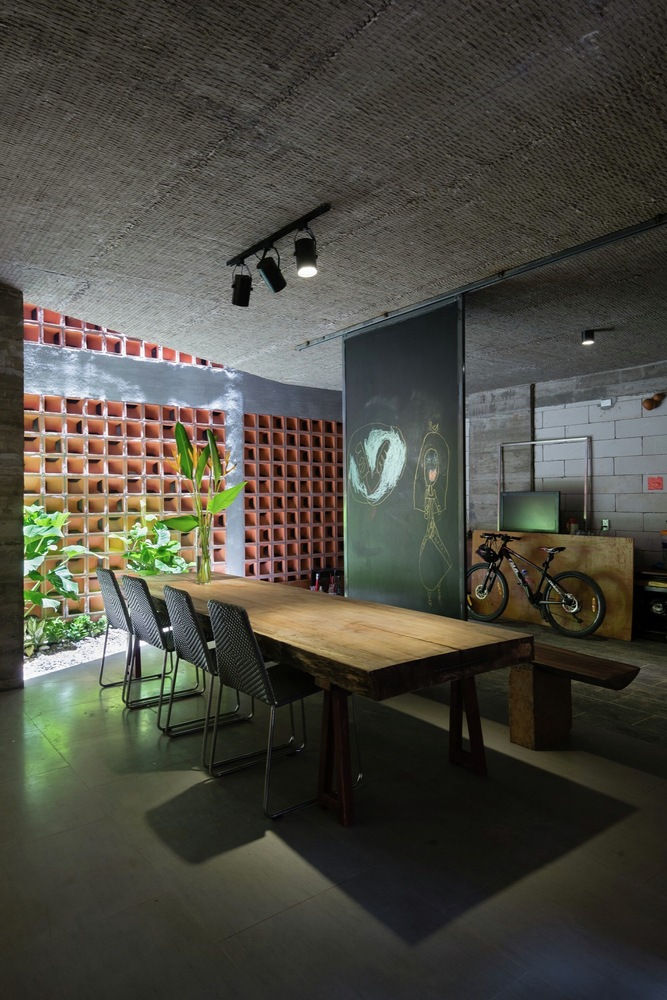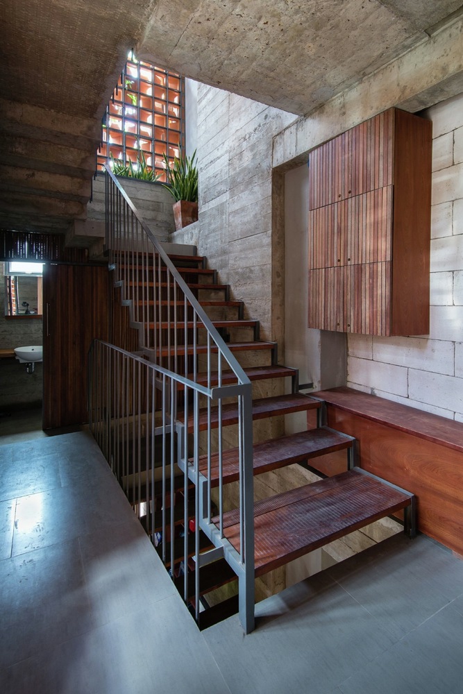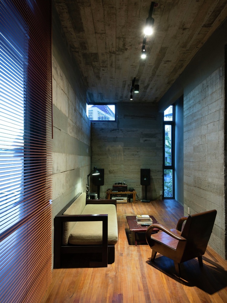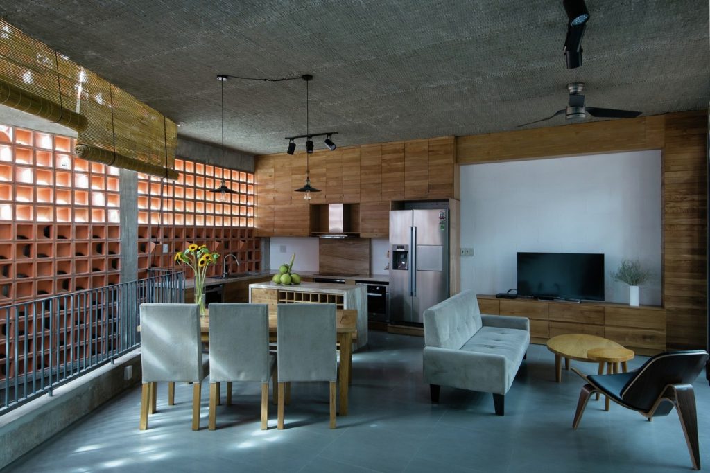Nhà thiết kế đã giữ nguyên lớp phên tre mộc mạc khi đổ trần bê tông giúp trần nhà mát mẻ hơn. Sau khi sử dụng làm ván khuôn, gỗ tự nhiên được tái chế để làm đồ nội thất, cửa chính, cửa sổ … Với ba tầng, khu vực tiếp khách là một nơi ấm cúng với đầy đủ không gian đón tiếp, thư giãn và giải trí.