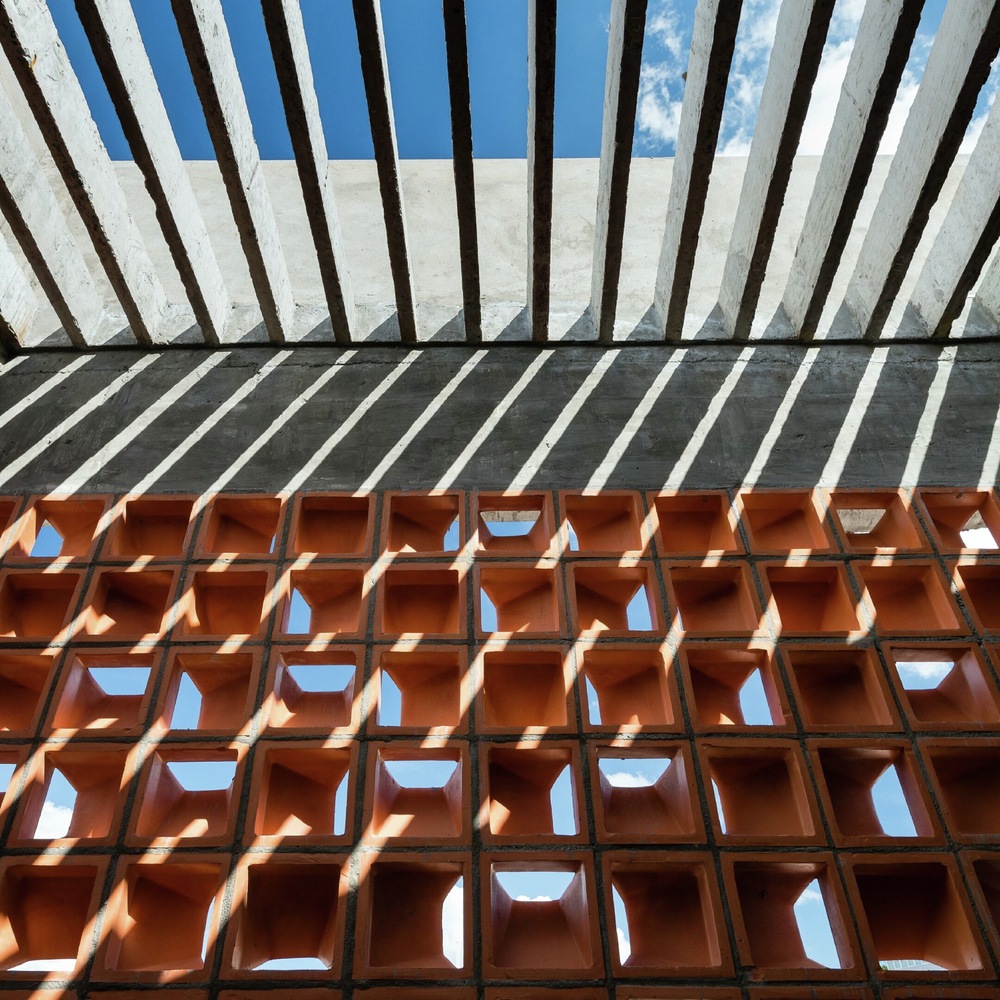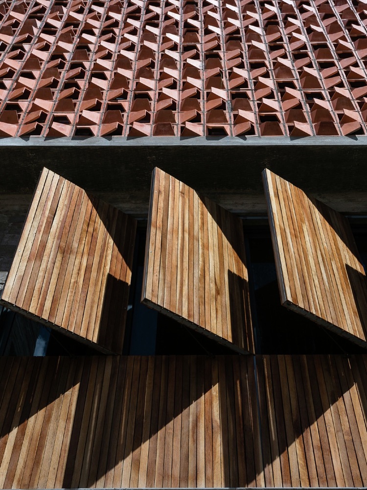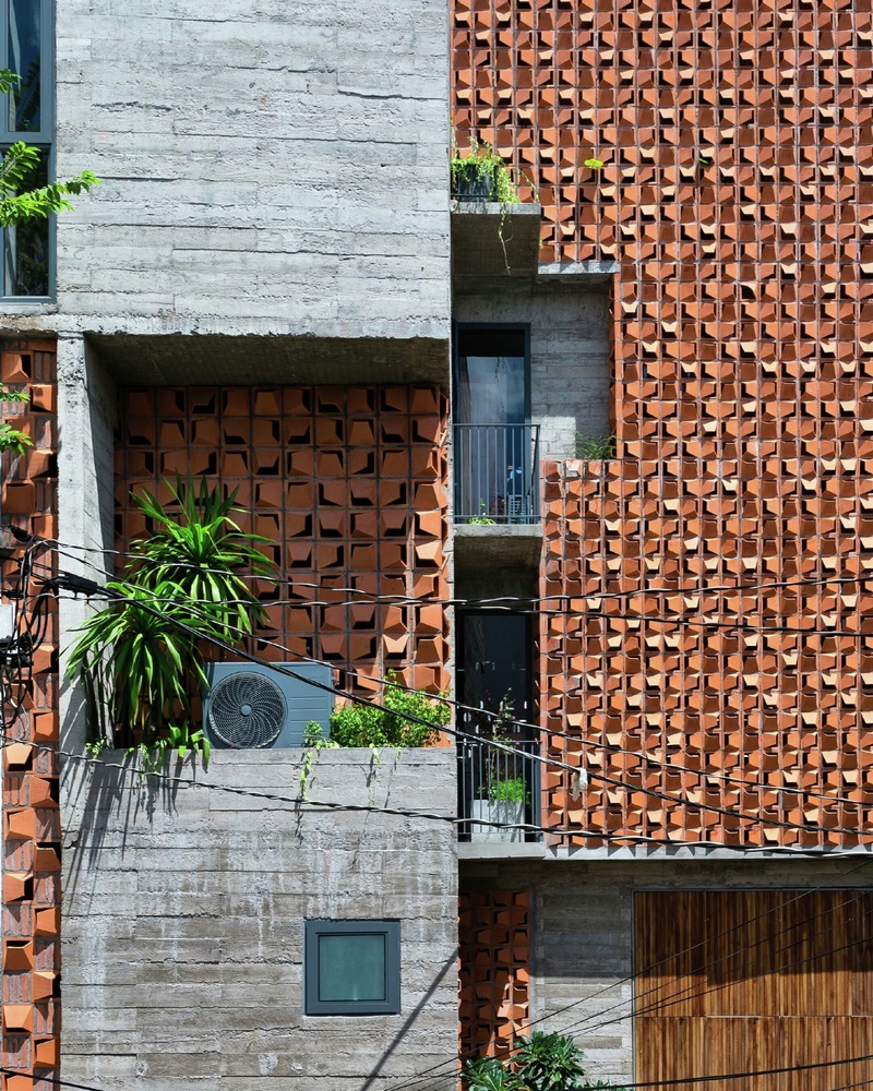 Ở mặt tiền, kiến ​​trúc sư sử dụng giải pháp hai lớp da, với lớp vỏ ngoài bằng gạch thông gió, được mở rộng thêm một góc vát. Cách bố trí gạch theo nhiều chiều ngẫu hứng tạo nên nhịp điệu độc đáo cho công trình mặt tiền và hiệu ứng thị giác cho bên trong với ánh nắng. Cây xanh được đưa vào công trình một cách tự nhiên ở các khoảng đệm, hành lang, ban công, giếng trời như một giải pháp làm mát và phủ xanh.
