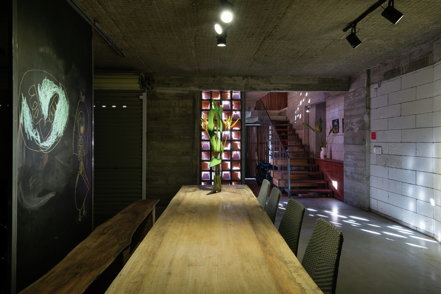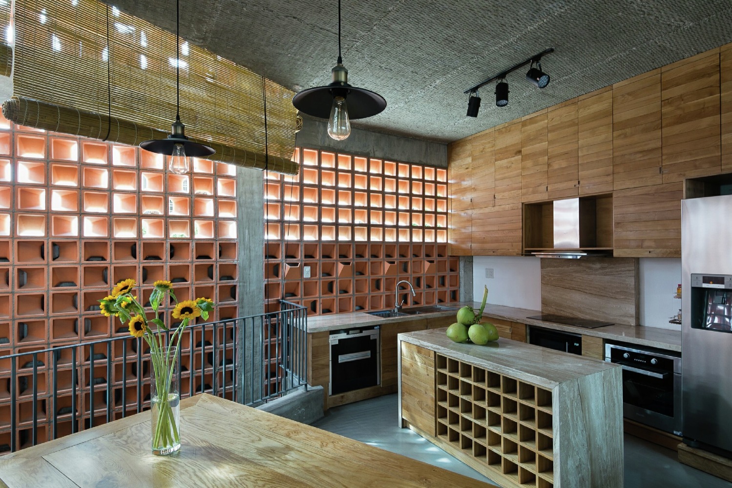 Nhà thiết kế đã giữ nguyên lớp phên tre mộc mạc khi đổ trần bê tông giúp trần nhà mát mẻ hơn. Sau khi sử dụng làm ván khuôn, gỗ tự nhiên được tái chế để làm đồ nội thất, cửa chính, cửa sổ … Với ba tầng, khu vực tiếp khách là một nơi ấm cúng với đầy đủ không gian đón tiếp, thư giãn và giải trí.