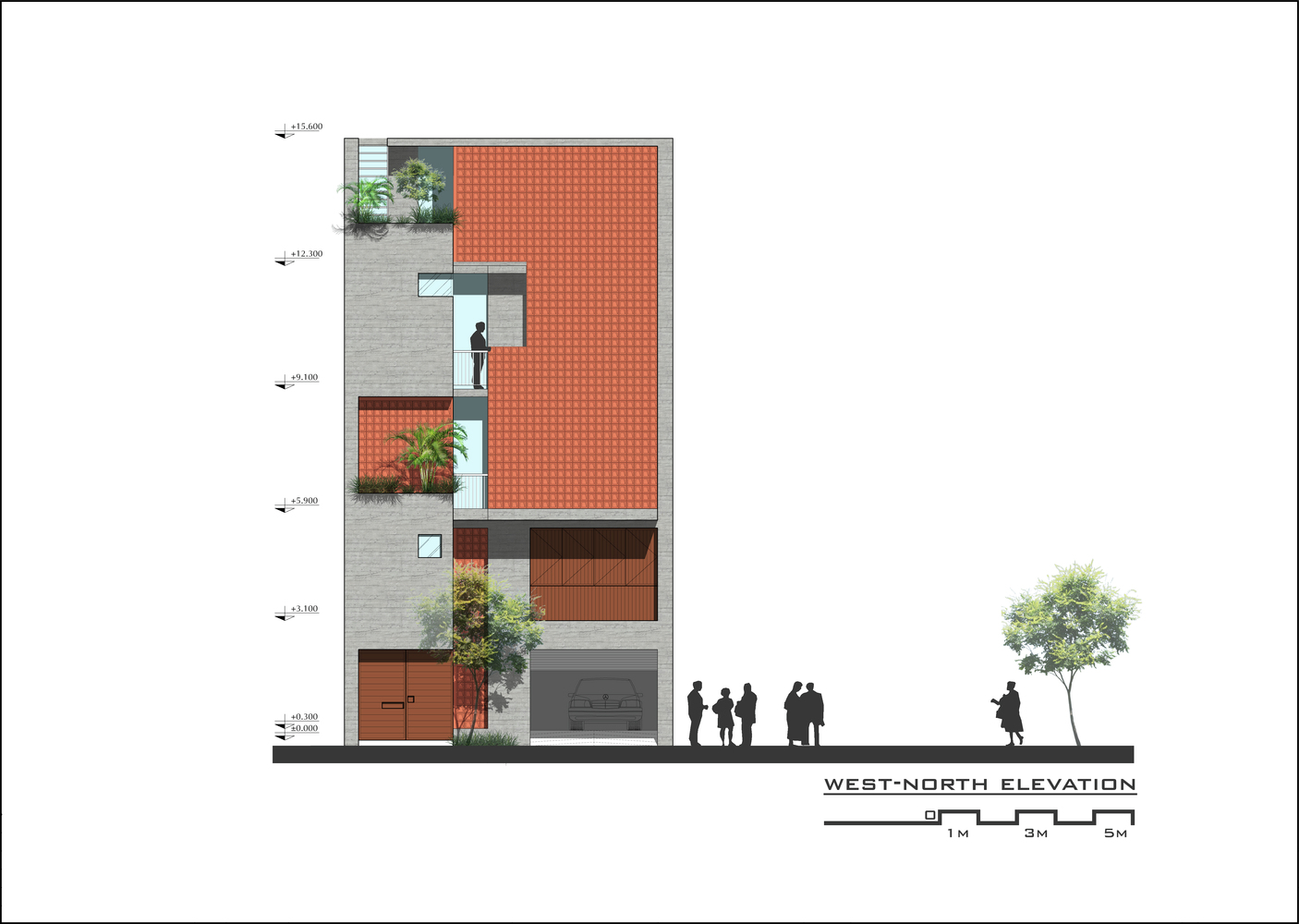 Ngôi nhà có năm tầng, kết hợp nhiều công năng bao gồm văn phòng, nơi ở và thư giãn. Công trình tuy có lối đi liên hoàn nhưng vẫn tiện nghi nhờ cách bố trí sảnh, chiếu nghỉ, kích thước và chất liệu cầu thang hợp lý. Các khu vực chức năng được phân định rõ ràng, đảm bảo sự riêng tư cần thiết cho sinh hoạt của gia đình.