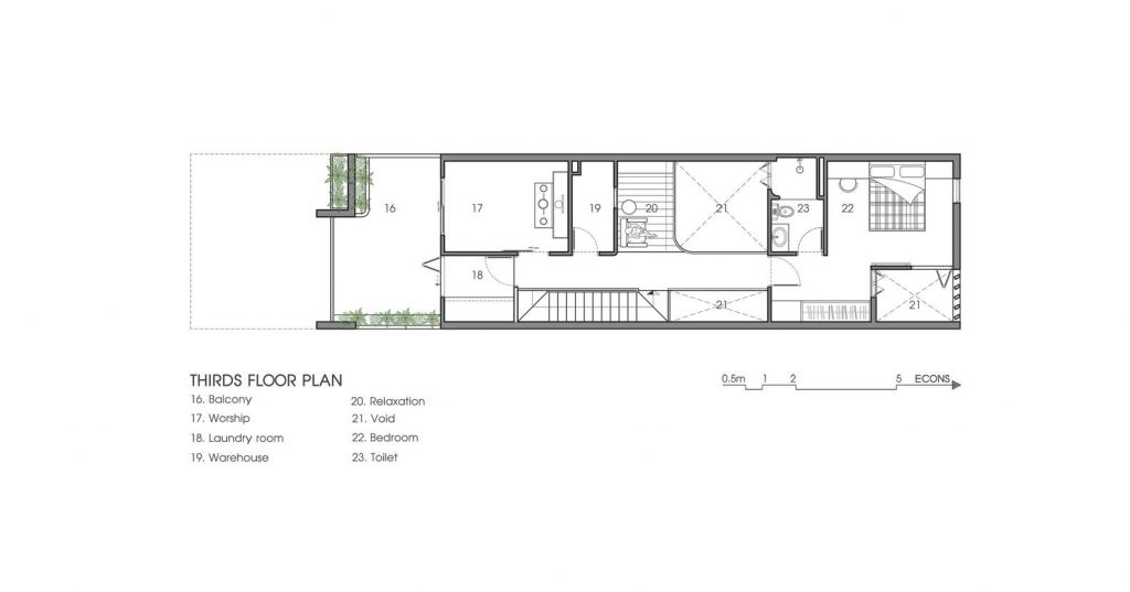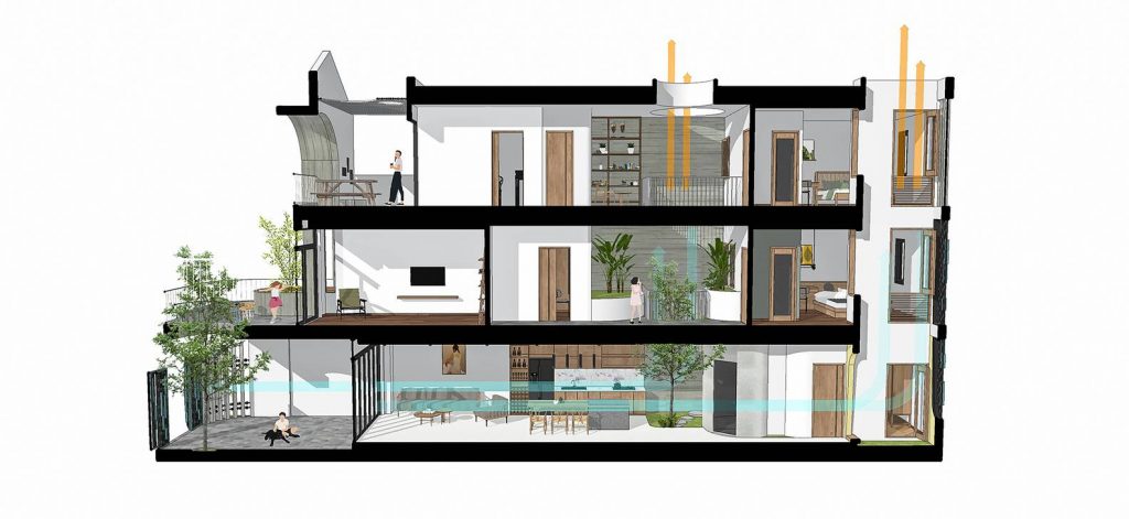 Với việc bố trí không gian chung tầng 1 và các không gian sân vườn, các KTS mong muốn thúc đẩy sự giao lưu, kết nối giữa những người sống trong nhà, tại các khu vực thông tầng mọi người đều có thể giao lưu với các không gian khác trong nhà. Từ đó khuyến khích các hoạt động chung của gia đình.