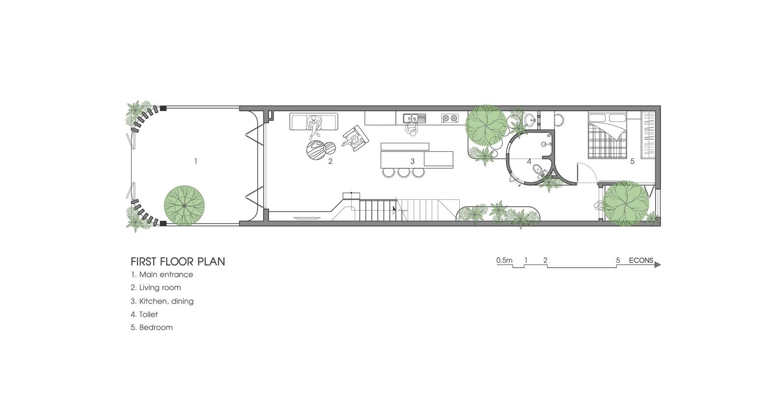 Với việc bố trí không gian chung tầng 1 và các không gian sân vườn, các KTS mong muốn thúc đẩy sự giao lưu, kết nối giữa những người sống trong nhà, tại các khu vực thông tầng mọi người đều có thể giao lưu với các không gian khác trong nhà. Từ đó khuyến khích các hoạt động chung của gia đình.