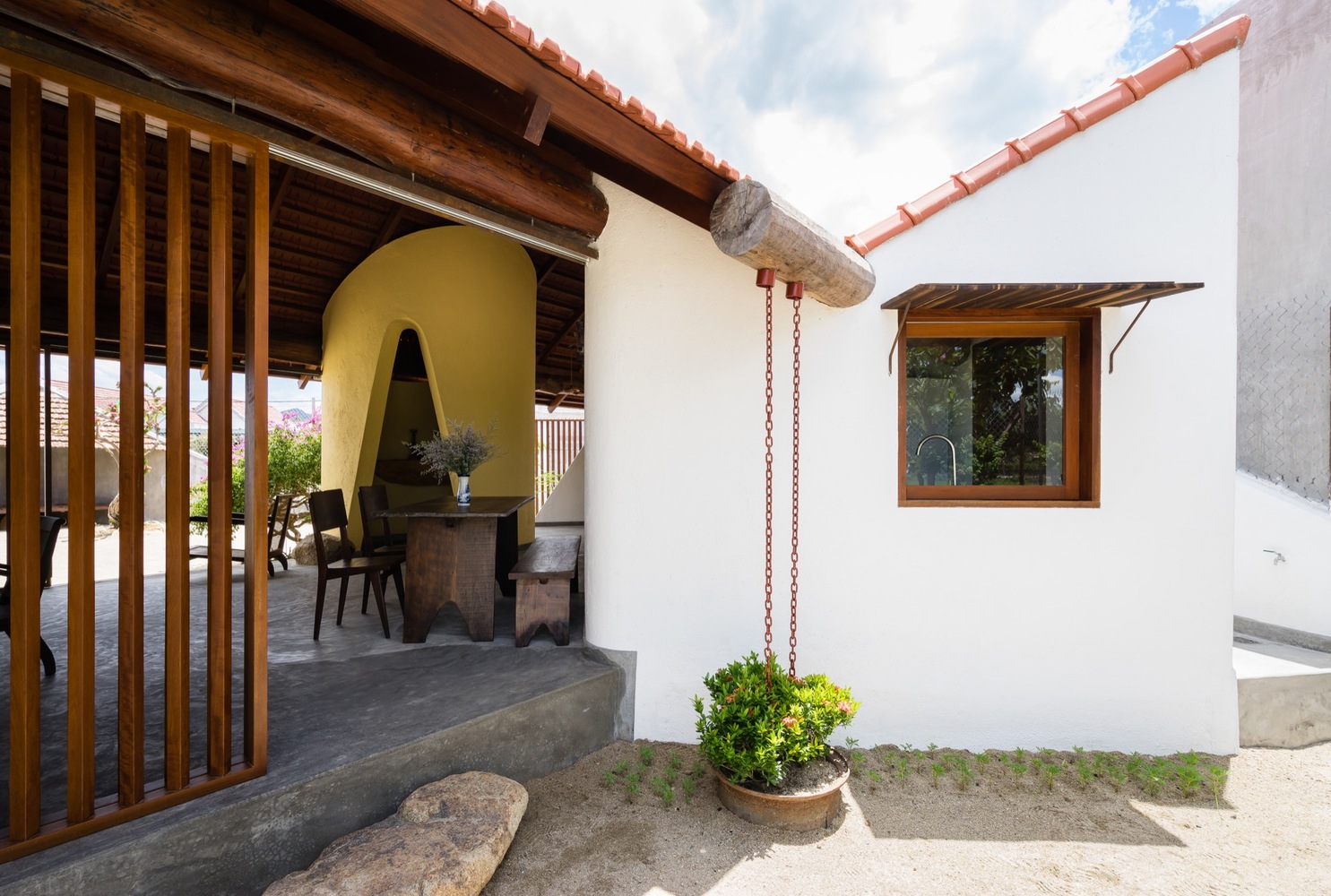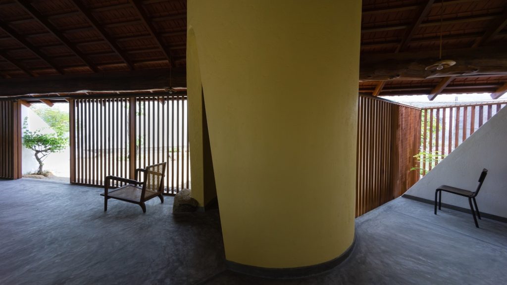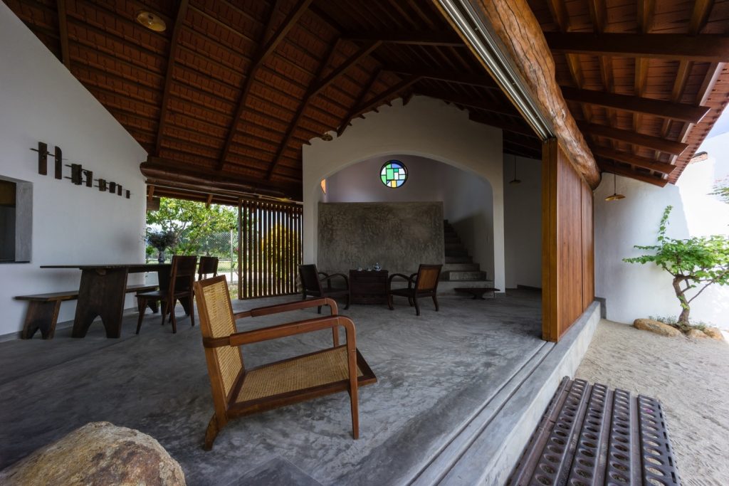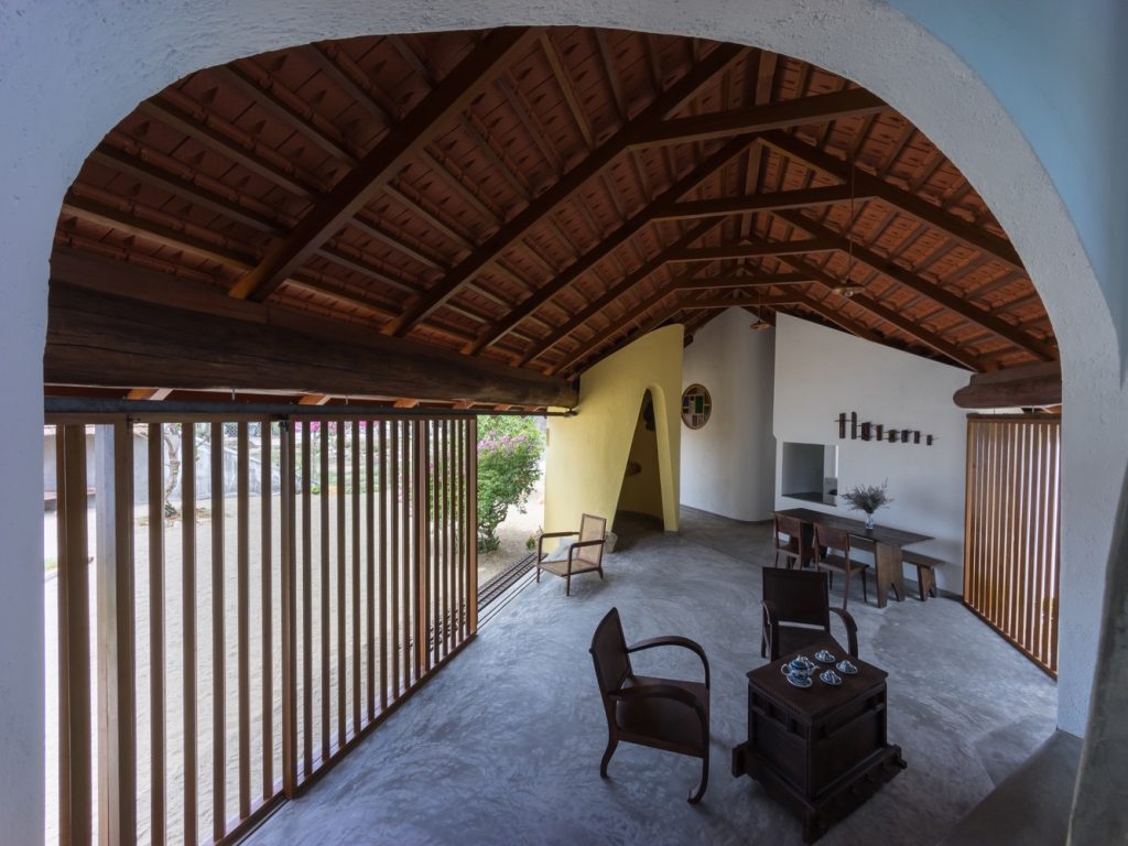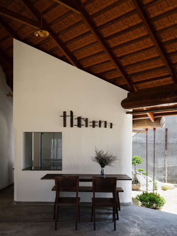 Từ đây, tất cả các tầm nhìn bên trong ngôi nhà và hướng ra khu vườn được đóng khung như những bức tranh nhờ vào sự kết hợp của các yếu tố như tường gạch trắng, dầm gỗ, khe hở và mái nhà.