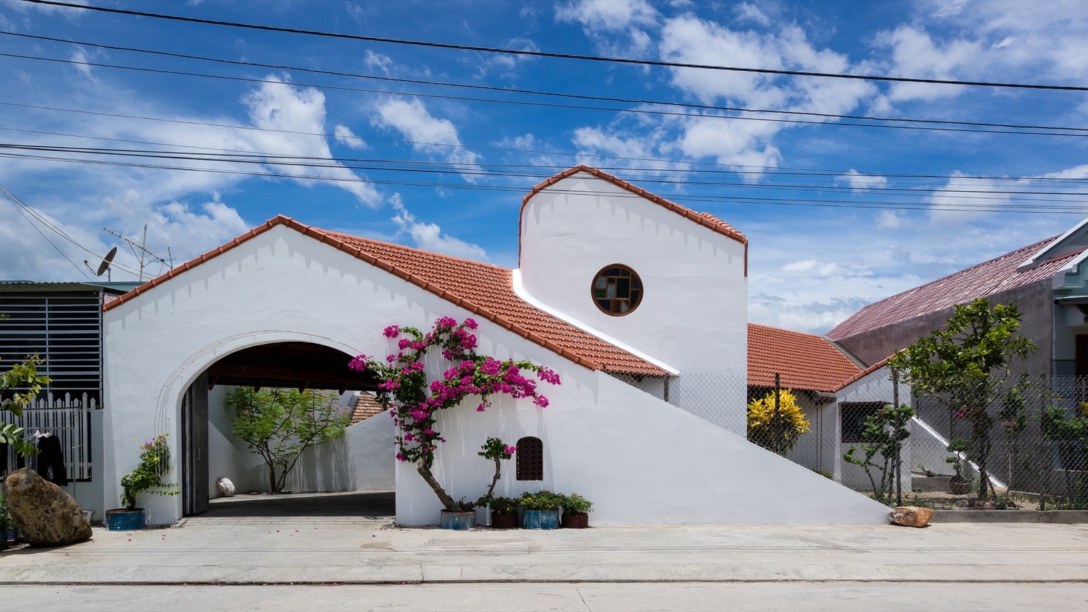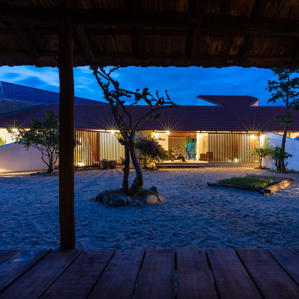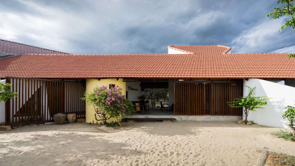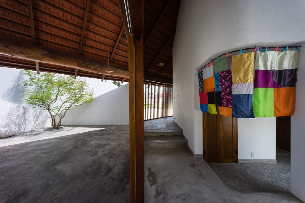 Từ đây, tất cả các tầm nhìn bên trong ngôi nhà và hướng ra khu vườn được đóng khung như những bức tranh nhờ vào sự kết hợp của các yếu tố như tường gạch trắng, dầm gỗ, khe hở và mái nhà.