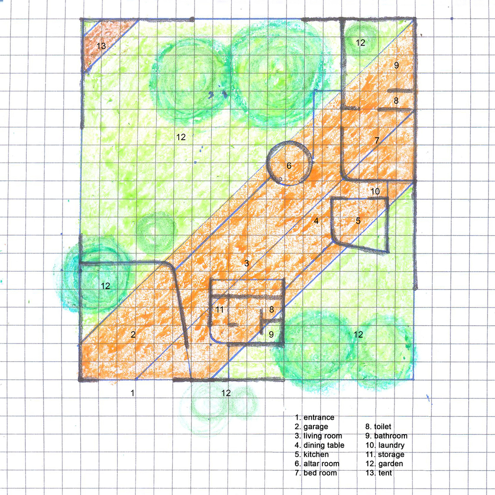 Là một khối nhà có đường chéo 45 độ, chia mặt bằng 18mx20m thành 2 khu vườn hình tam giác.