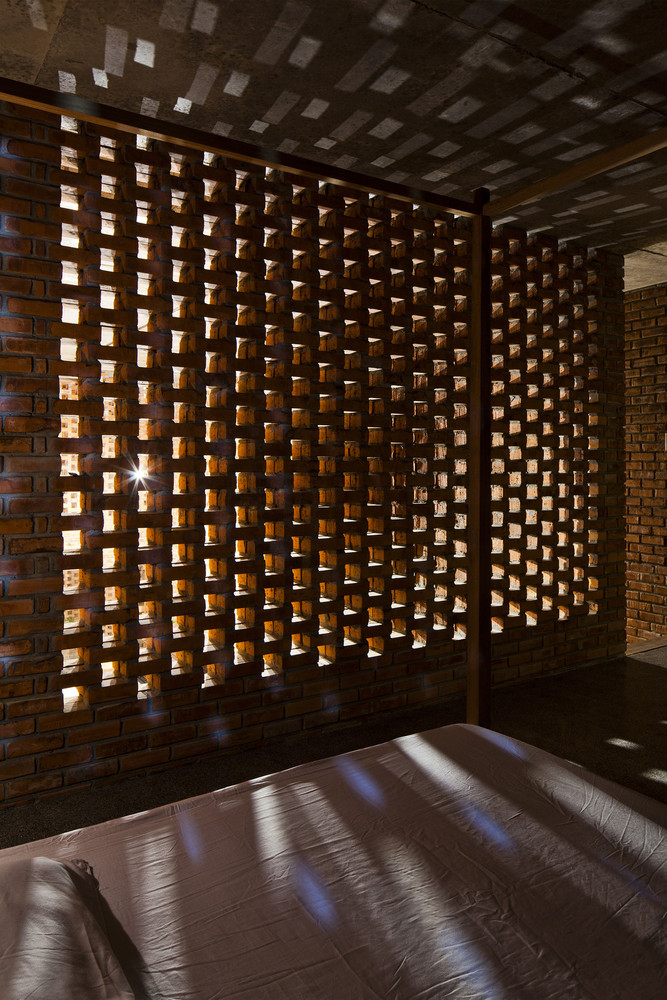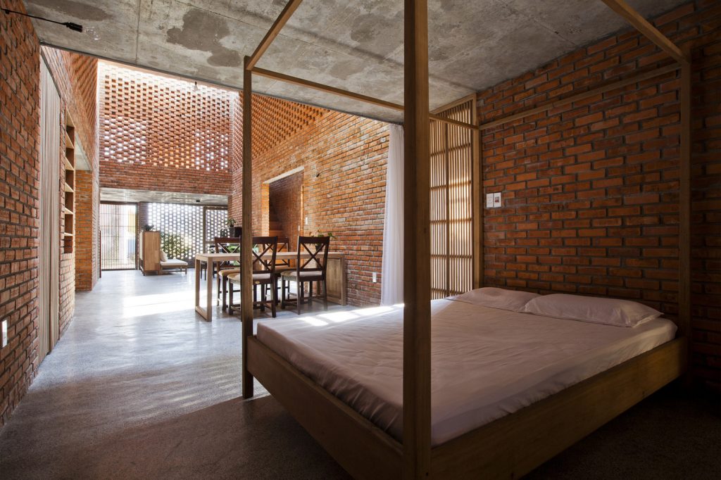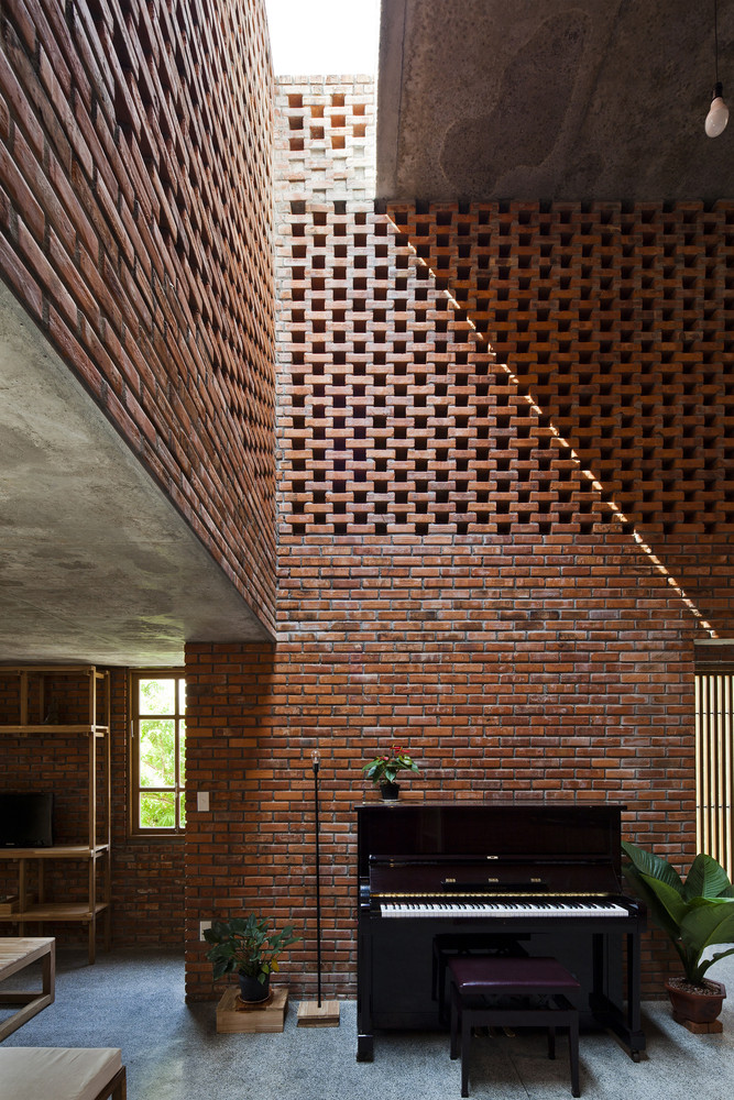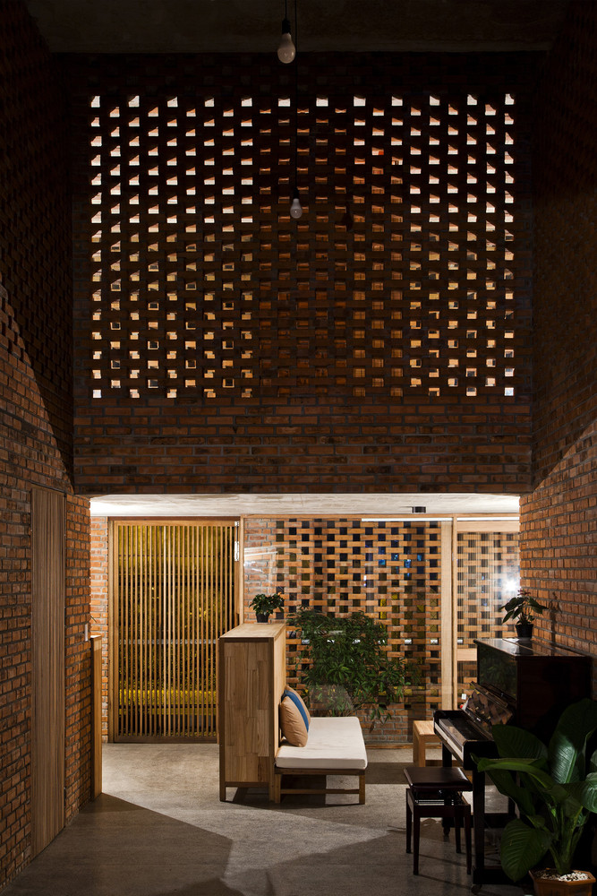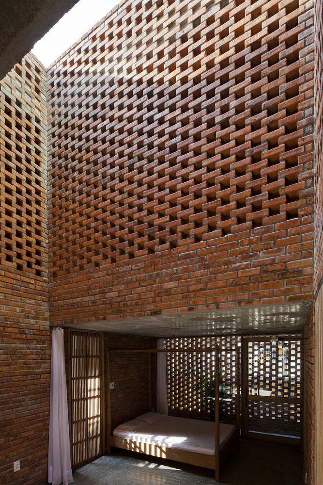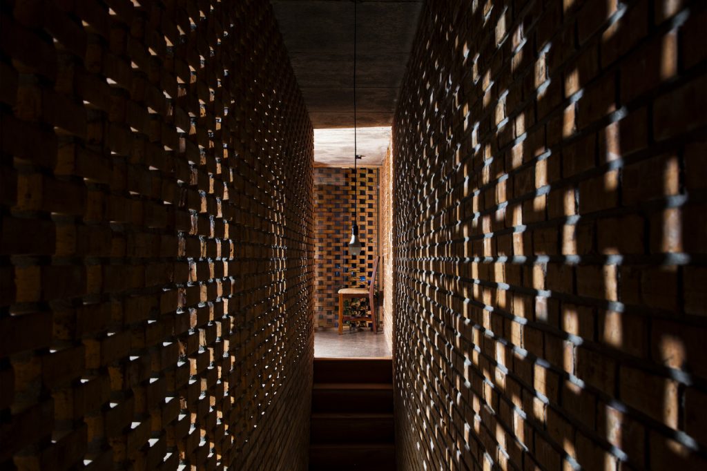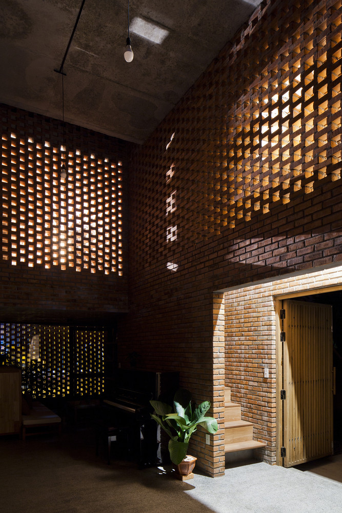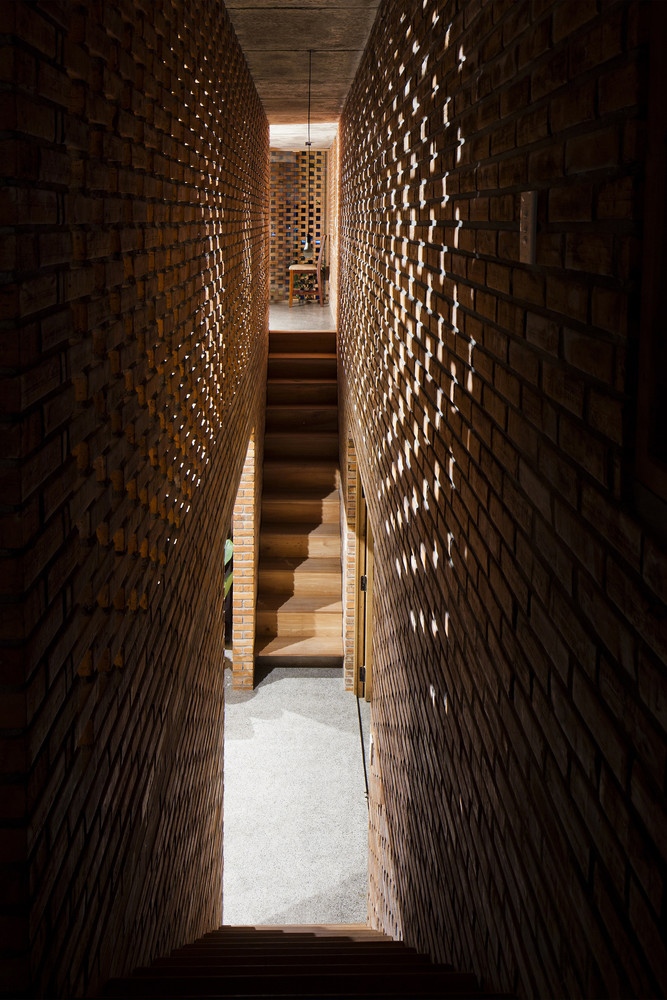 Thiết kế đặc biệt của những bức tường gạch nung với nhiều lỗ hổng cùng với khoảng thông tầng rộng lớn giúp gió và ánh sáng len lỏi đến mọi ngóc ngách trong nhà, ngay cả những khu vực khó tiếp cận nhất. Chủ nhân ngôi nhà cũng có thể tận hưởng bầu trời trong xanh vào ban ngày hoặc ánh trăng vào ban đêm từ phòng khách, bàn ăn hay nhà bếp.