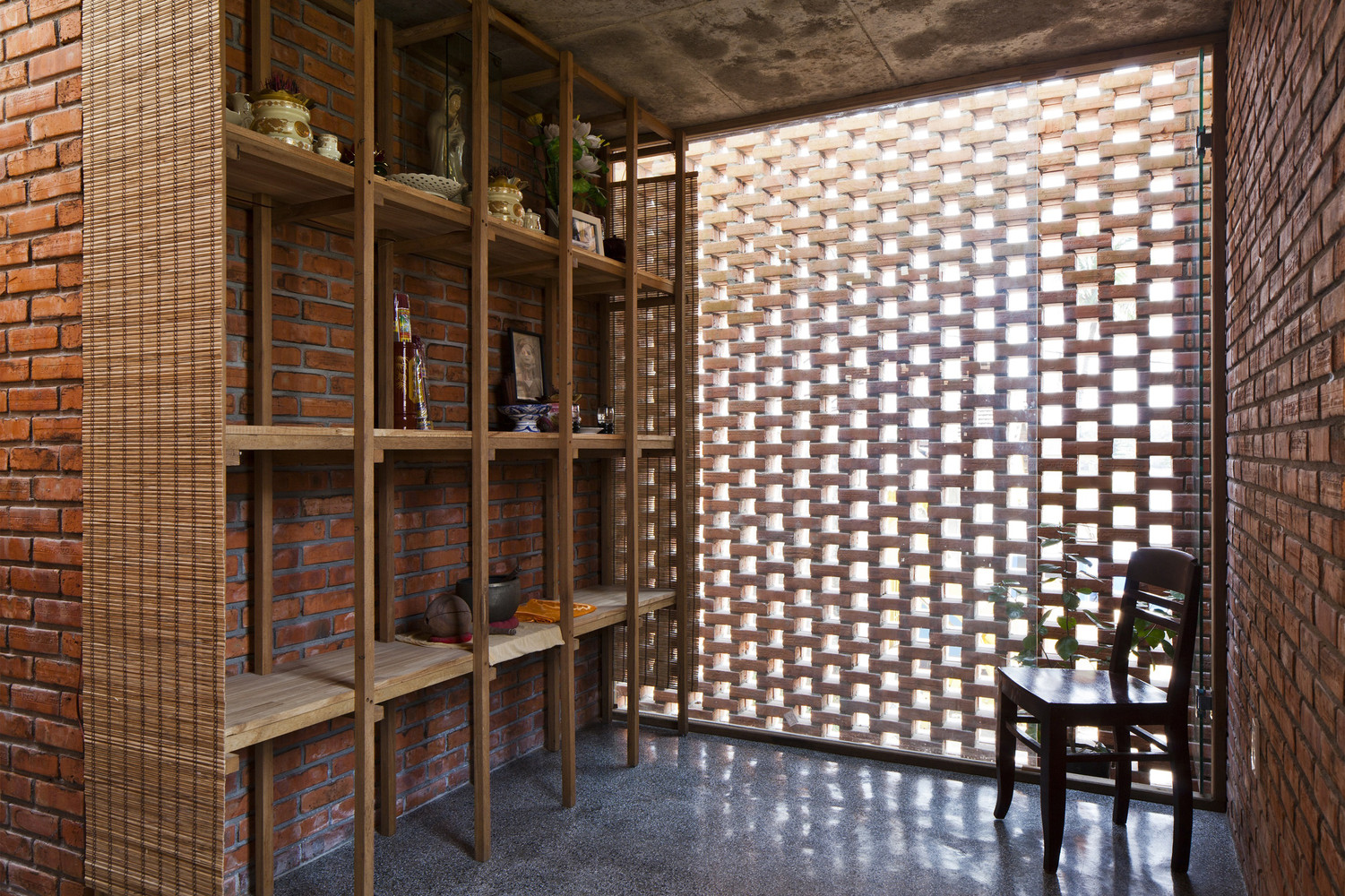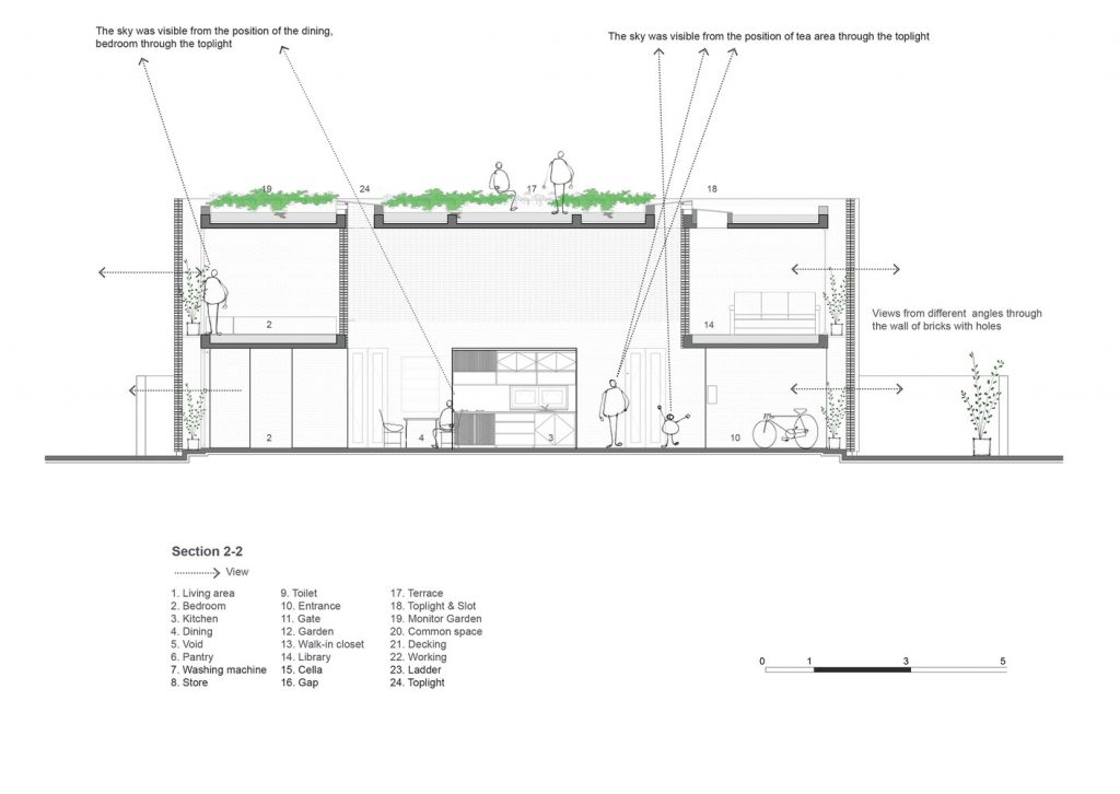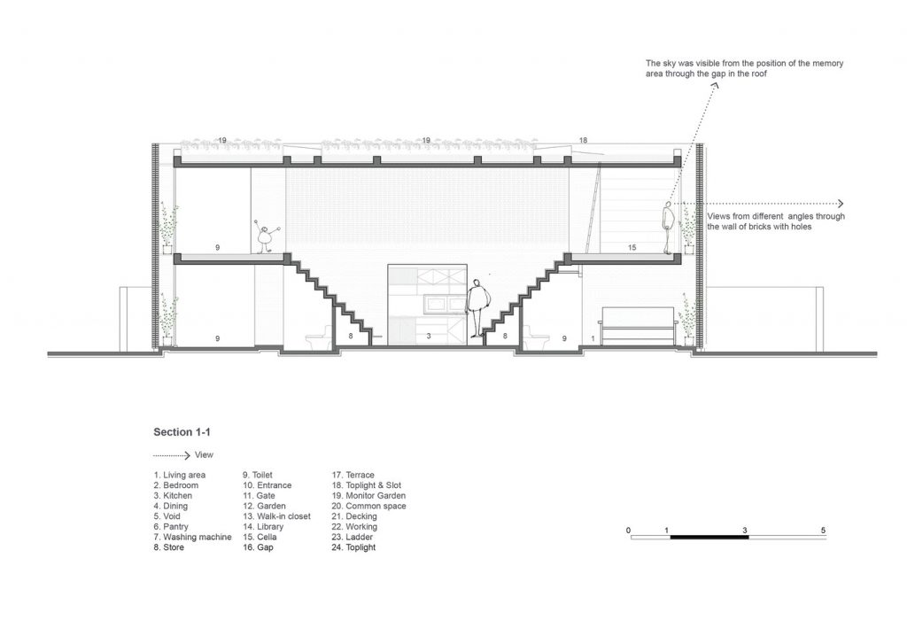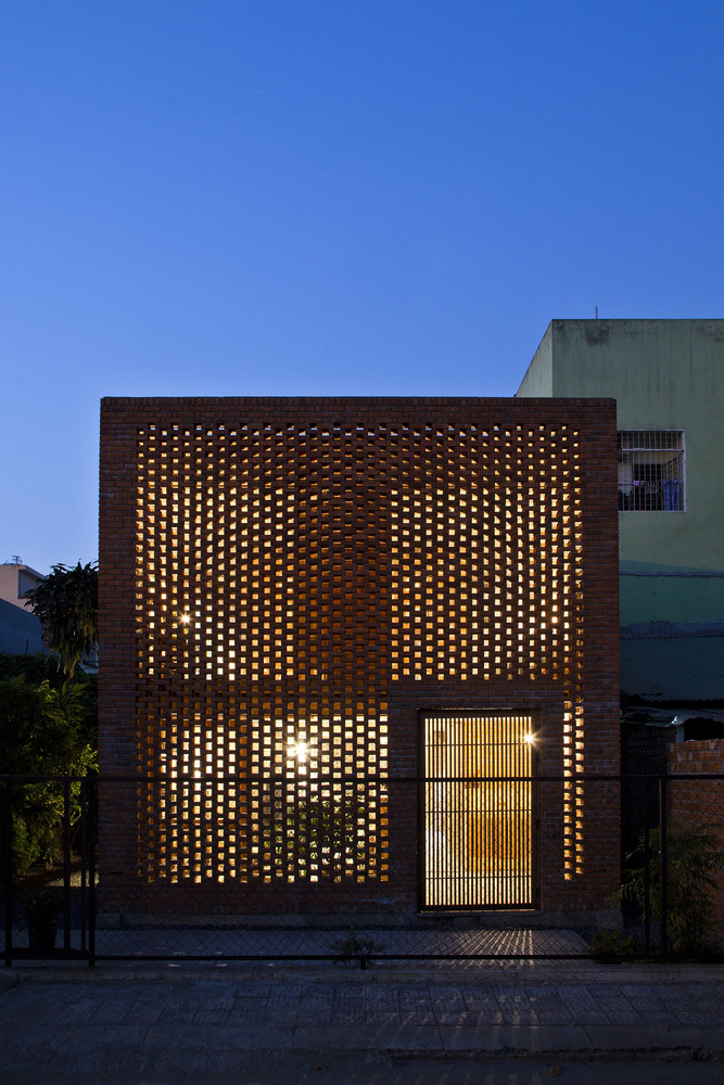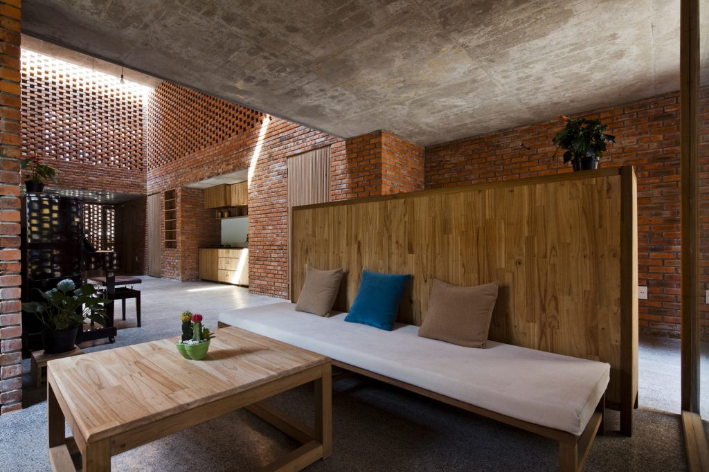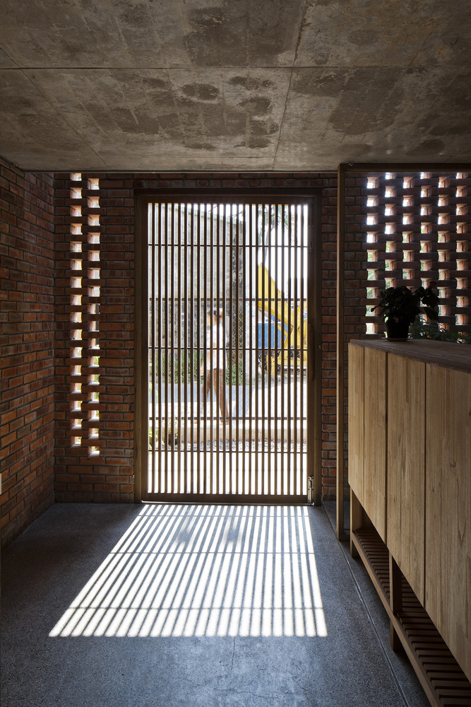 Thiết kế đặc biệt của những bức tường gạch nung với nhiều lỗ hổng cùng với khoảng thông tầng rộng lớn giúp gió và ánh sáng len lỏi đến mọi ngóc ngách trong nhà, ngay cả những khu vực khó tiếp cận nhất. Chủ nhân ngôi nhà cũng có thể tận hưởng bầu trời trong xanh vào ban ngày hoặc ánh trăng vào ban đêm từ phòng khách, bàn ăn hay nhà bếp.