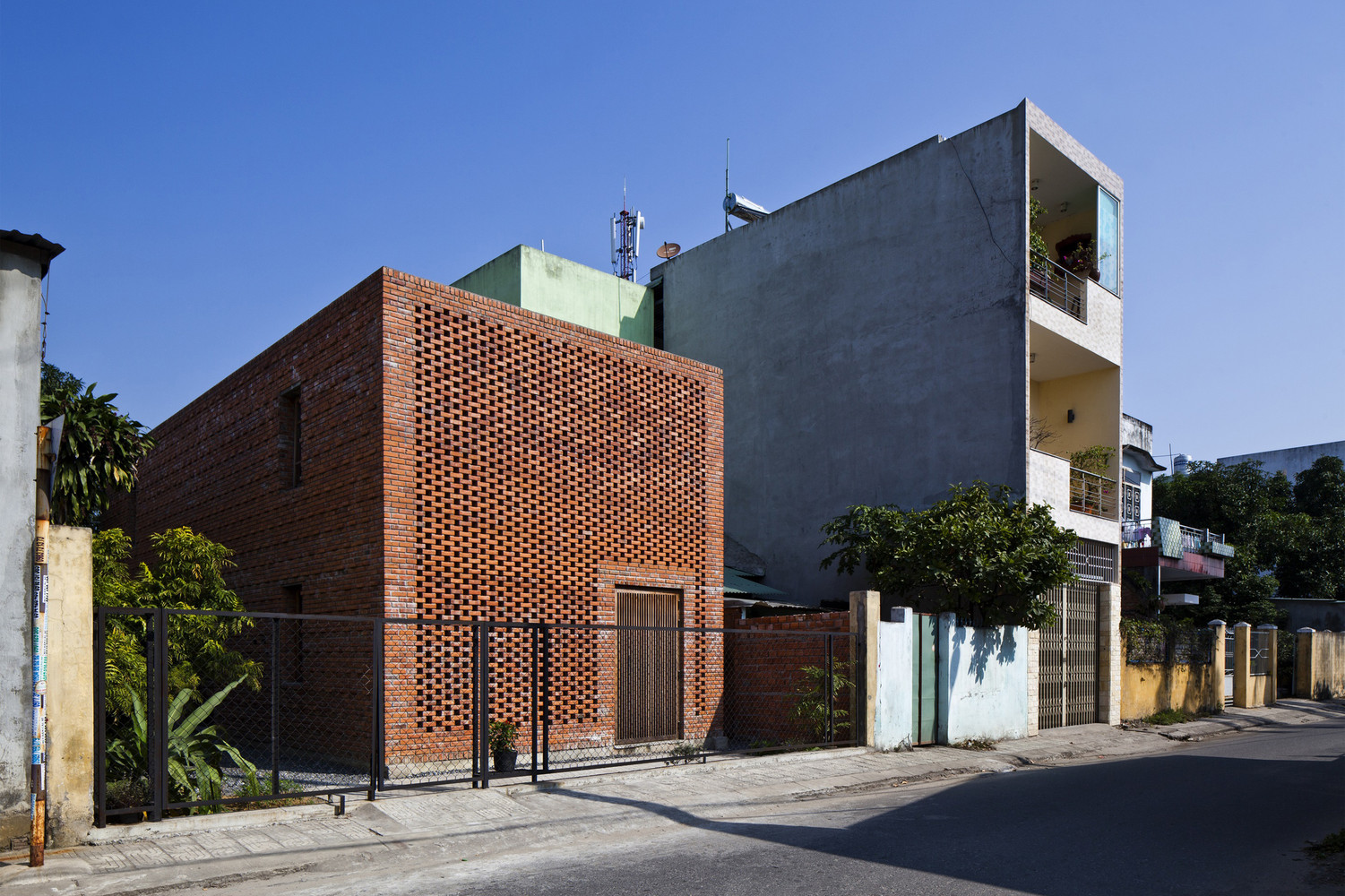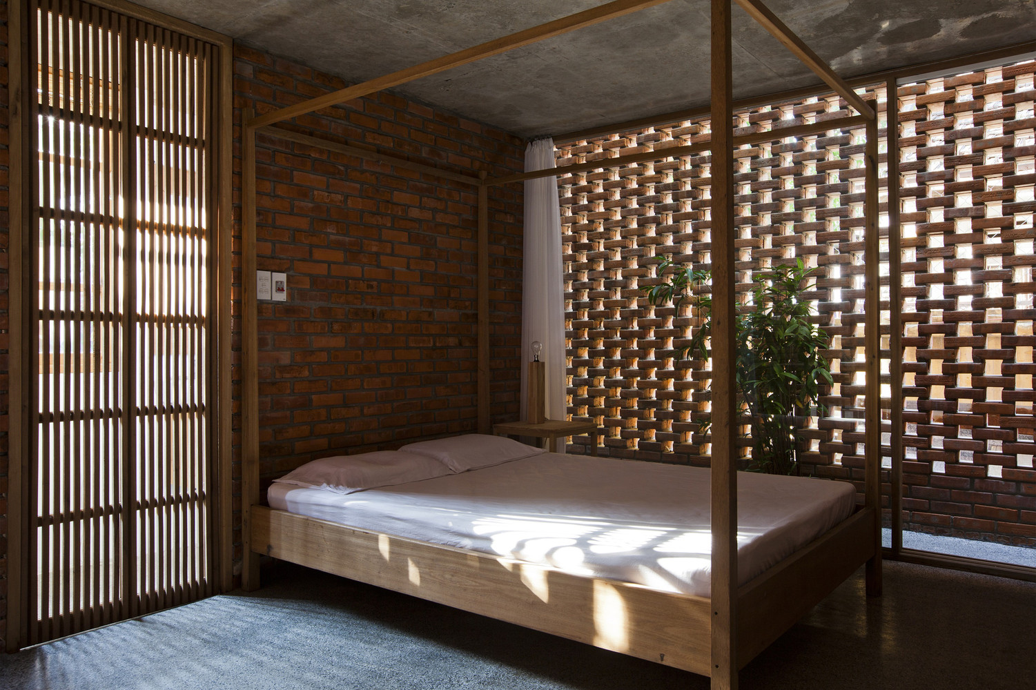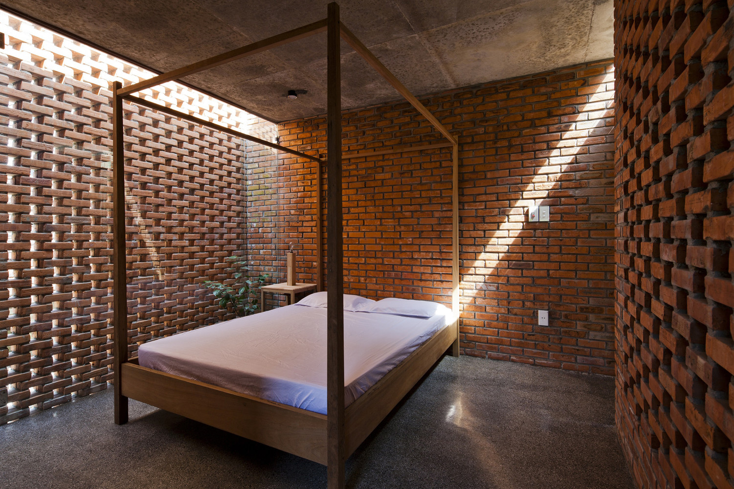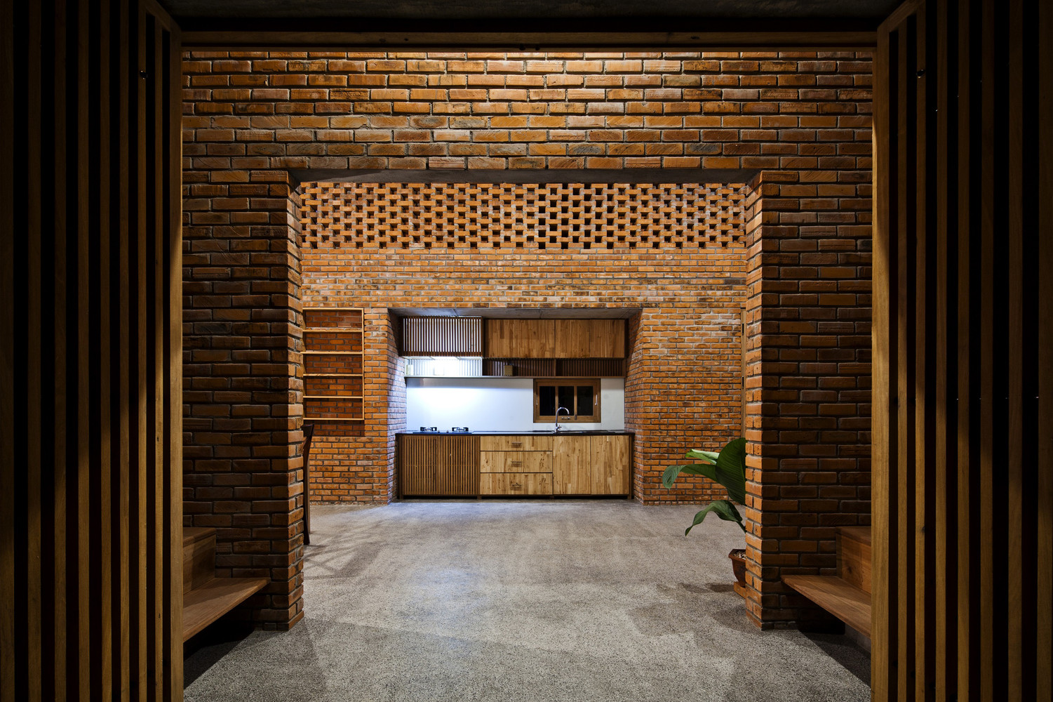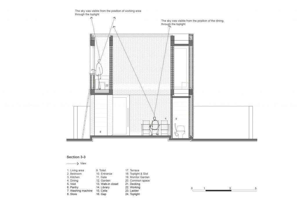 Thiết kế đặc biệt của những bức tường gạch nung với nhiều lỗ hổng cùng với khoảng thông tầng rộng lớn giúp gió và ánh sáng len lỏi đến mọi ngóc ngách trong nhà, ngay cả những khu vực khó tiếp cận nhất. Chủ nhân ngôi nhà cũng có thể tận hưởng bầu trời trong xanh vào ban ngày hoặc ánh trăng vào ban đêm từ phòng khách, bàn ăn hay nhà bếp.
