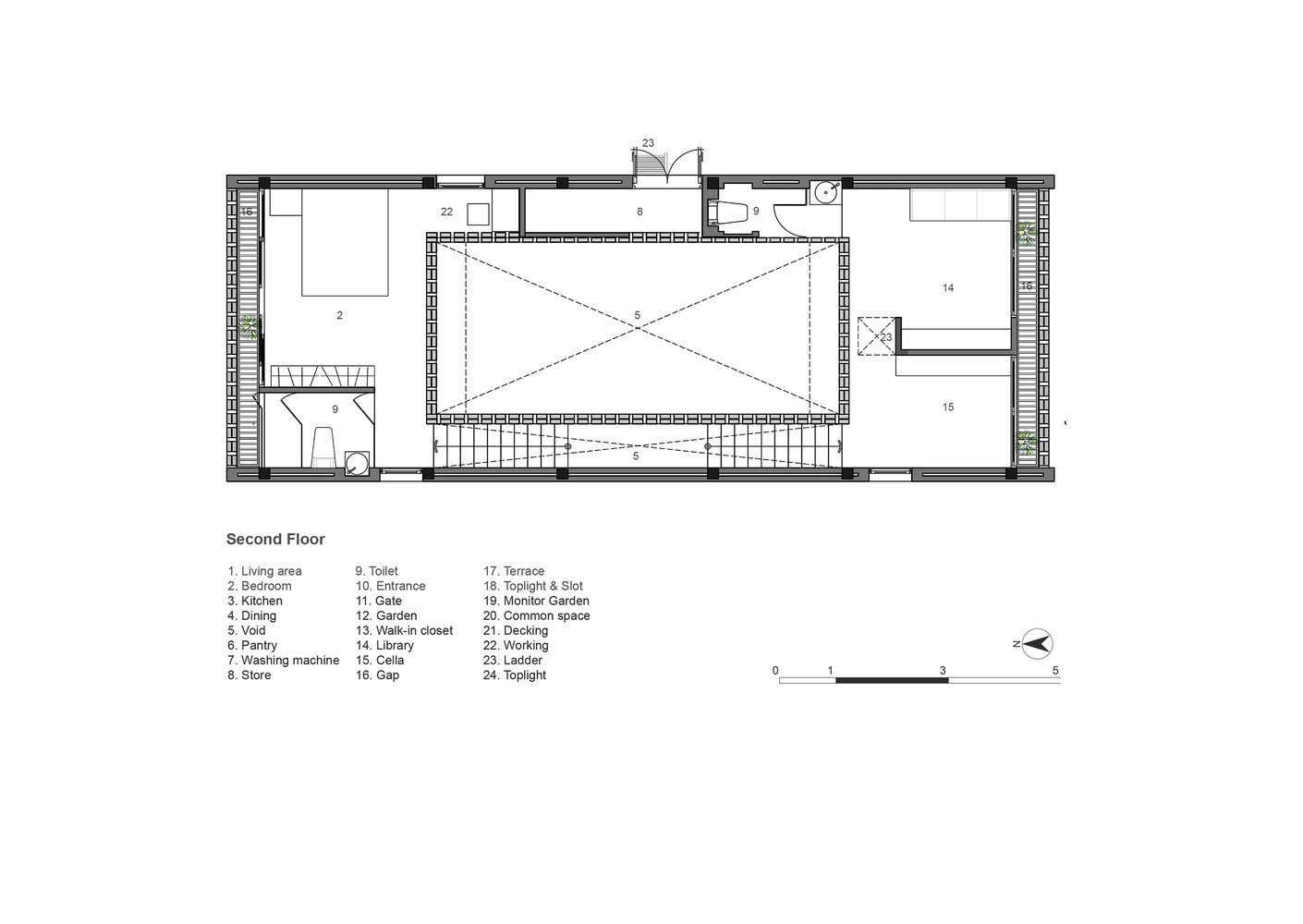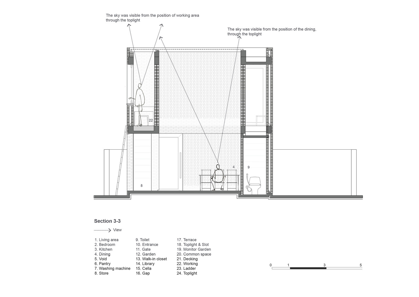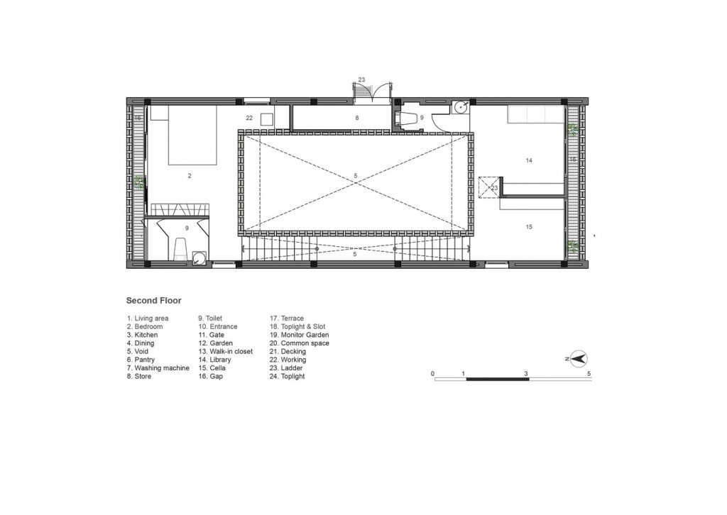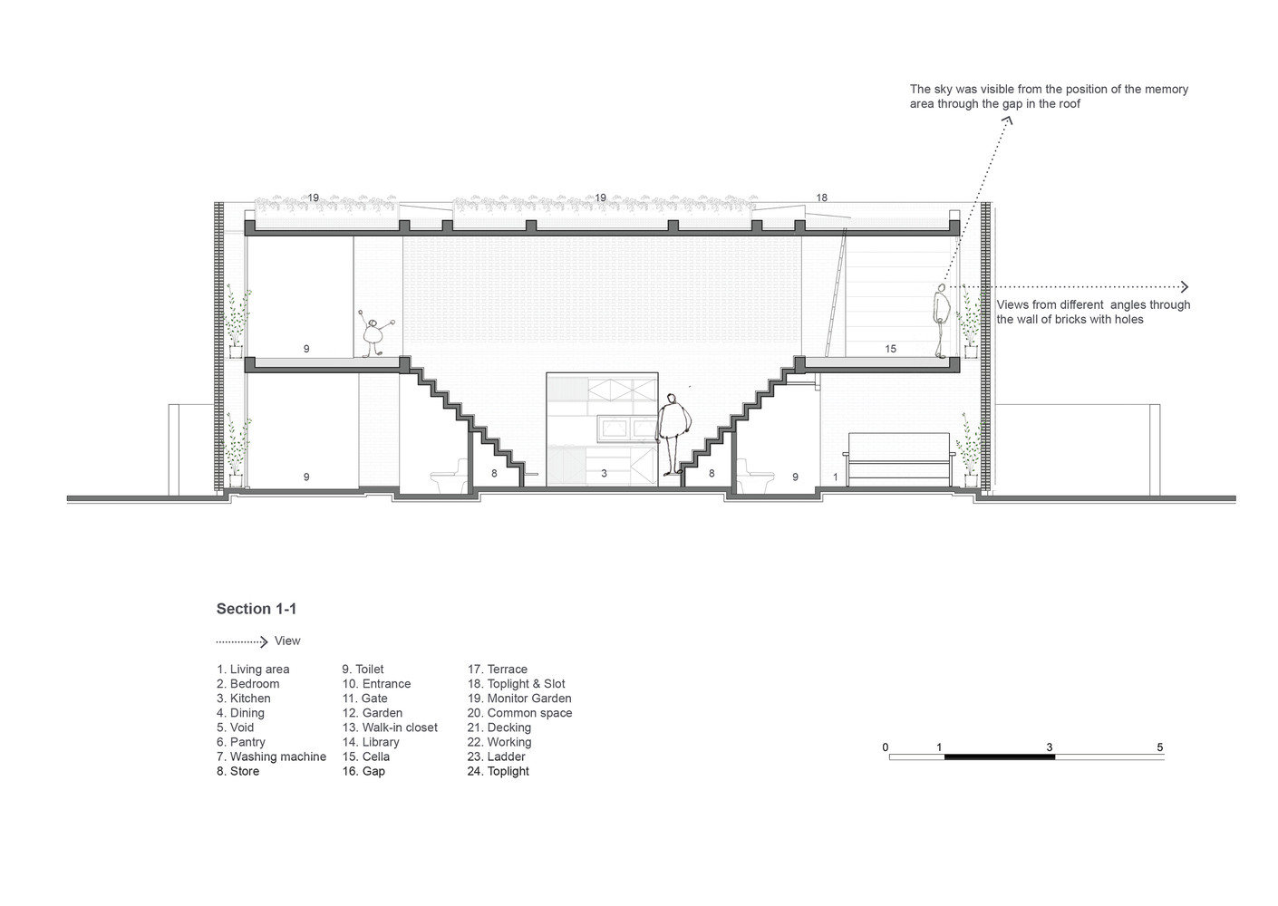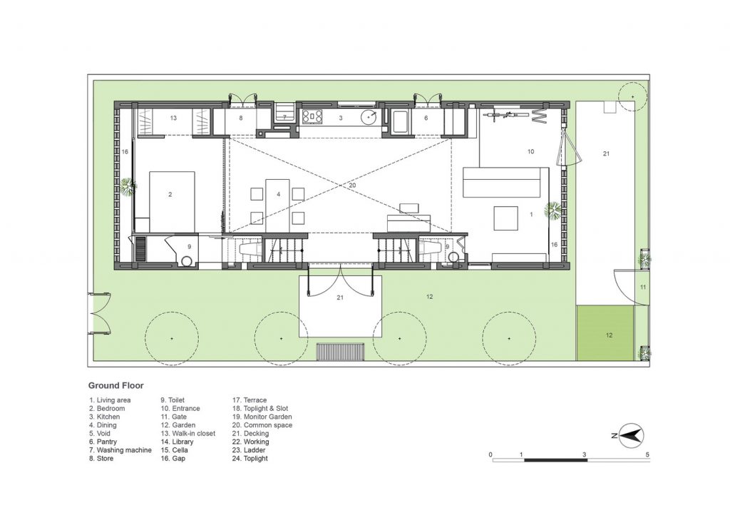 Thiết kế đặc biệt của những bức tường gạch nung với nhiều lỗ hổng cùng với khoảng thông tầng rộng lớn giúp gió và ánh sáng len lỏi đến mọi ngóc ngách trong nhà, ngay cả những khu vực khó tiếp cận nhất. Chủ nhân ngôi nhà cũng có thể tận hưởng bầu trời trong xanh vào ban ngày hoặc ánh trăng vào ban đêm từ phòng khách, bàn ăn hay nhà bếp.