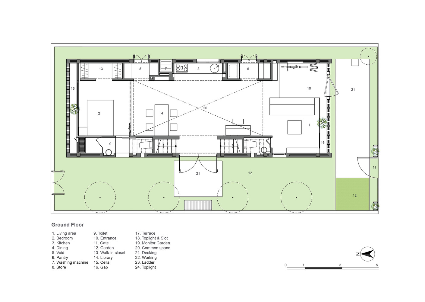 Cả sân và vườn đều được trải sỏi thô với một số cây trồng (được sắp xếp lại) từ ngôi nhà cũ để giữ lại một số nét quen thuộc cho chủ nhân. Việc tận dụng tối đa hệ thống thông gió, chiếu sáng và cơ chế điều hòa không khí tự nhiên đã khiến The Termitary House tối ưu hóa những yếu tố tích cực của một công trình nhiệt đới hiệu quả.