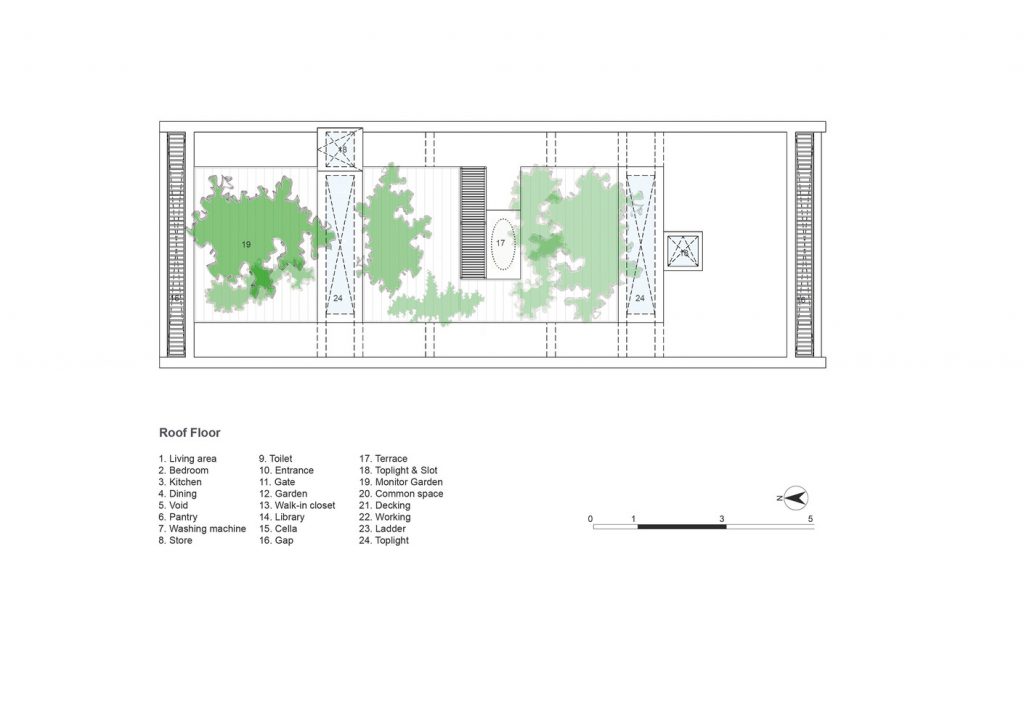 Tầng áp mái là khu vực thư giãn mở với rèm che bằng dây leo. Được thiết kế cho ba người ở nên ngôi nhà không cần nhiều vách ngăn ngoại trừ vách ngăn phòng thờ và các phòng ngủ. Trong khi đó, tại các khu vực chung trong nhà, các thành viên trong gia đình vẫn có thể nhìn thấy và trò chuyện với nhau qua các bức tường có lỗ được bố trí ngẫu nhiên nhưng khoa học giống như trong một tổ mối thực thụ.