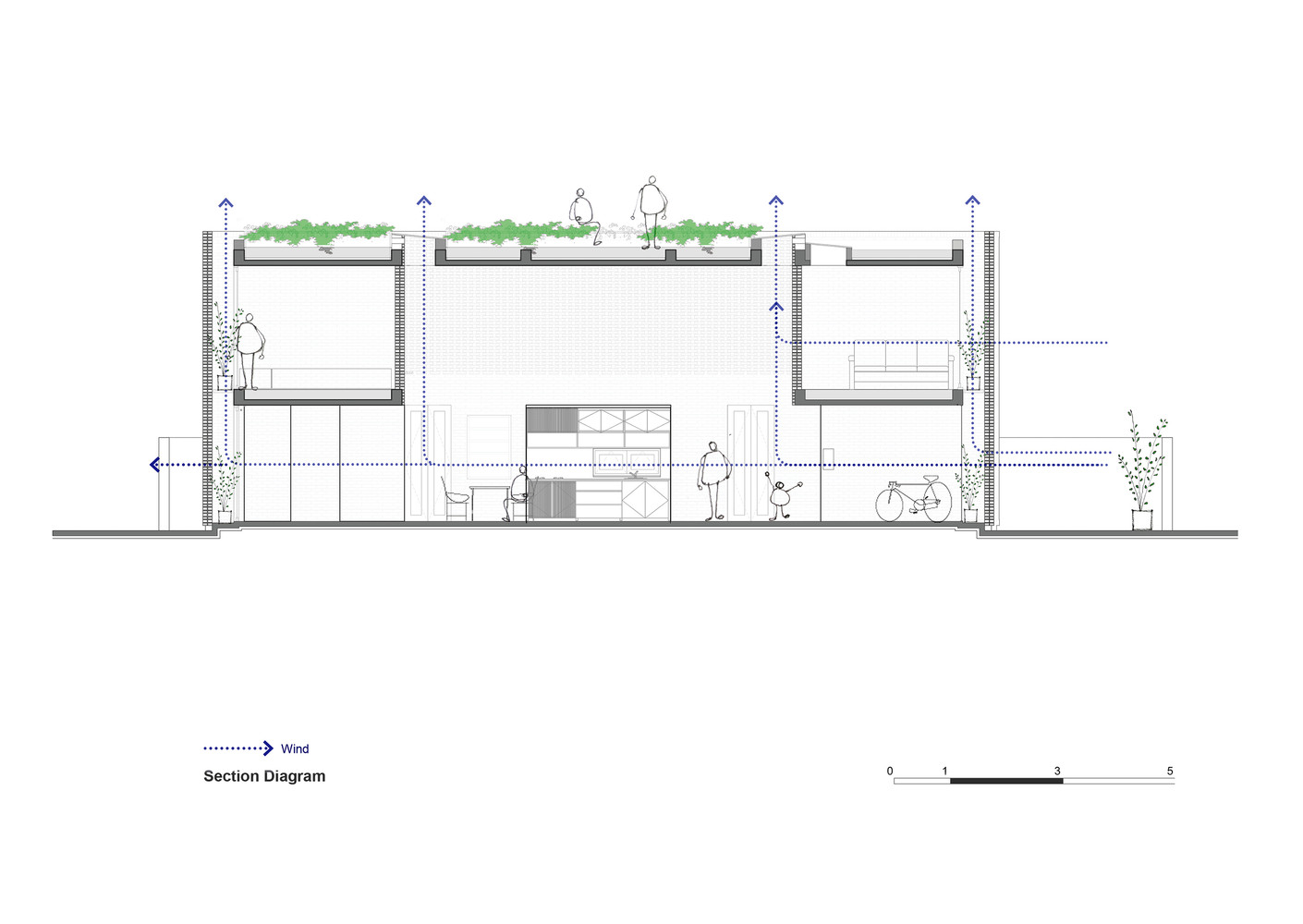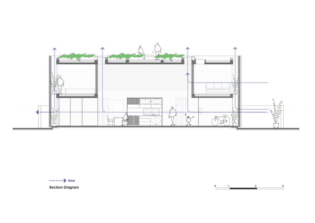 Tường được xây hoàn toàn bằng gạch nung giúp ngôi nhà mát mẻ vào mùa hè. Loại gạch này còn có thể đảm nhiệm chức năng giữ độ ẩm nhất định cho toàn bộ ngôi nhà. Bên cạnh đó, việc bố trí các khu vệ sinh và kho chứa đồ dọc theo các bức tường không chỉ giúp chắn gió mạnh trong mùa mưa bão mà còn có thể dẫn chúng đi qua các khe hở thẳng lên mái nhà. Điều này là do sự khác biệt đáng kể về áp suất. Trên tầng mái, kiến ​​trúc sư sử dụng hệ thống dầm và thông tầng ngược tạo thành khu vườn nhỏ trồng cây – nơi lý tưởng để cả gia đình thư giãn, hóng gió trong những ngày hè oi bức.