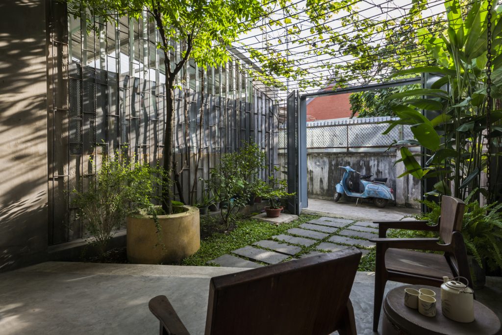 Nhóm KTS thiết kế duy nhất một cửa chính để thông vào nhà. Ngôi nhà như một sự kết nối liền mạch, không có giới hạn giữa nhà và vườn – tạo cảm giác tự do. Các kệ sắt được sử dụng như một cách định vị giữa phòng khách và hiên nhà nhưng không làm mất đi sự thông thoáng.