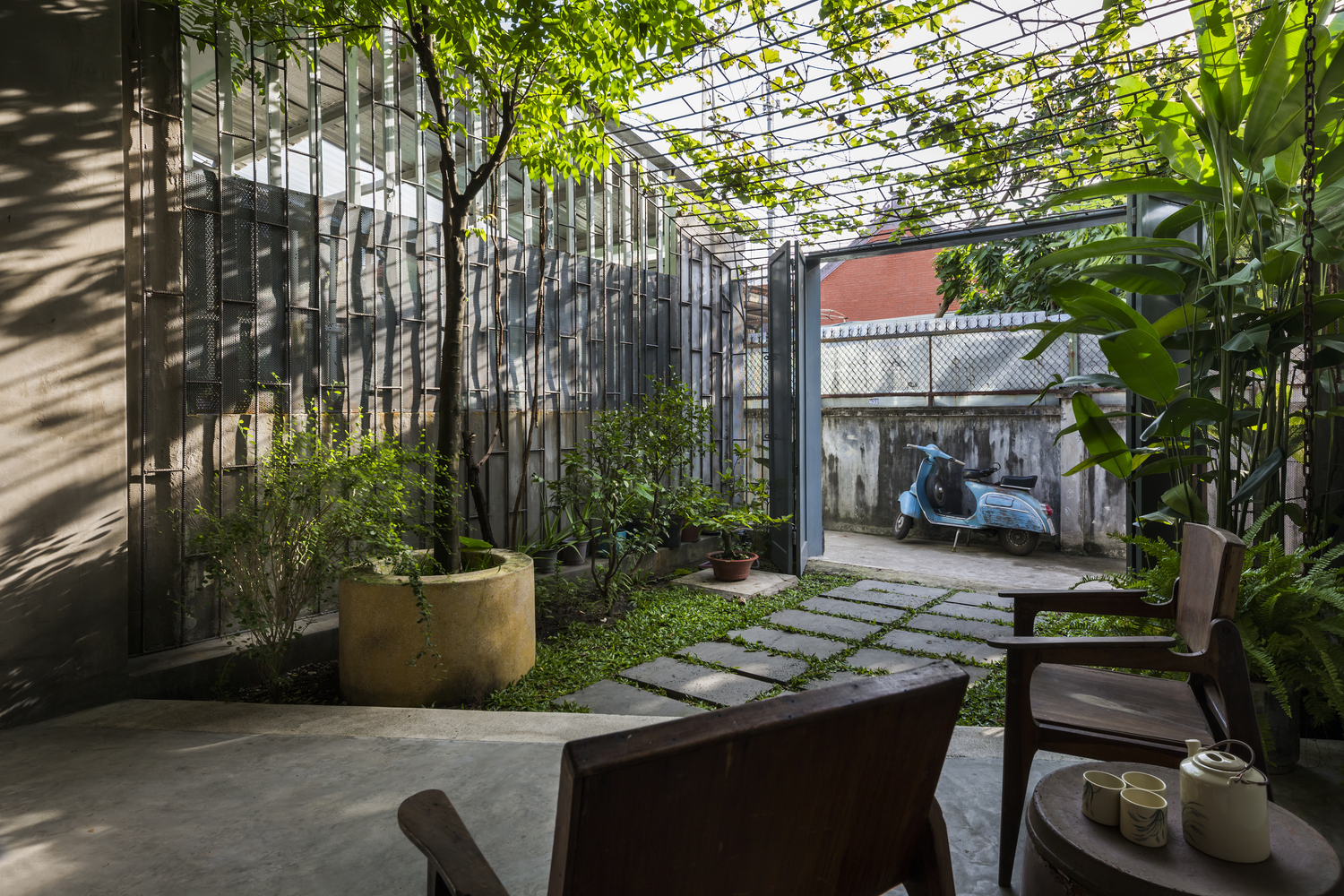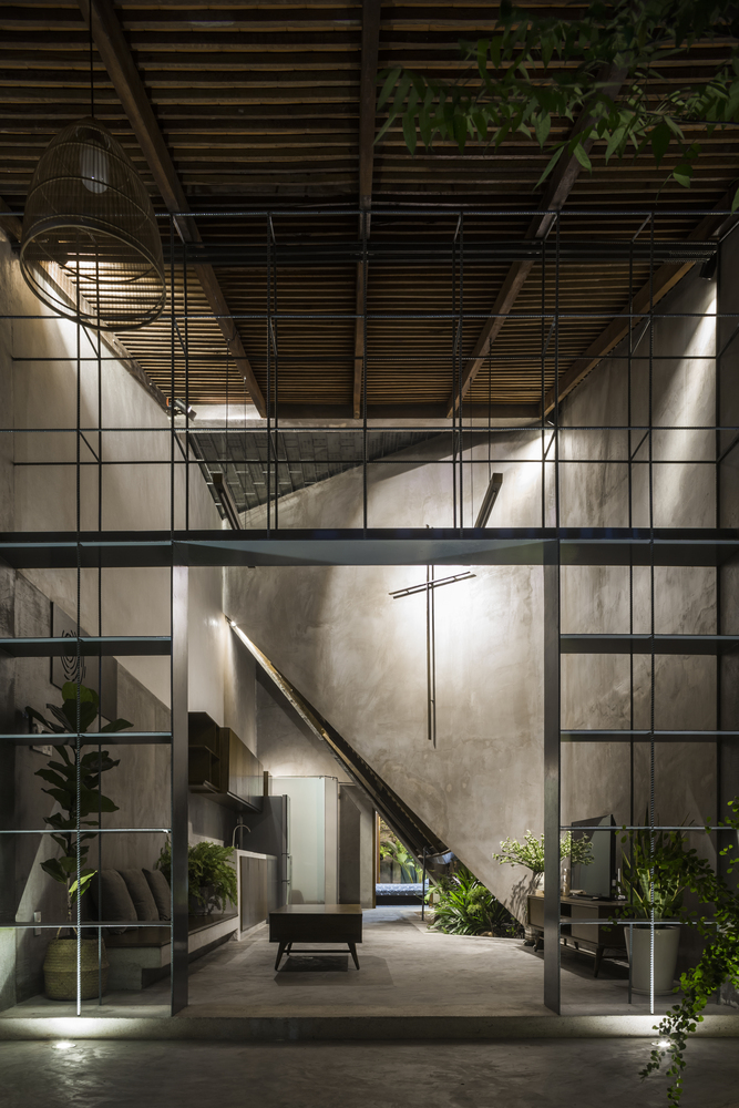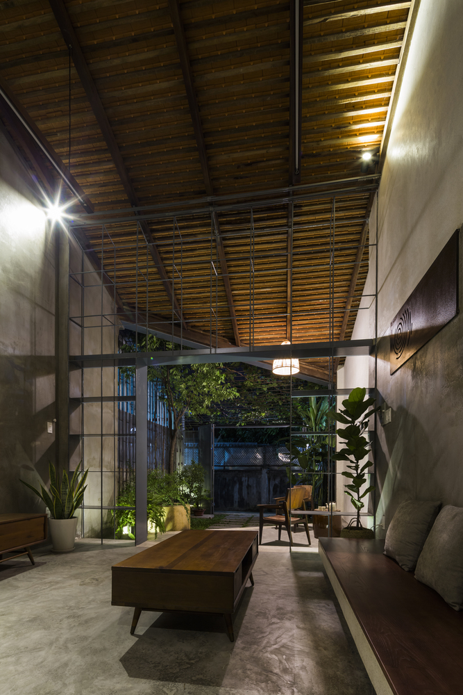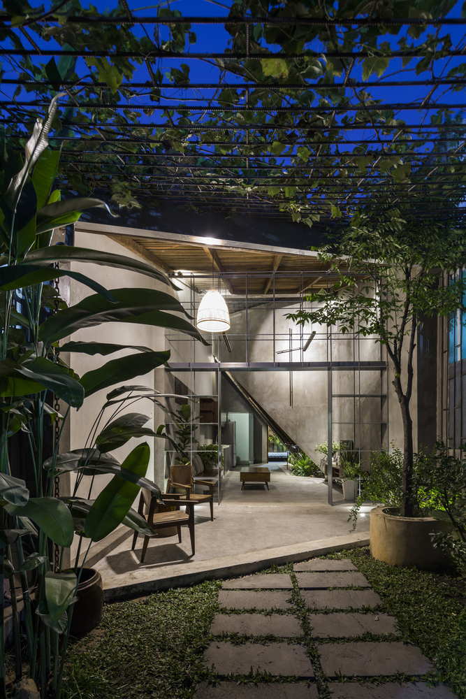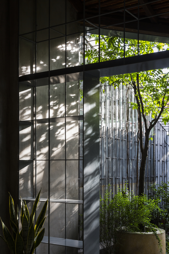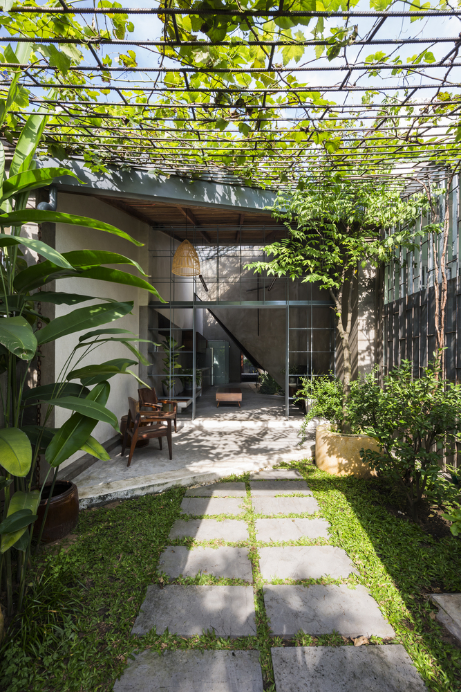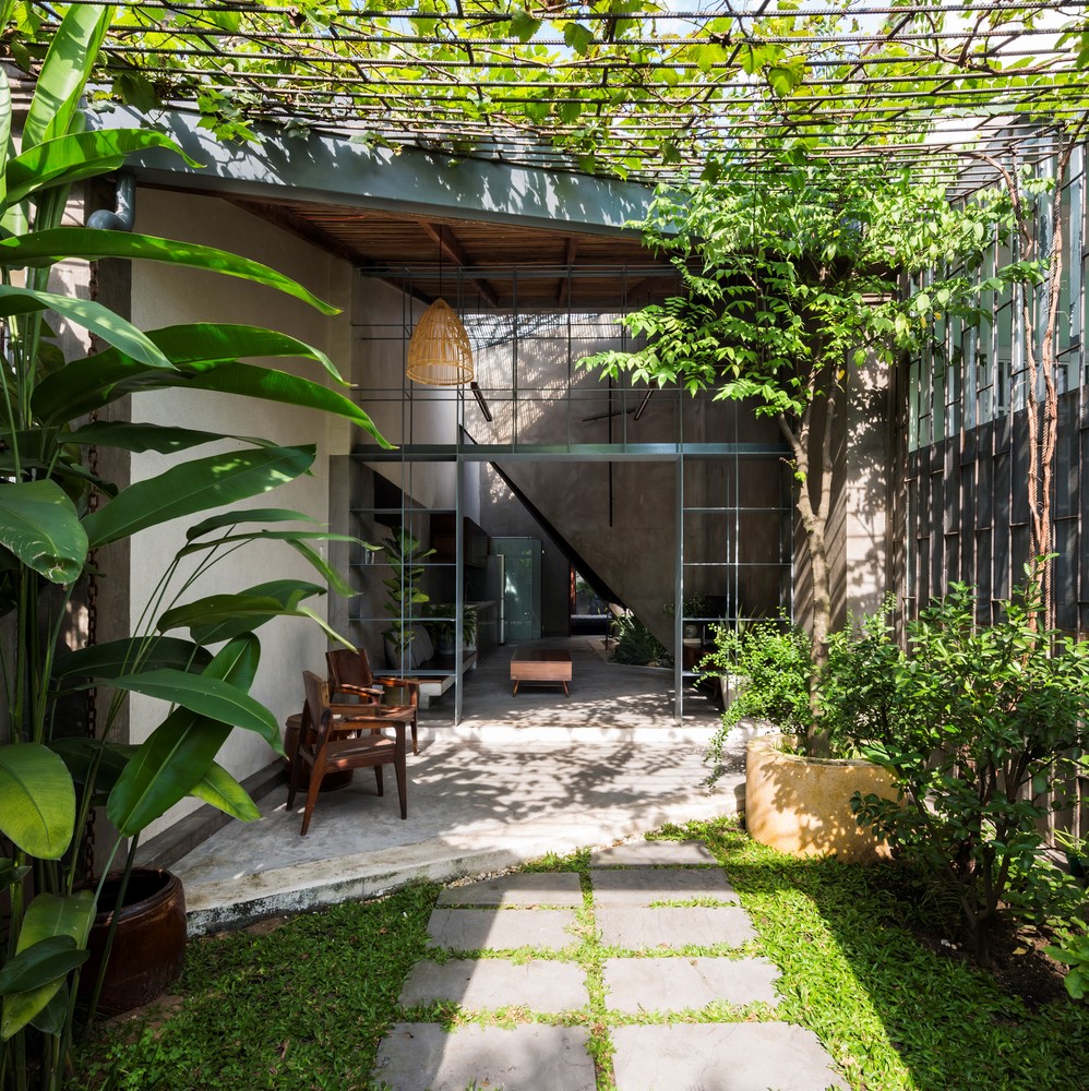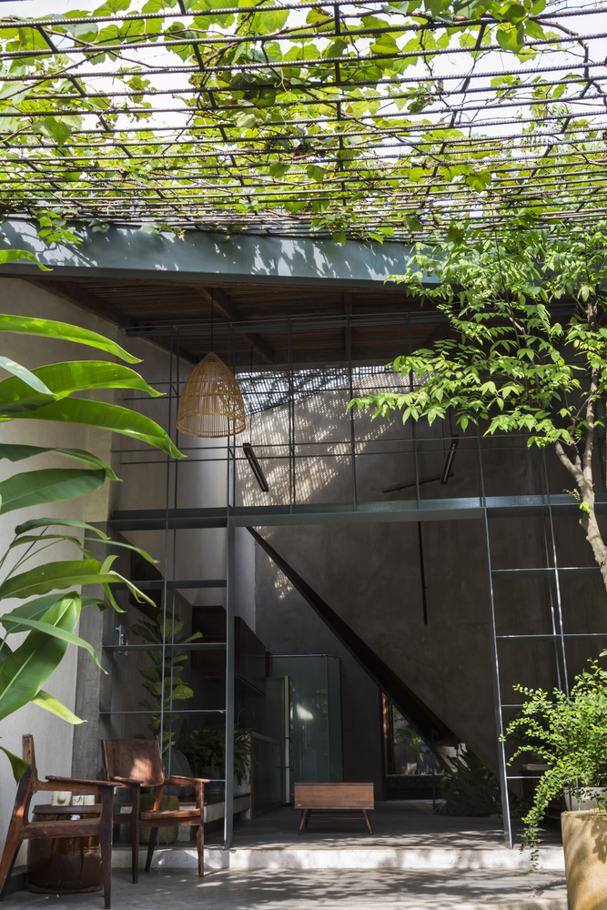 Nhóm KTS thiết kế duy nhất một cửa chính để thông vào nhà. Ngôi nhà như một sự kết nối liền mạch, không có giới hạn giữa nhà và vườn – tạo cảm giác tự do. Các kệ sắt được sử dụng như một cách định vị giữa phòng khách và hiên nhà nhưng không làm mất đi sự thông thoáng.