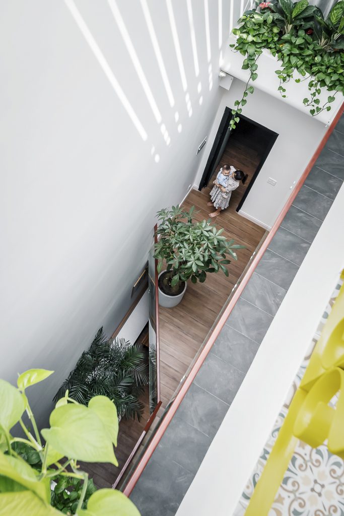 Story Architecture thiết kế không gian thông tầng là khe hẹp nằm dài. Lấy ánh sáng chính giữa và phía sau làm cho các phòng đều lấy được gió và ánh sáng tự nhiên, tạo được sự kết nối ở các tầng mà không cần phải di chuyển hay dùng điện thoại liên lạc.