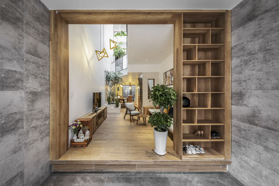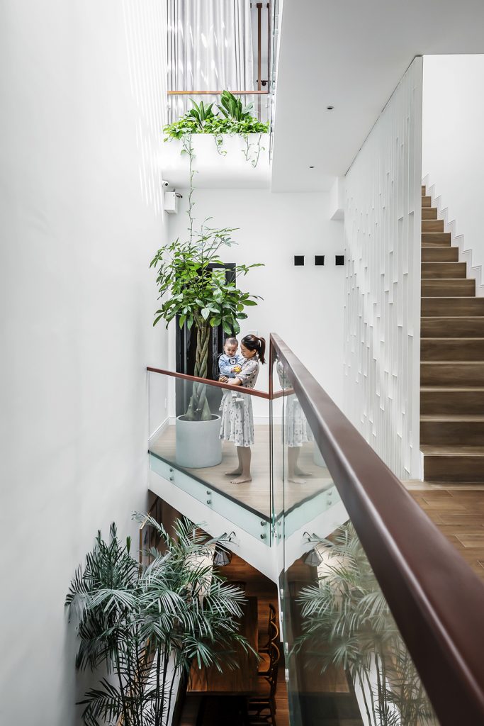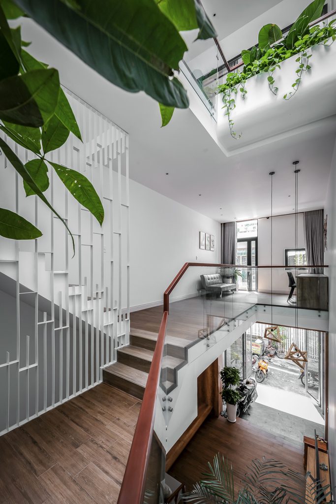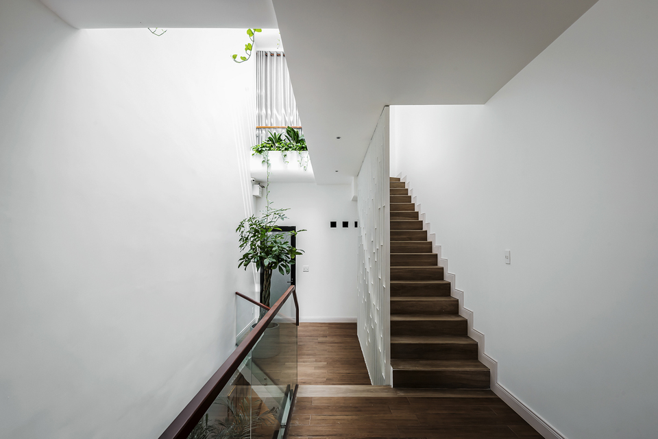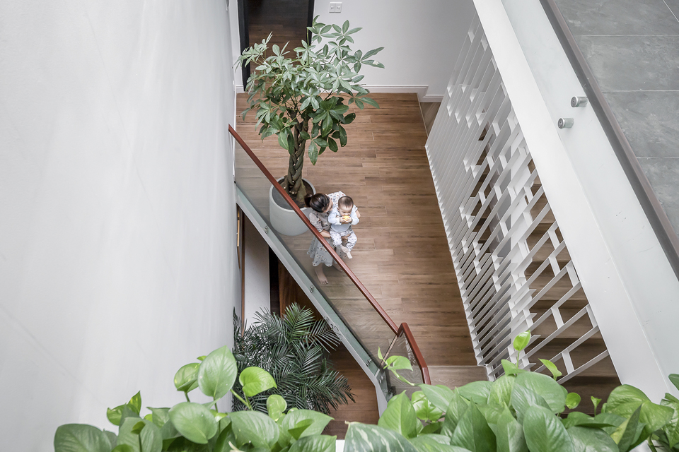 Story Architecture thiết kế không gian thông tầng là khe hẹp nằm dài. Lấy ánh sáng chính giữa và phía sau làm cho các phòng đều lấy được gió và ánh sáng tự nhiên, tạo được sự kết nối ở các tầng mà không cần phải di chuyển hay dùng điện thoại liên lạc.