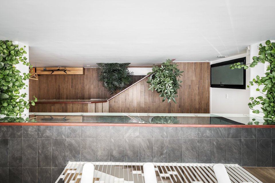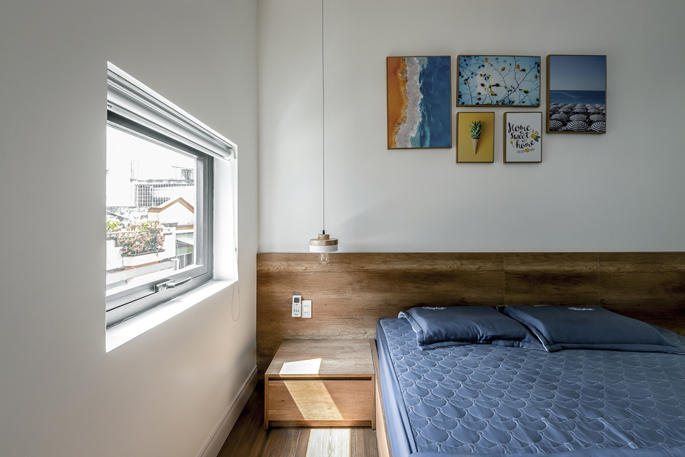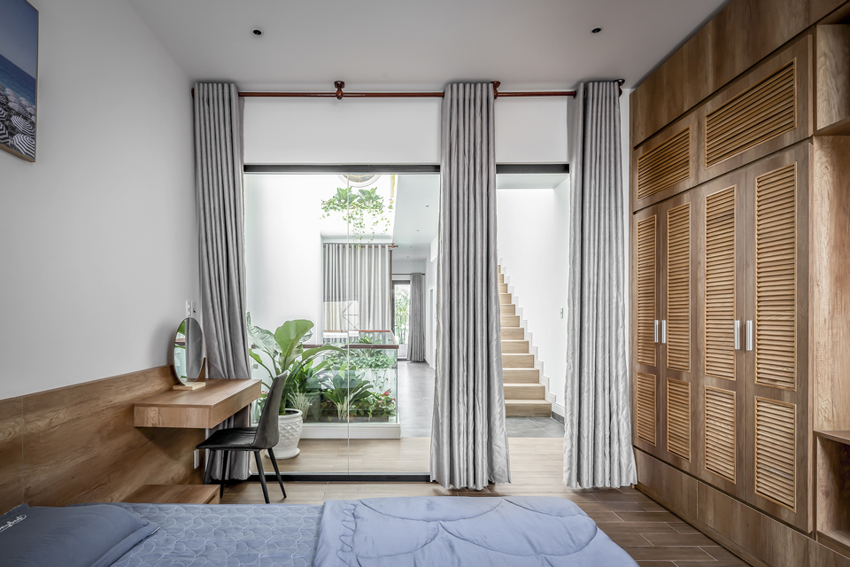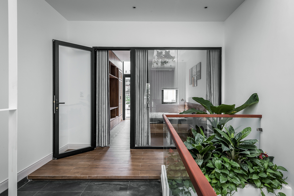 Cửa phòng ngủ bên trong nhà dùng nhiều mảng kính để tạo thành vách ngăn xốp rỗng làm tăng hiệu ứng cảm giác rộng rãi cho ngôi nhà. Việc giải phóng nhiều vách ngăn, hy sinh nhiều diện tích làm thông tầng và không gian chơi thư giãn đã làm cho ngôi nhà nhỏ trở nên thú vị và gia chủ muốn về nhà mỗi khi tan ca.